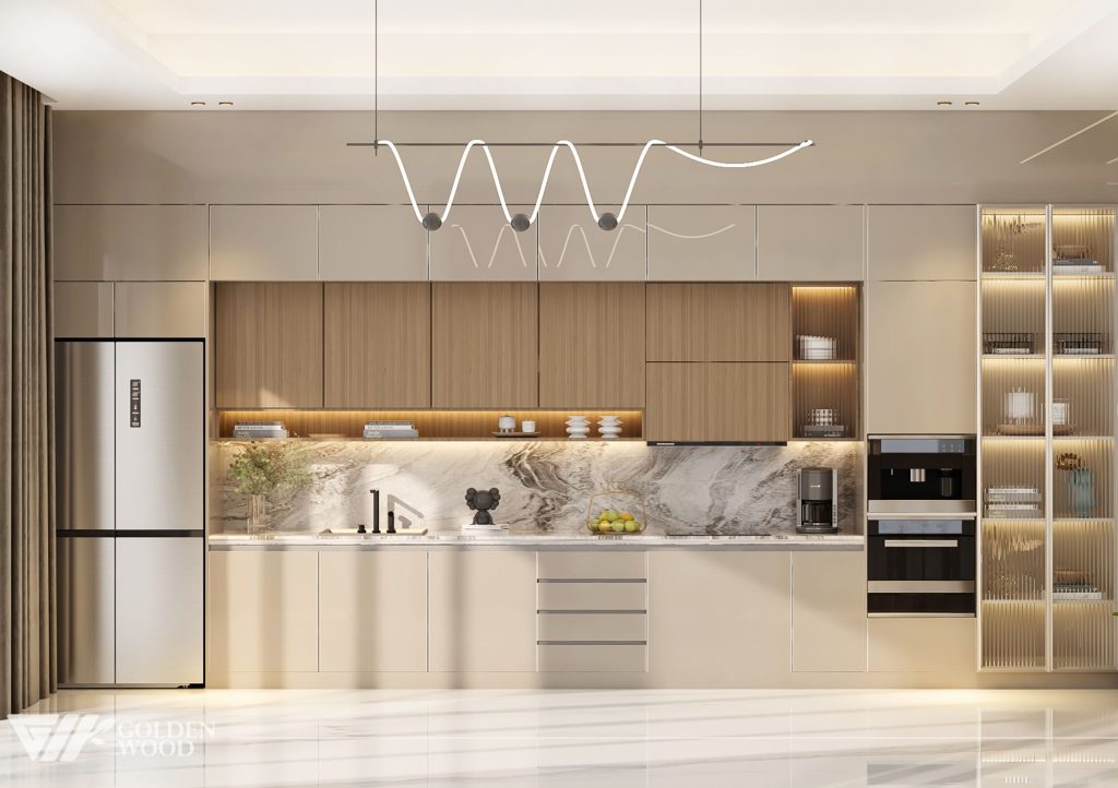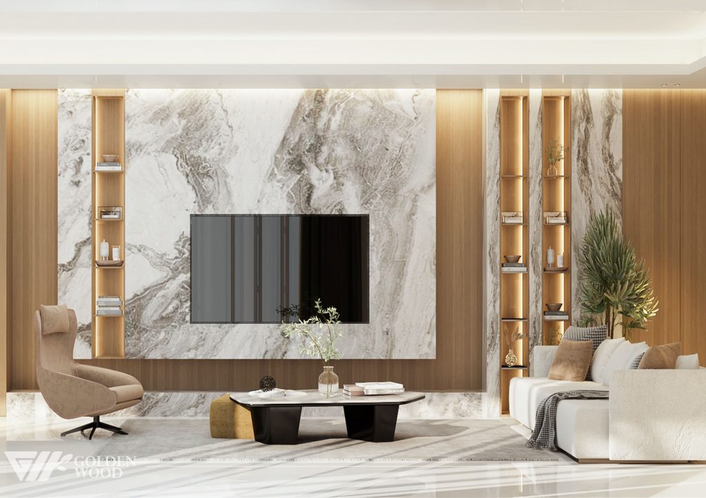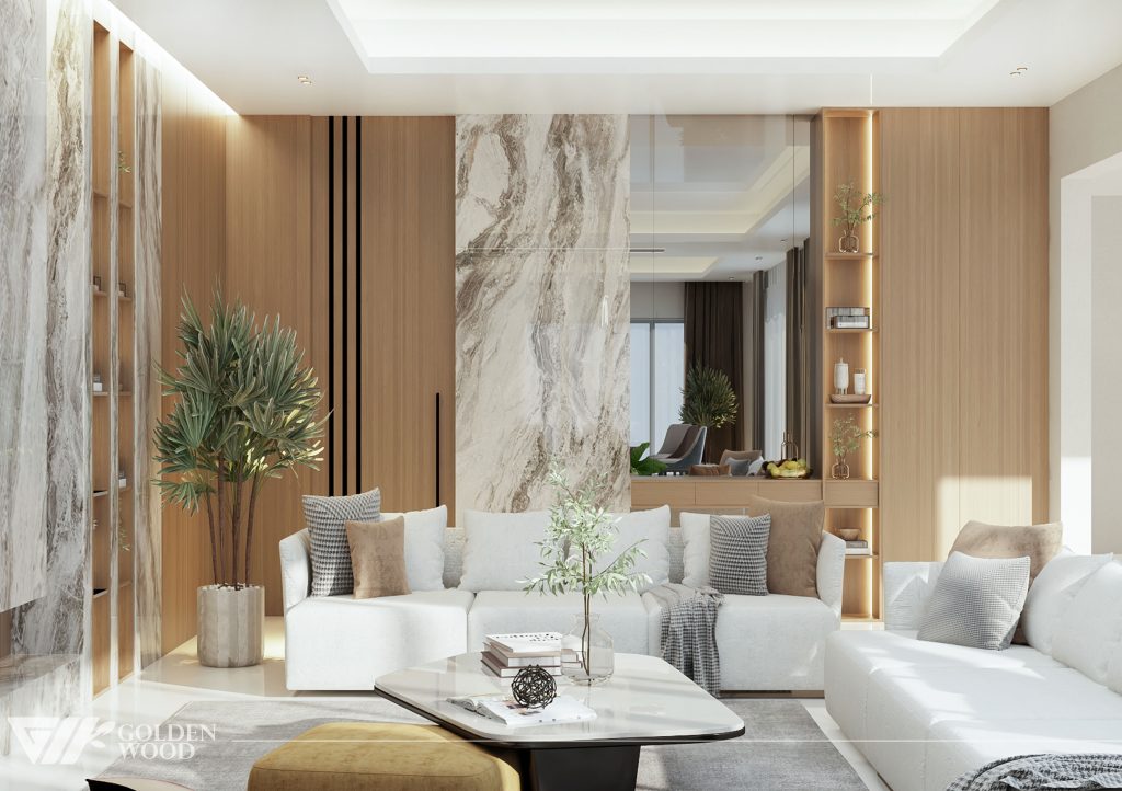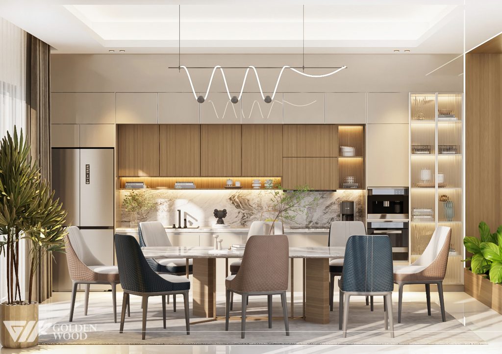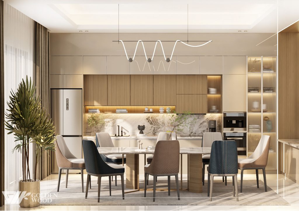 Serene Elegance Residence is a refined modern home that balances luxury and warmth through its seamless open-plan design. The interior features a sophisticated palette of natural wood, marble accents, and soft neutral tones, creating an atmosphere of calm sophistication. Every element—from the sculptural lighting to the sleek cabinetry and cozy furnishings—reflects understated opulence. Accented by greenery and natural light, this residence embodies the essence of contemporary living with timeless appeal.