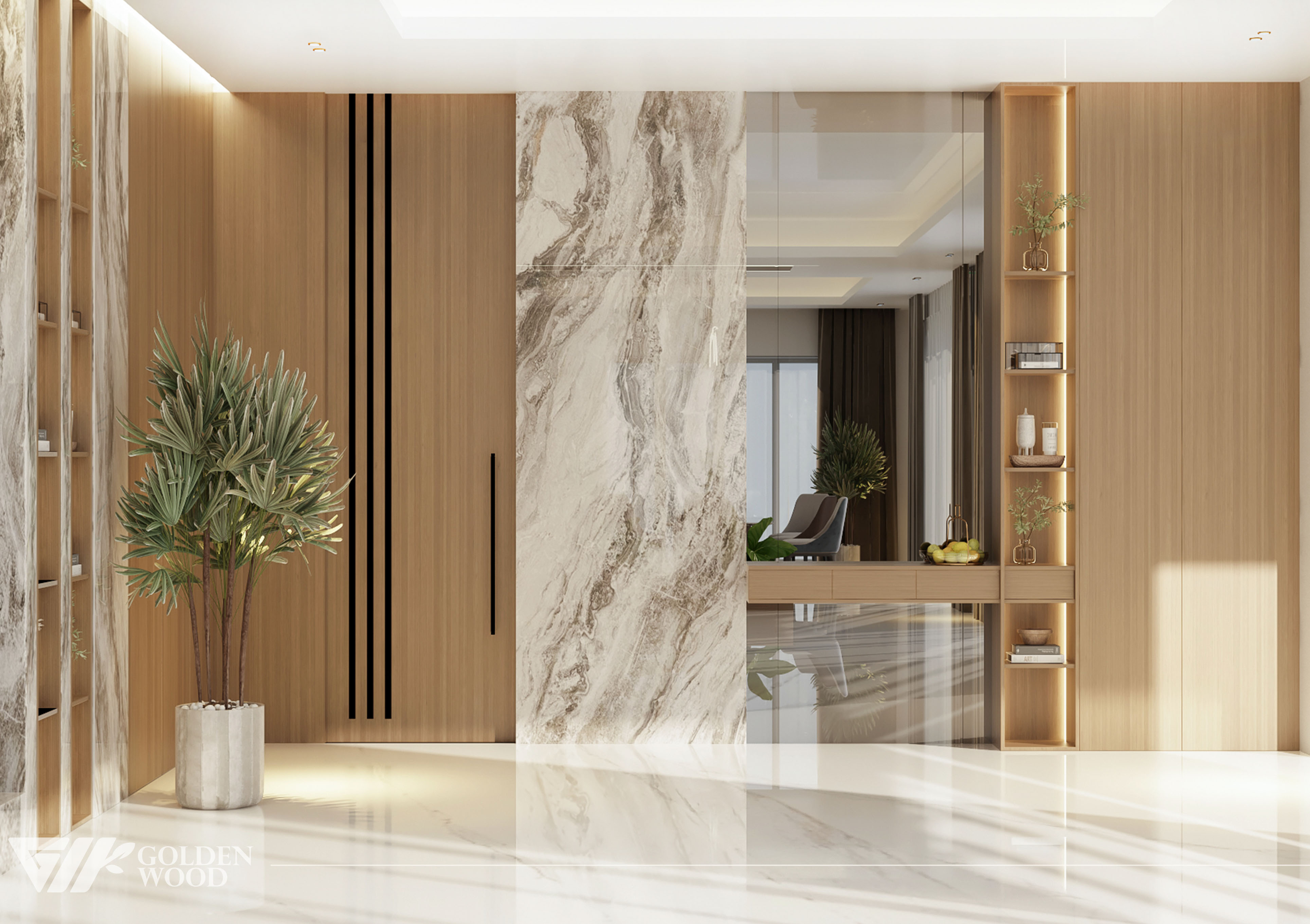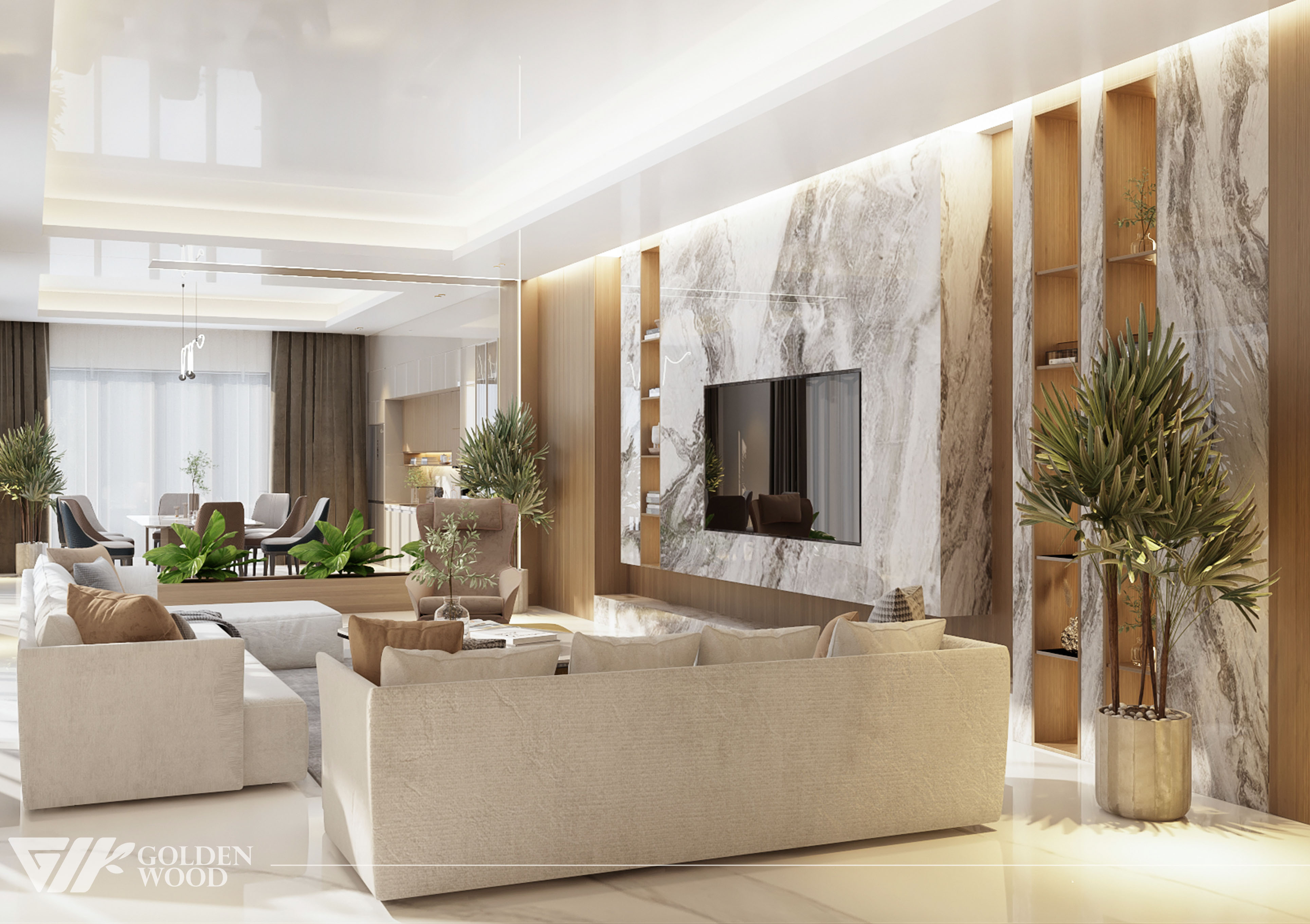 Serene Elegance Residence is a refined modern home that balances luxury and warmth through its seamless open-plan design. The interior features a sophisticated palette of natural wood, marble accents, and soft neutral tones, creating an atmosphere of calm sophistication. Every element—from the sculptural lighting to the sleek cabinetry and cozy furnishings—reflects understated opulence. Accented by greenery and natural light, this residence embodies the essence of contemporary living with timeless appeal.