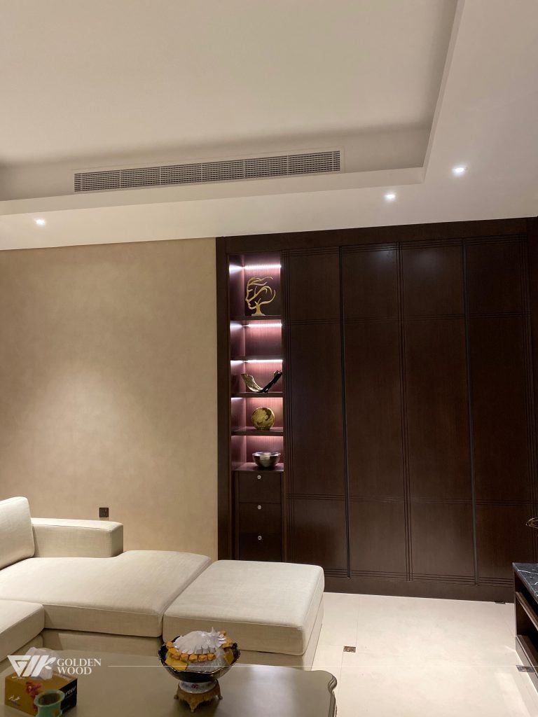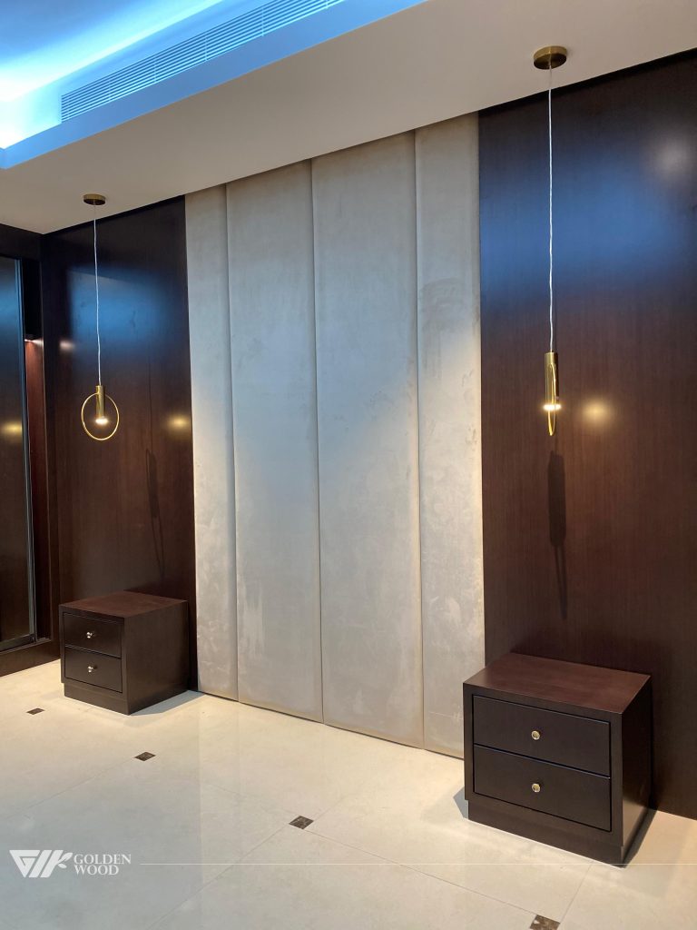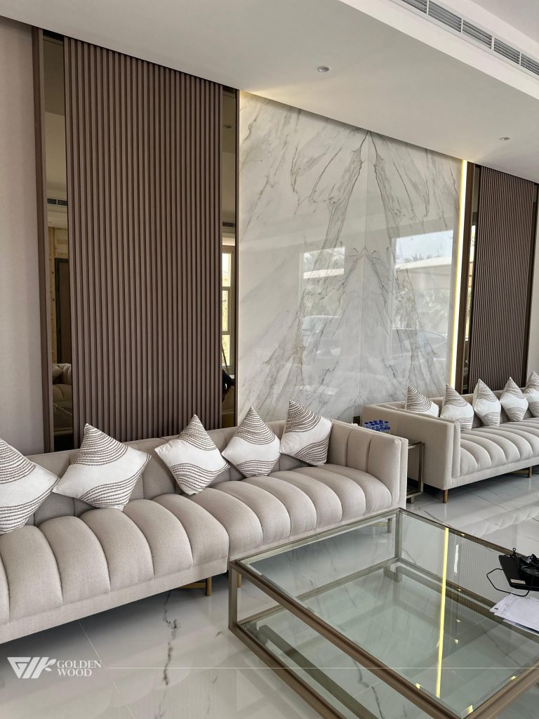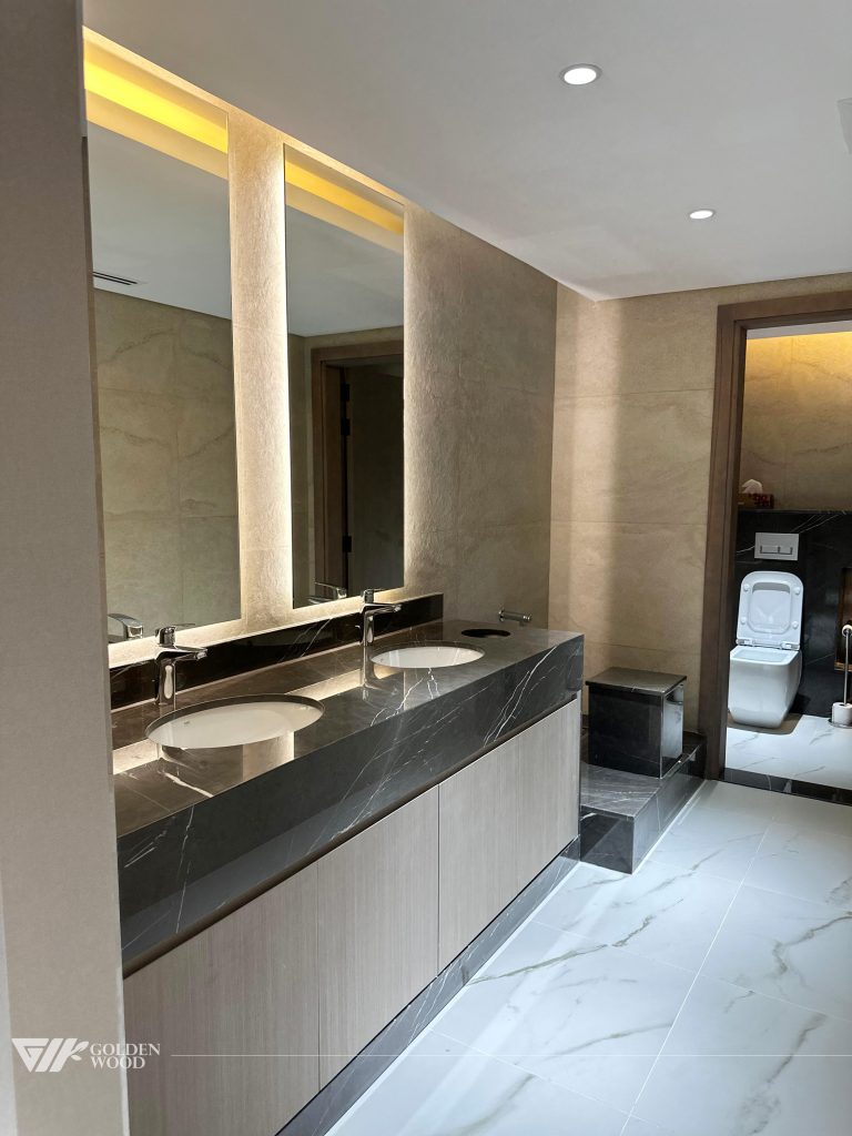 GW23-214 Marwa Villa by Golden Wood exemplifies modern elegance and timeless luxury. Featuring sleek, marble-clad walls and sophisticated wooden elements, the villa blends contemporary design with comfort. The open living spaces are enhanced by soft tones, plush seating, and thoughtful lighting, creating a serene and inviting atmosphere. Custom cabinetry and mirrored elements add to the villa’s refined aesthetic, while the seamless integration of luxurious finishes throughout the home showcases Golden Wood’s impeccable craftsmanship. Every detail, from the stylish bathrooms to the spacious living areas, speaks to a harmonious balance of function and beauty.