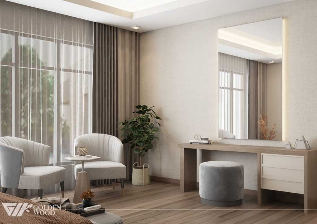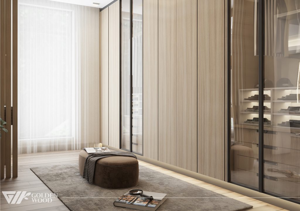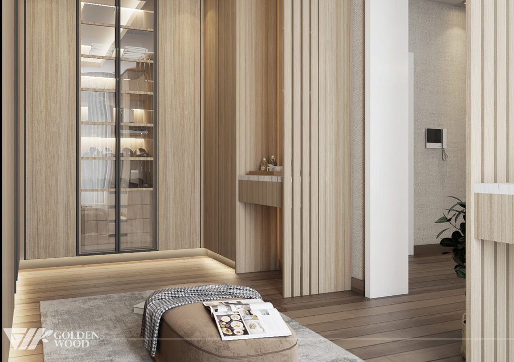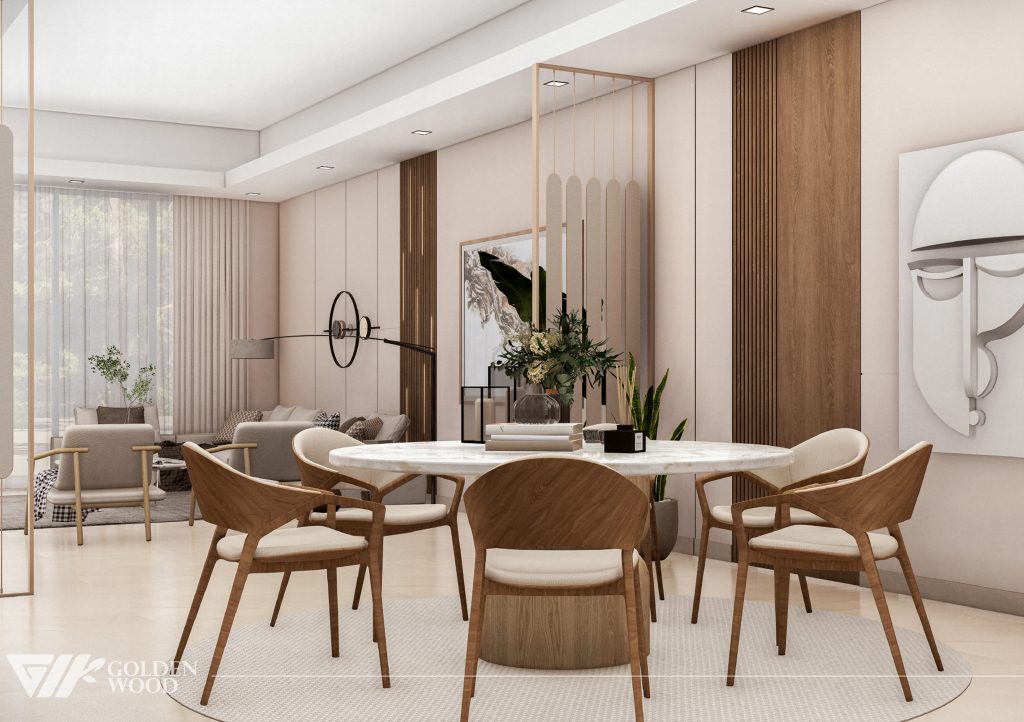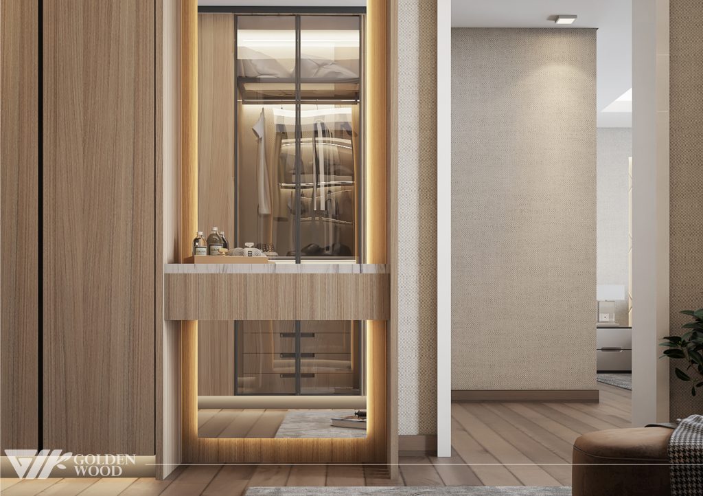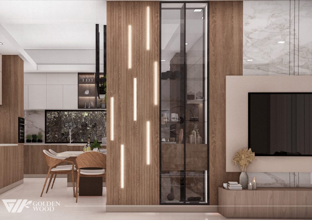 This project features a modern and elegant interior design with a focus on functionality and luxury. The kitchen combines sleek wood finishes and marble countertops, while the living room boasts soft tones and contemporary furnishings. The walk-in closet is a sophisticated, organized space with glass-front storage and ambient lighting. The design balances minimalism with comfort, creating a refined and inviting atmosphere throughout.
