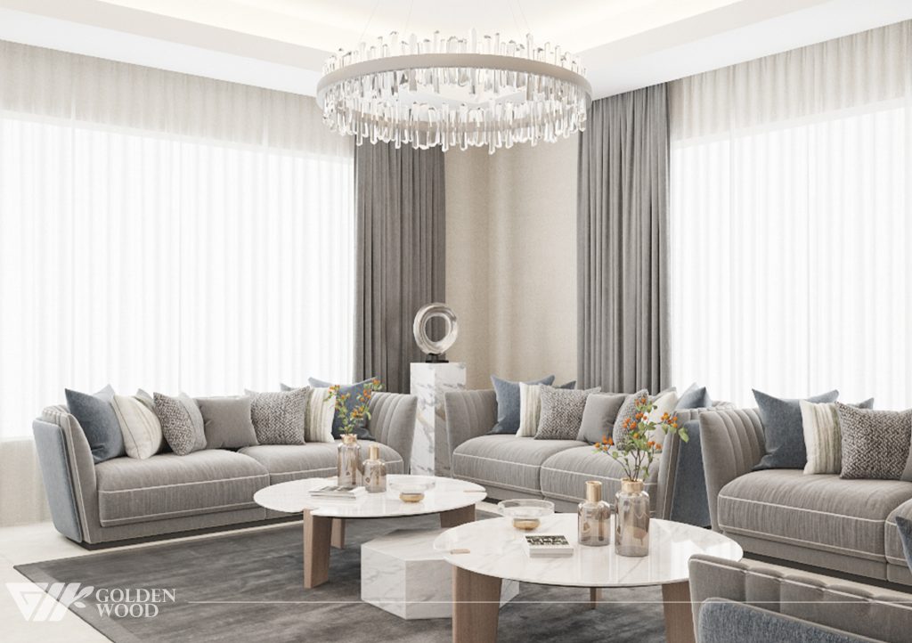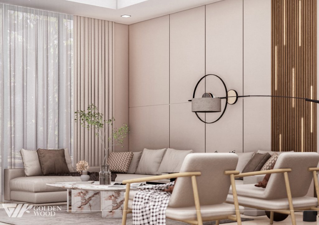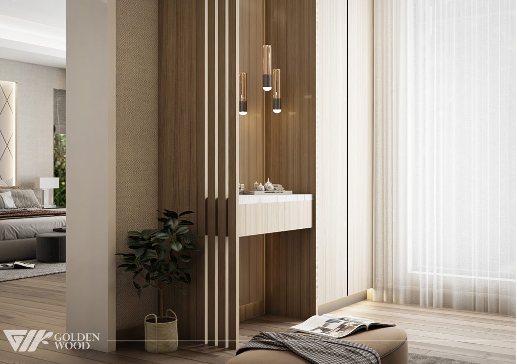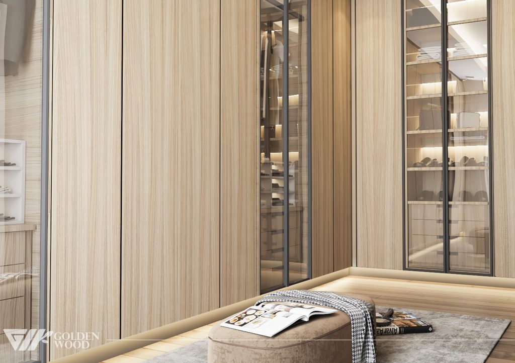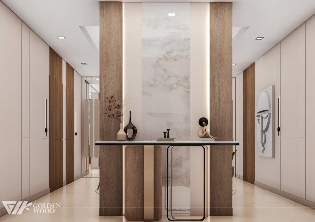 This project features a modern and elegant interior design with a focus on functionality and luxury. The kitchen combines sleek wood finishes and marble countertops, while the living room boasts soft tones and contemporary furnishings. The walk-in closet is a sophisticated, organized space with glass-front storage and ambient lighting. The design balances minimalism with comfort, creating a refined and inviting atmosphere throughout.