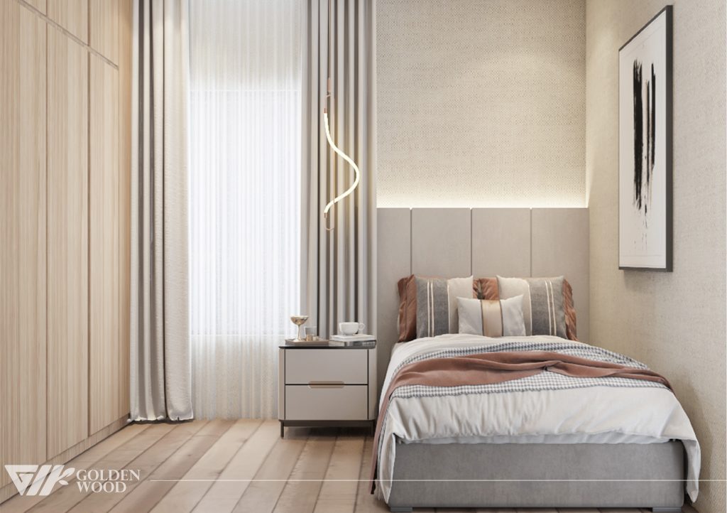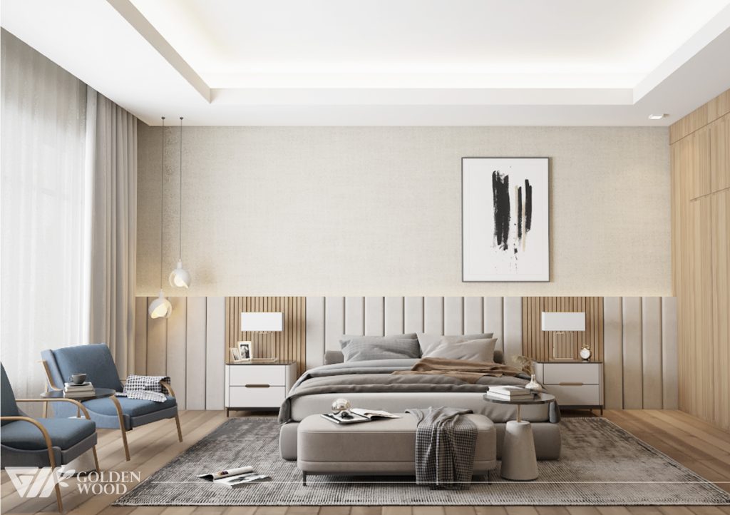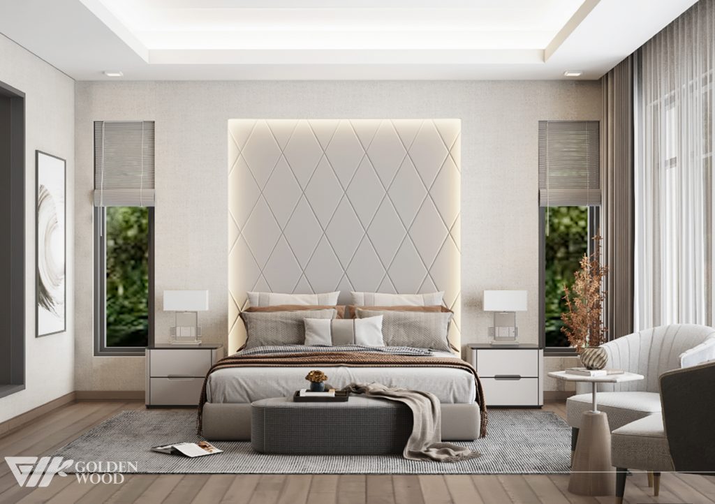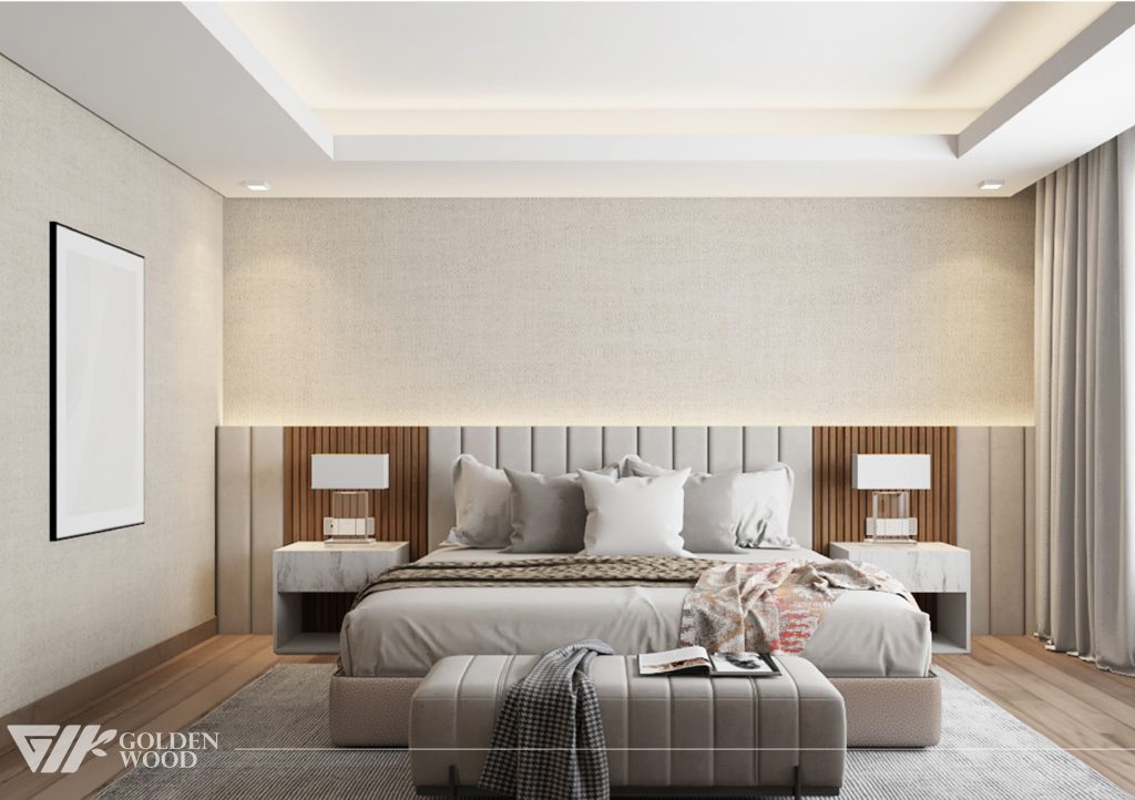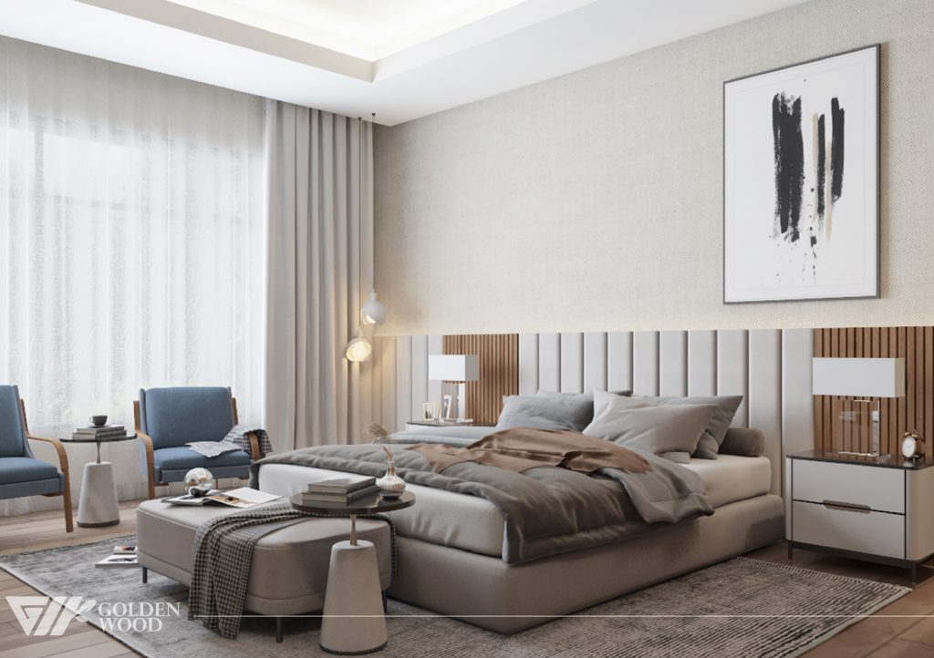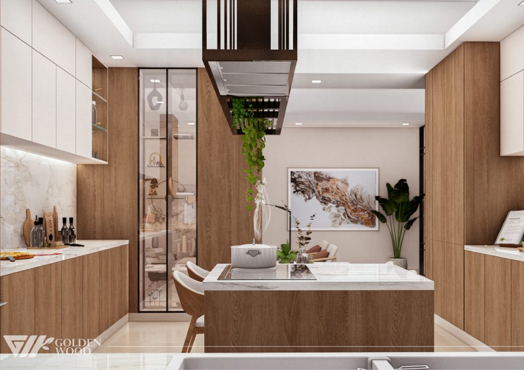This project features a modern and elegant interior design with a focus on functionality and luxury. The kitchen combines sleek wood finishes and marble countertops, while the living room boasts soft tones and contemporary furnishings. The walk-in closet is a sophisticated, organized space with glass-front storage and ambient lighting. The design balances minimalism with comfort, creating a refined and inviting atmosphere throughout.
