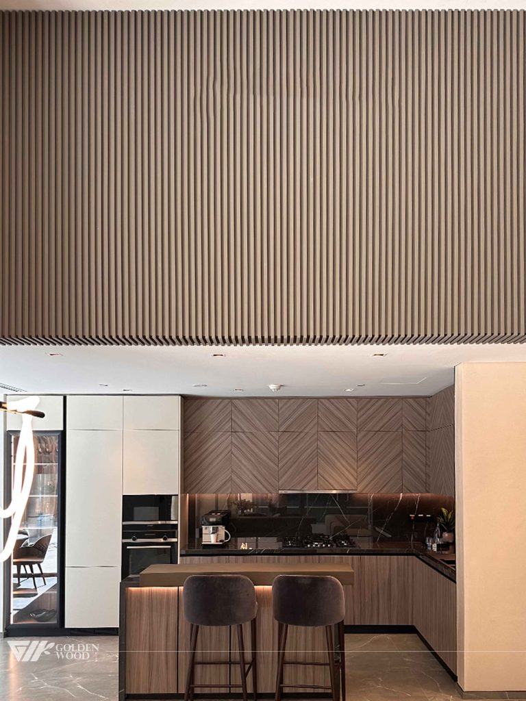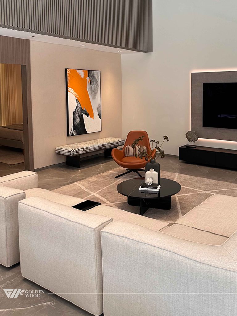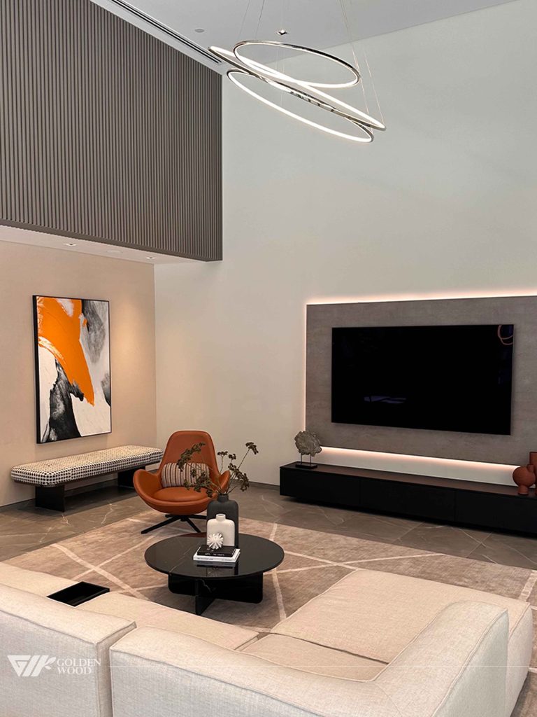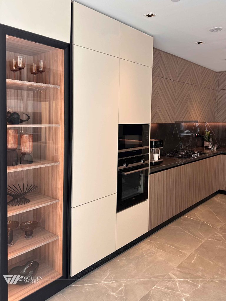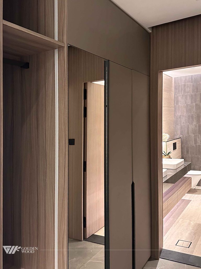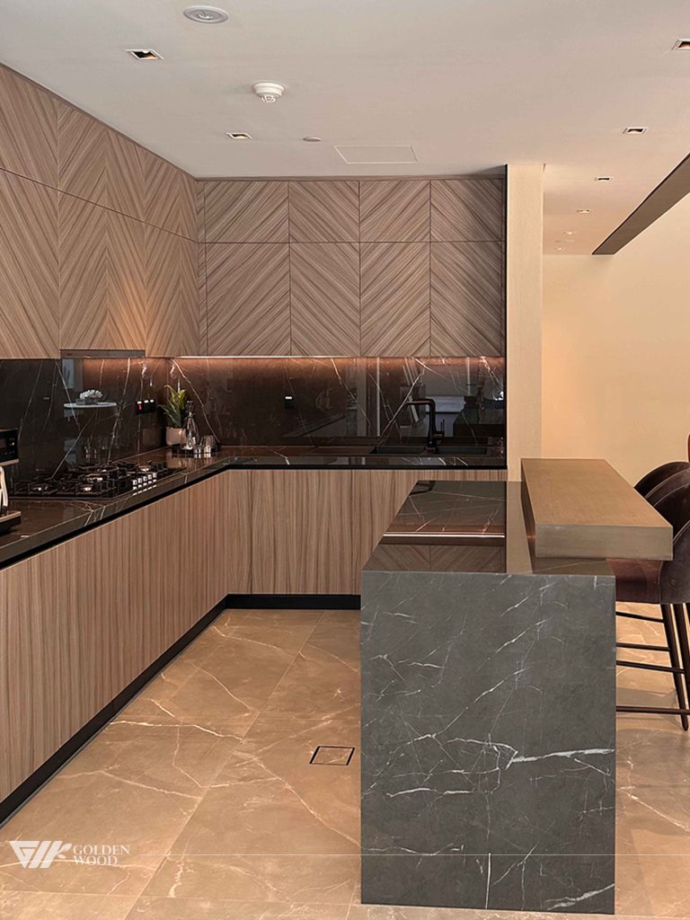 GW23-153 Haven Office by Golden Wood is a sophisticated and modern workspace that blends luxury with functionality. Featuring sleek designs, clean lines, and a minimalist approach, the office exudes elegance and professionalism. The interiors showcase high-end materials like marble, wood, and custom cabinetry, creating a refined atmosphere. Thoughtful lighting and contemporary finishes, including a stylish kitchen and a feature wall with vertical slats, add to the modern vibe. The Haven Office is an ideal space that fosters productivity while providing a comfortable, stylish environment.