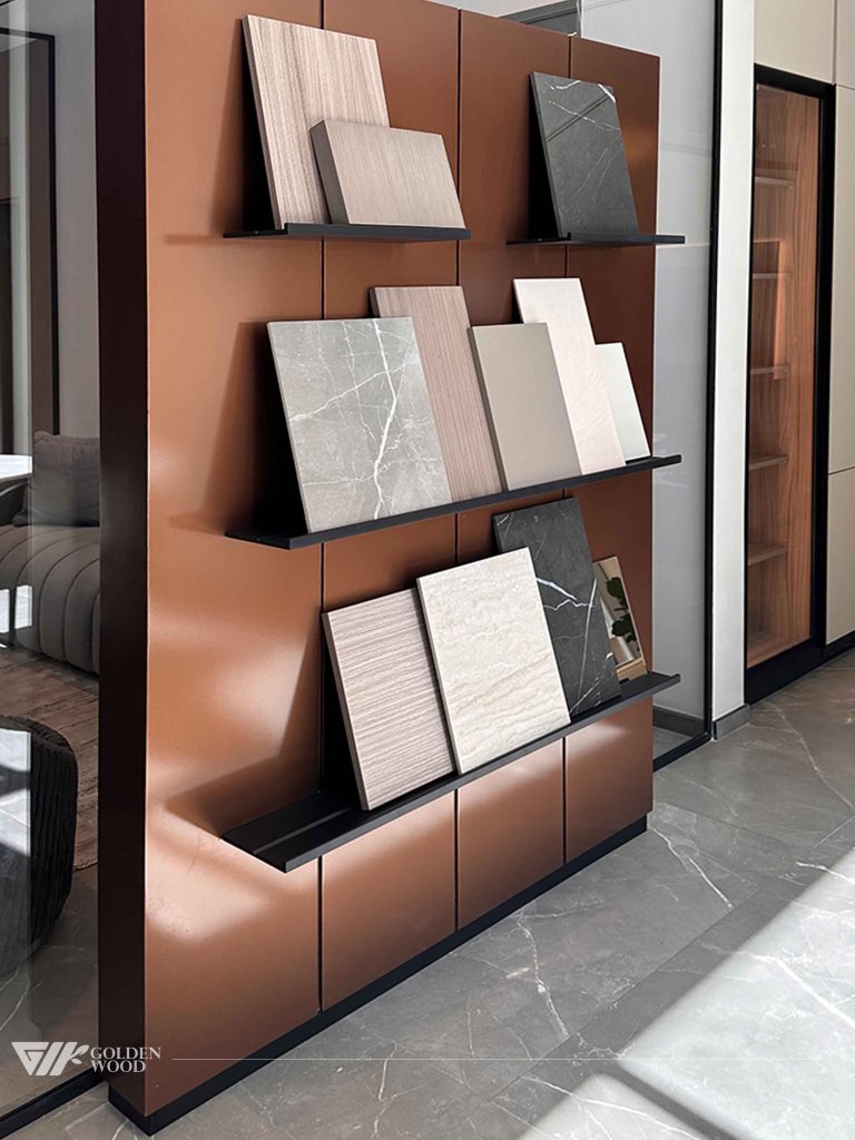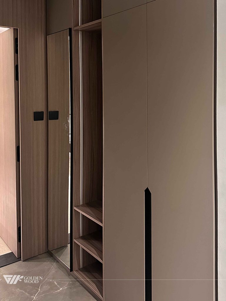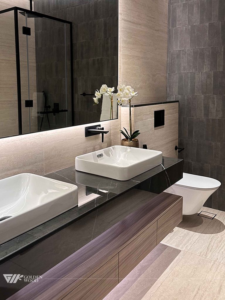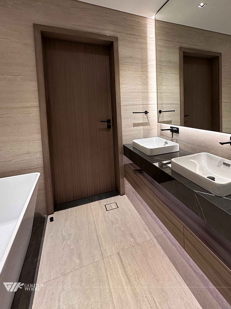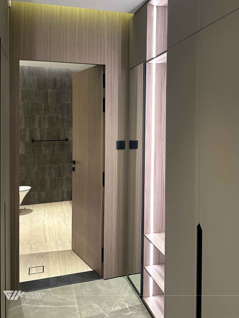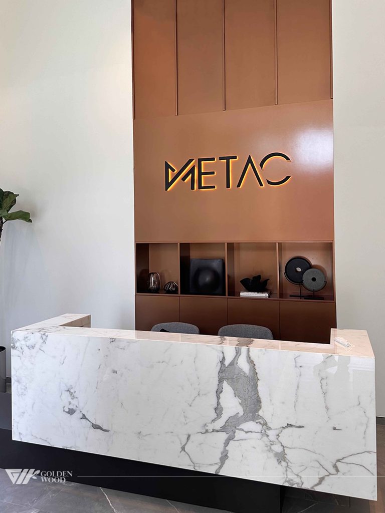 GW23-153 Haven Office by Golden Wood is a sophisticated and modern workspace that blends luxury with functionality. Featuring sleek designs, clean lines, and a minimalist approach, the office exudes elegance and professionalism. The interiors showcase high-end materials like marble, wood, and custom cabinetry, creating a refined atmosphere. Thoughtful lighting and contemporary finishes, including a stylish kitchen and a feature wall with vertical slats, add to the modern vibe. The Haven Office is an ideal space that fosters productivity while providing a comfortable, stylish environment.