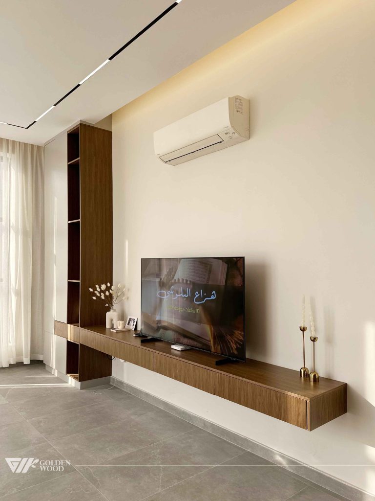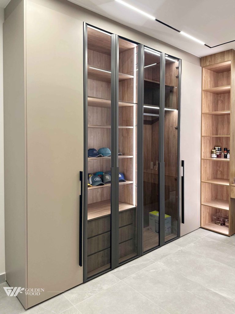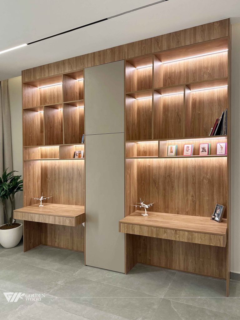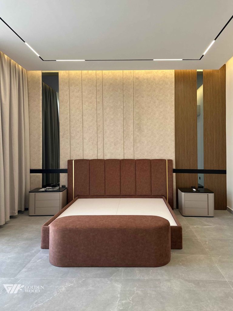 The GW23-111 B3 Villa showcases a sophisticated blend of modern design and natural elegance. The interior features custom woodwork by Golden Wood, characterized by sleek built-in shelving, warm wood finishes, and integrated LED lighting. The bedroom highlights a contemporary upholstered bed with minimalist side tables, set against a backdrop of textured wall panels and ambient lighting. The media area includes a streamlined floating TV unit with clean lines and functional shelving. A luxurious walk-in wardrobe combines matte surfaces with glass doors and internal lighting, offering both style and organization. Overall, the villa balances comfort and aesthetics through high-end craftsmanship and modern design principles.