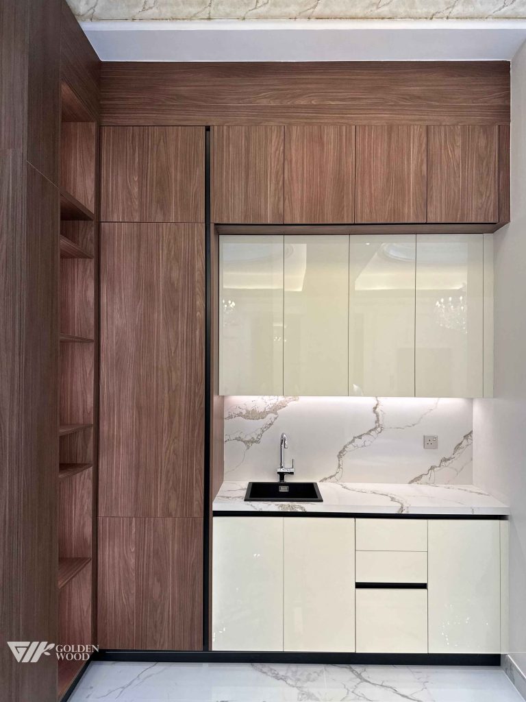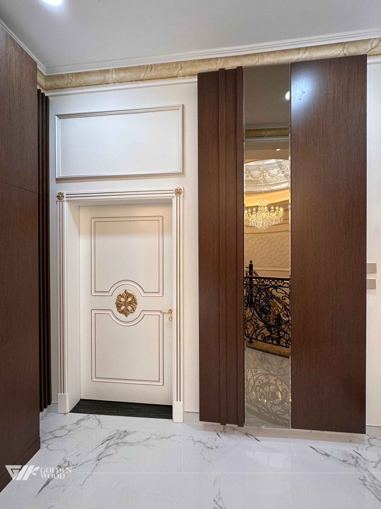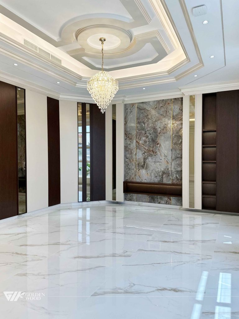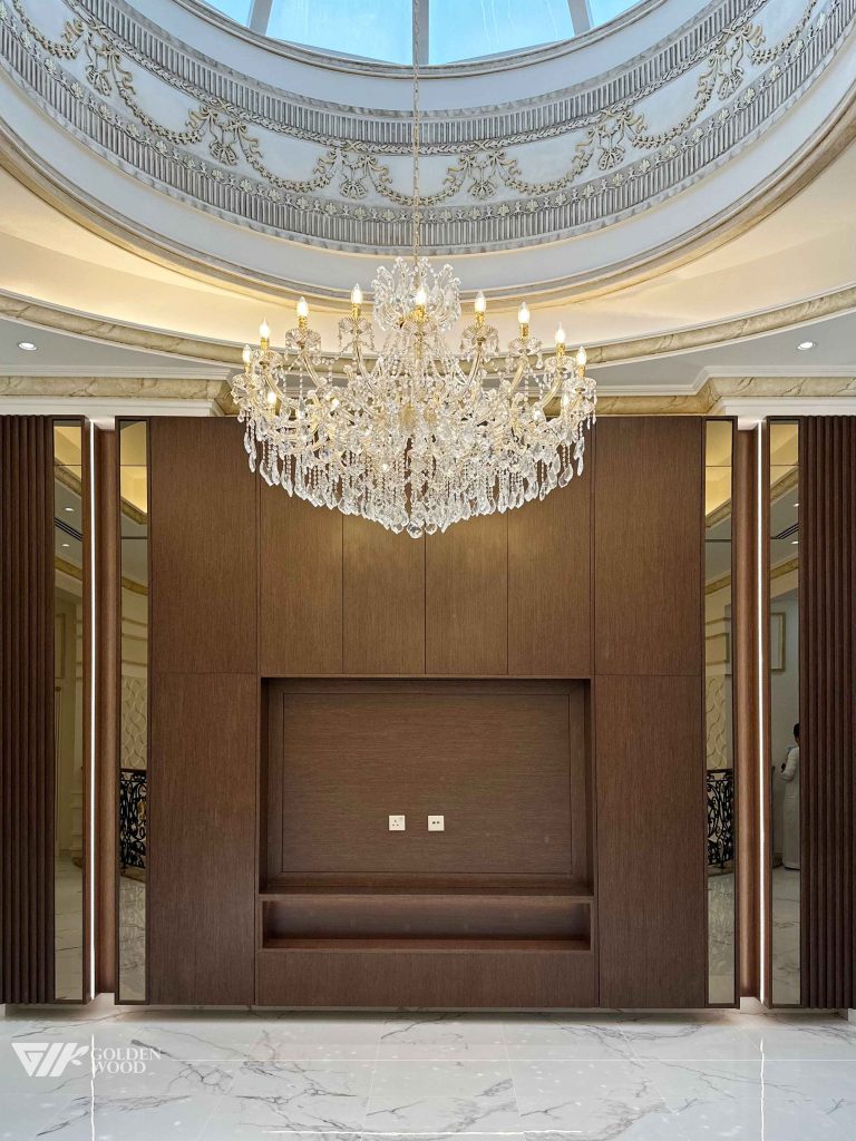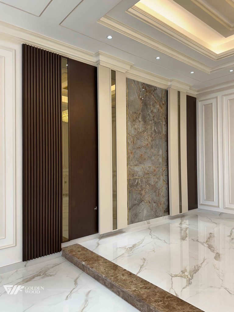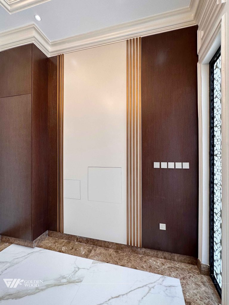 The Armonia Villa, completed by Golden Wood, features luxurious and sophisticated interior design for a high-end residential space. The design incorporates custom woodwork with rich dark finishes and elegant details, including finely crafted doors, panels, and decorative wall elements. The use of marble flooring complements the wood accents, adding a touch of opulence. The project also includes well-designed cabinetry and integrated lighting to enhance the aesthetic appeal of the living spaces, creating an inviting and refined atmosphere.