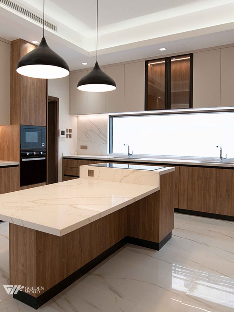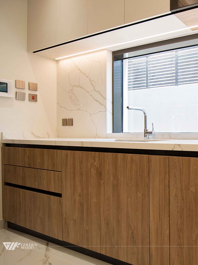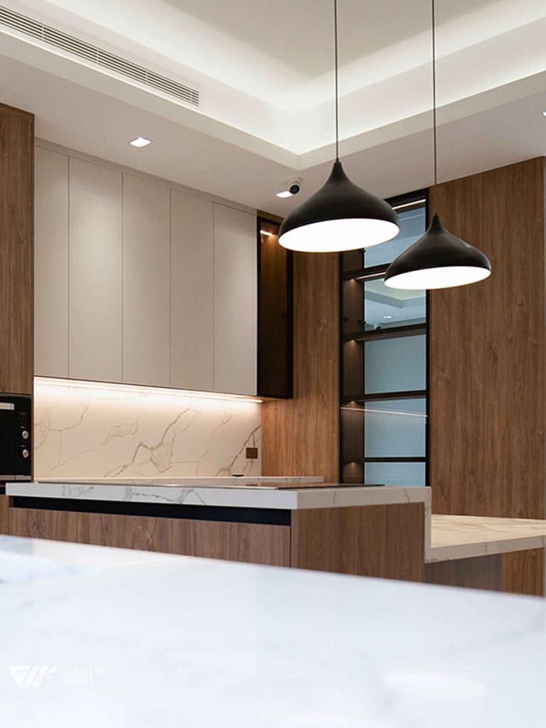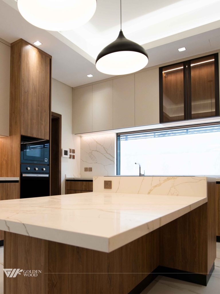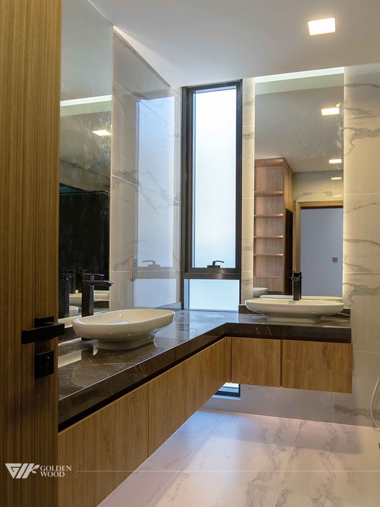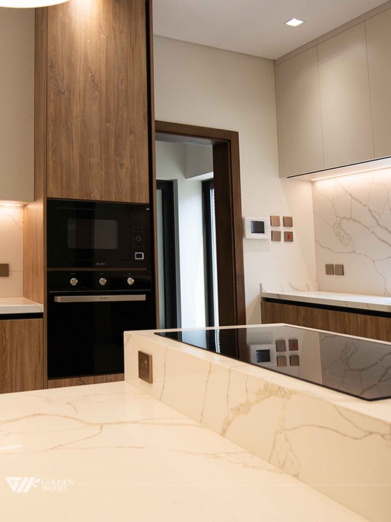 This villa features a sleek, modern design with a harmonious blend of natural wood and marble finishes. The spacious kitchen boasts a minimalist aesthetic with high-end appliances, while the bathrooms exude luxury with elegant stone countertops and modern fixtures. Large windows and strategic lighting enhance the airy, open feel throughout, creating a sophisticated and inviting atmosphere.
