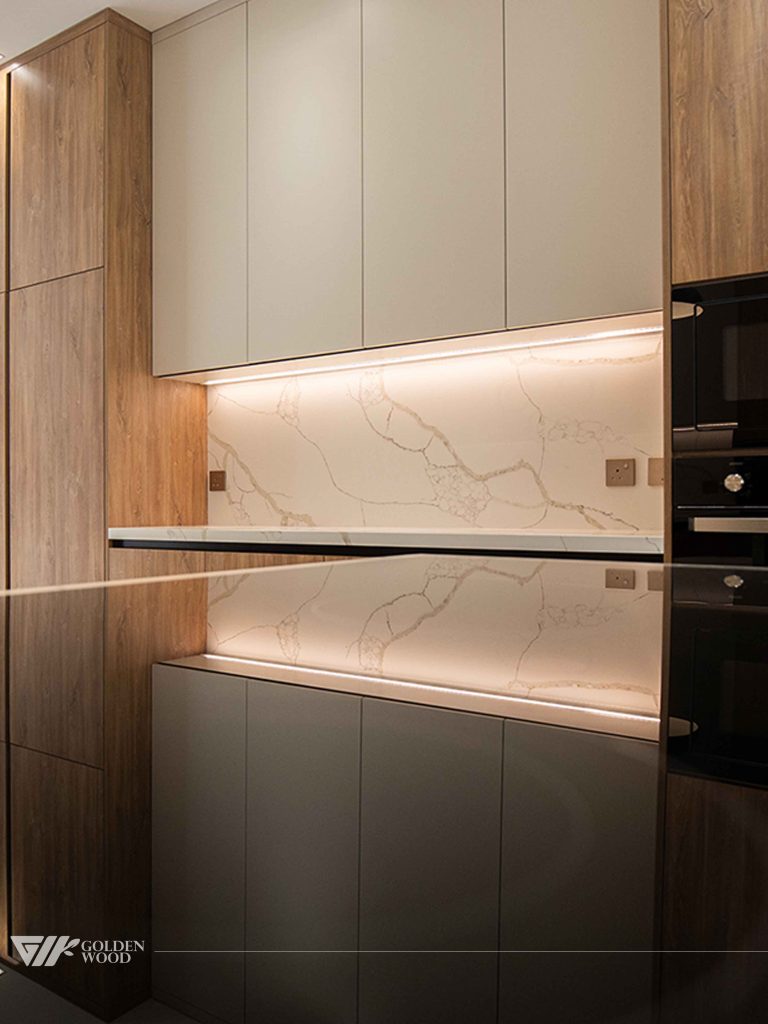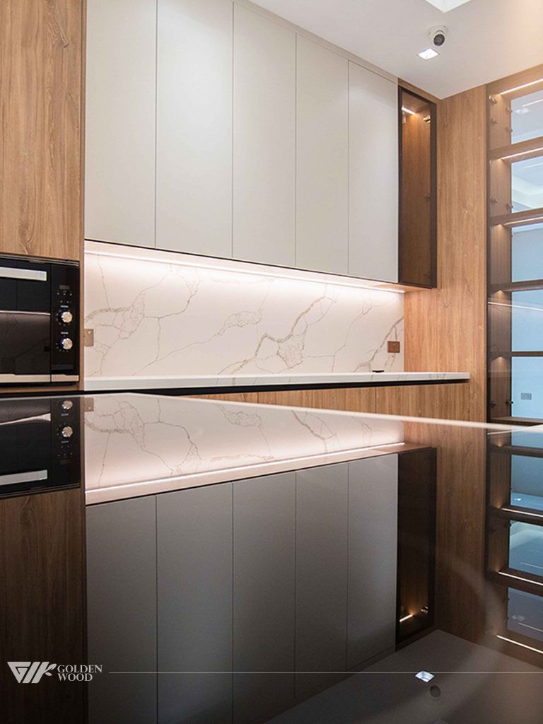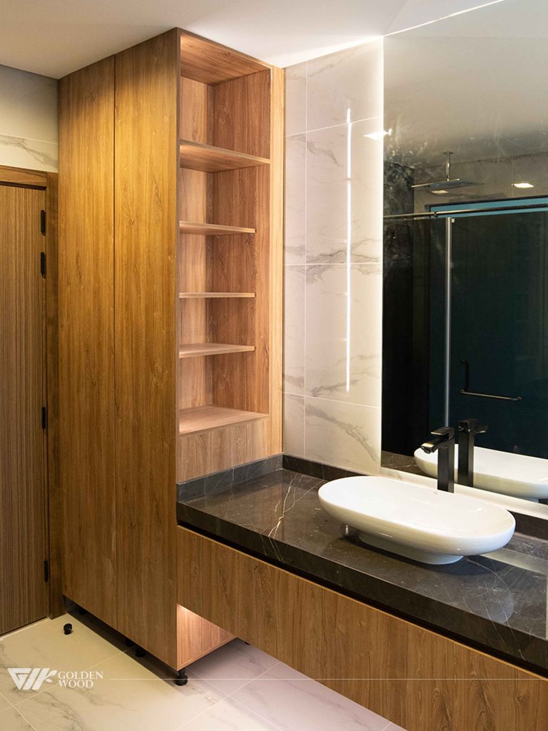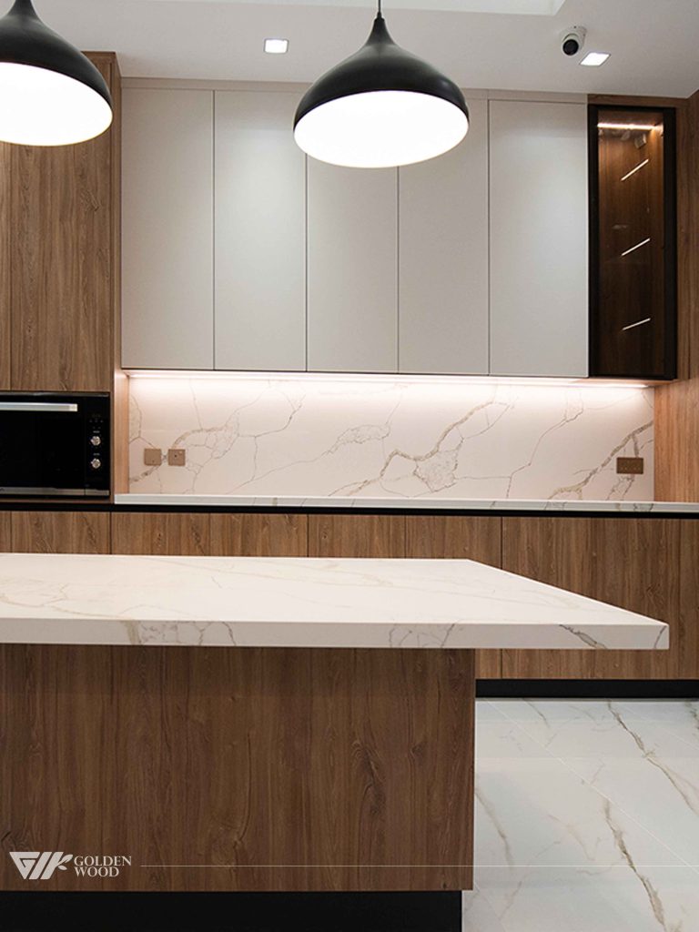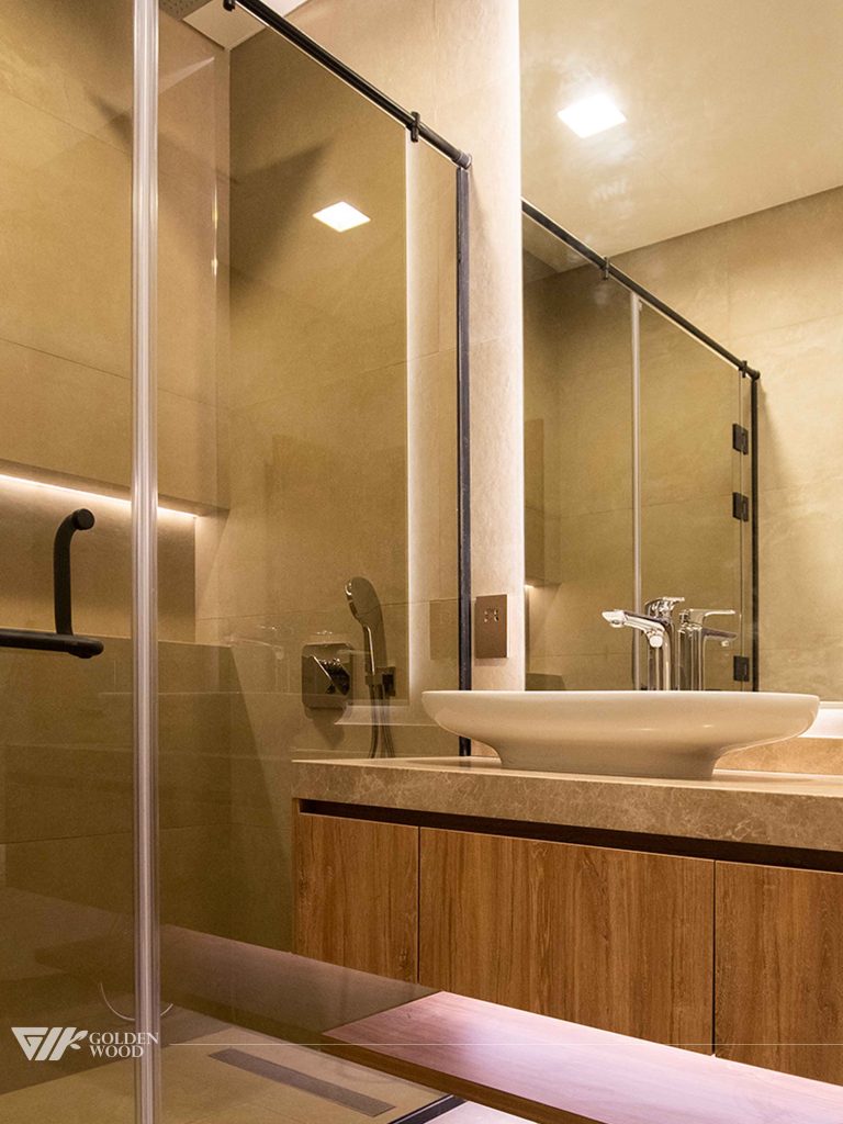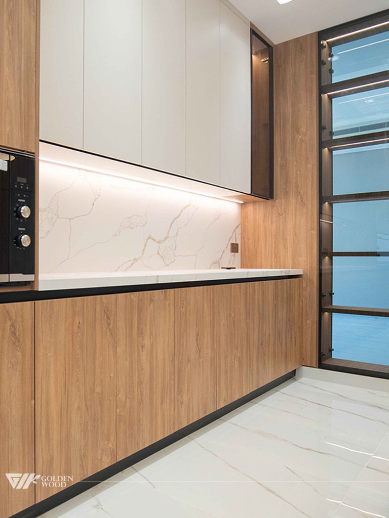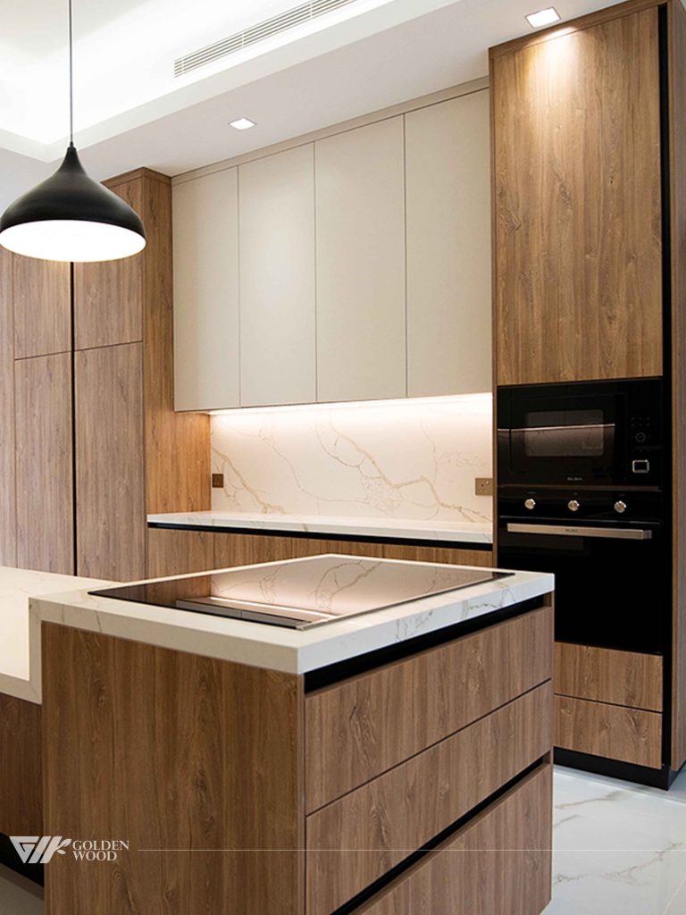 This villa features a sleek, modern design with a harmonious blend of natural wood and marble finishes. The spacious kitchen boasts a minimalist aesthetic with high-end appliances, while the bathrooms exude luxury with elegant stone countertops and modern fixtures. Large windows and strategic lighting enhance the airy, open feel throughout, creating a sophisticated and inviting atmosphere.