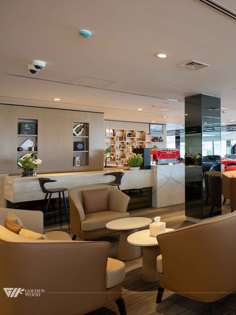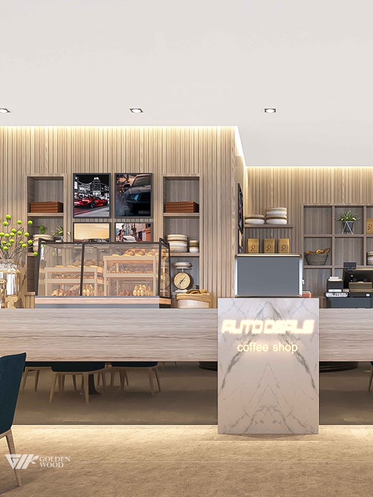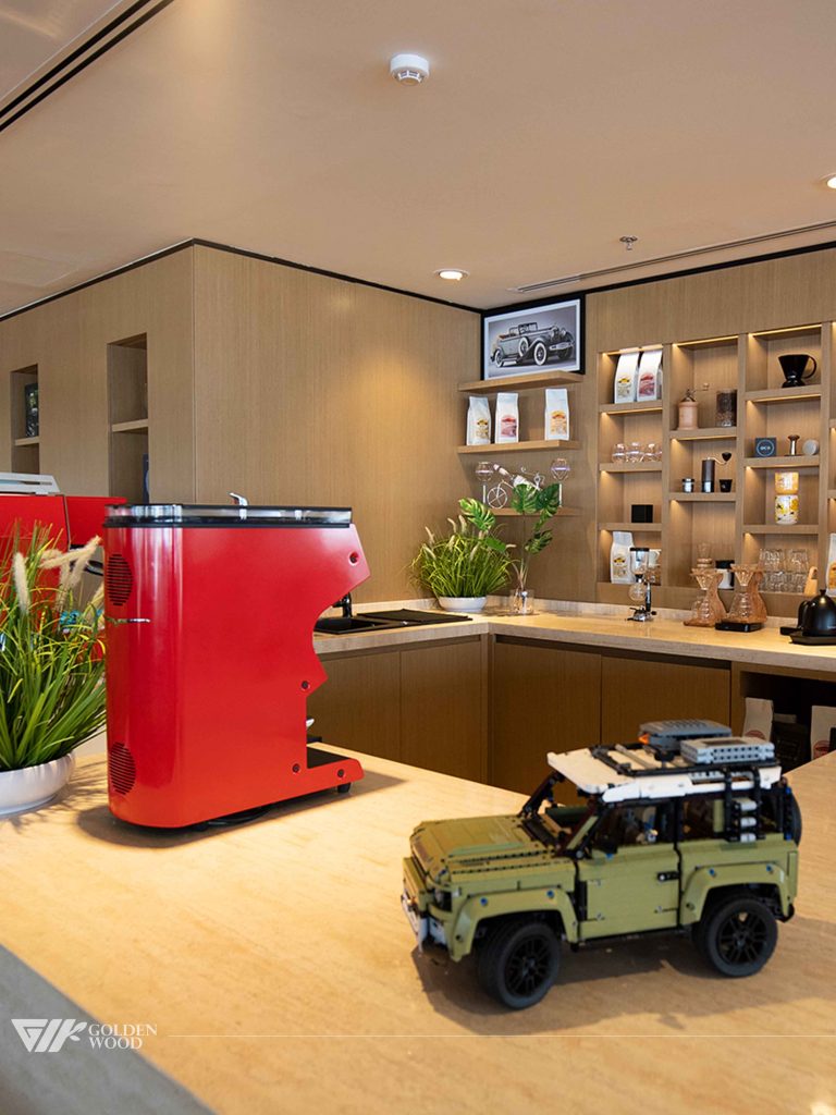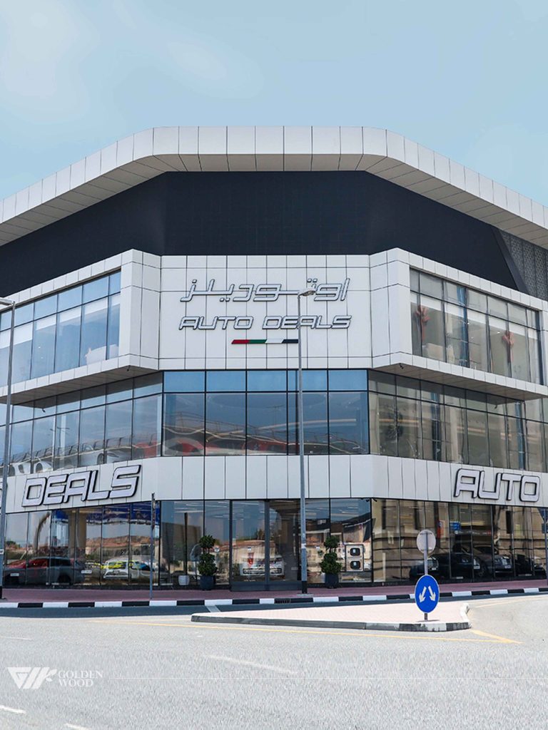 The Auto Deals space features a sleek, contemporary design with a modern automotive theme. The exterior showcases a bold, modern building with large glass windows displaying luxury cars. Inside, the coffee shop area is stylishly integrated, with minimalist furnishings and a focus on high-end coffee equipment. The space blends automotive aesthetics with a comfortable environment, highlighted by clean lines, lighting accents, and curated decor, creating a unique experience for visitors.