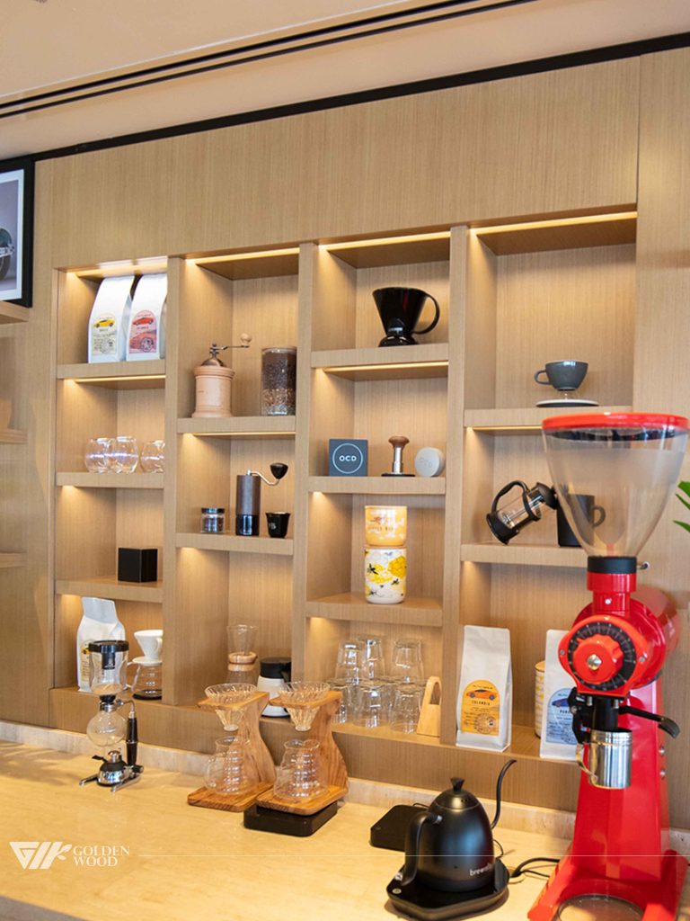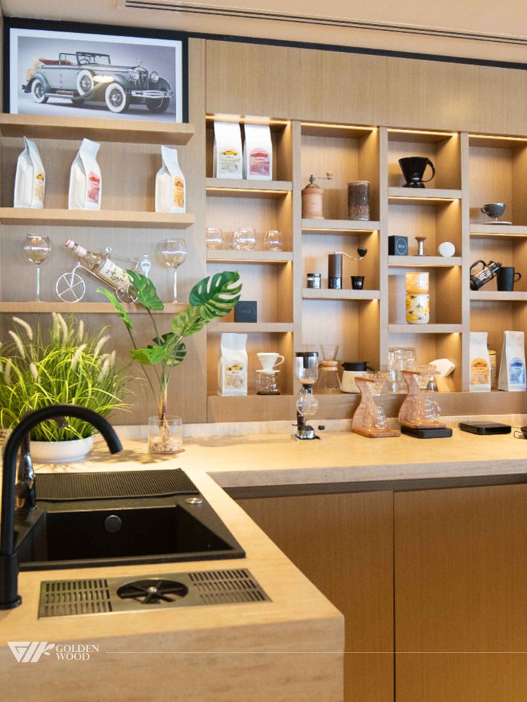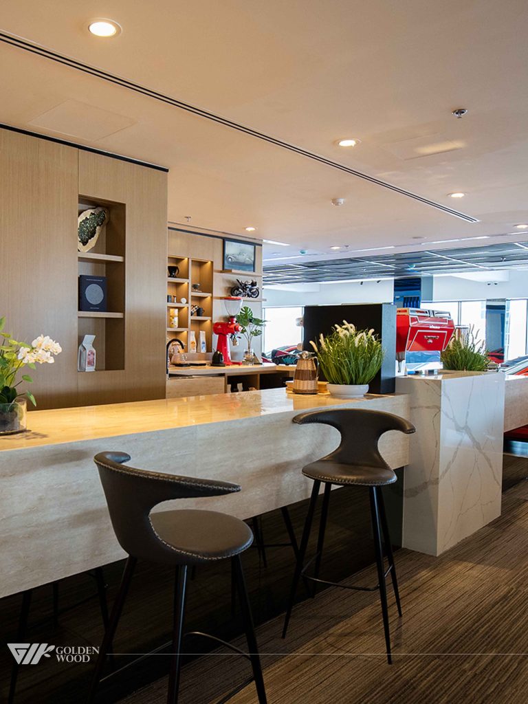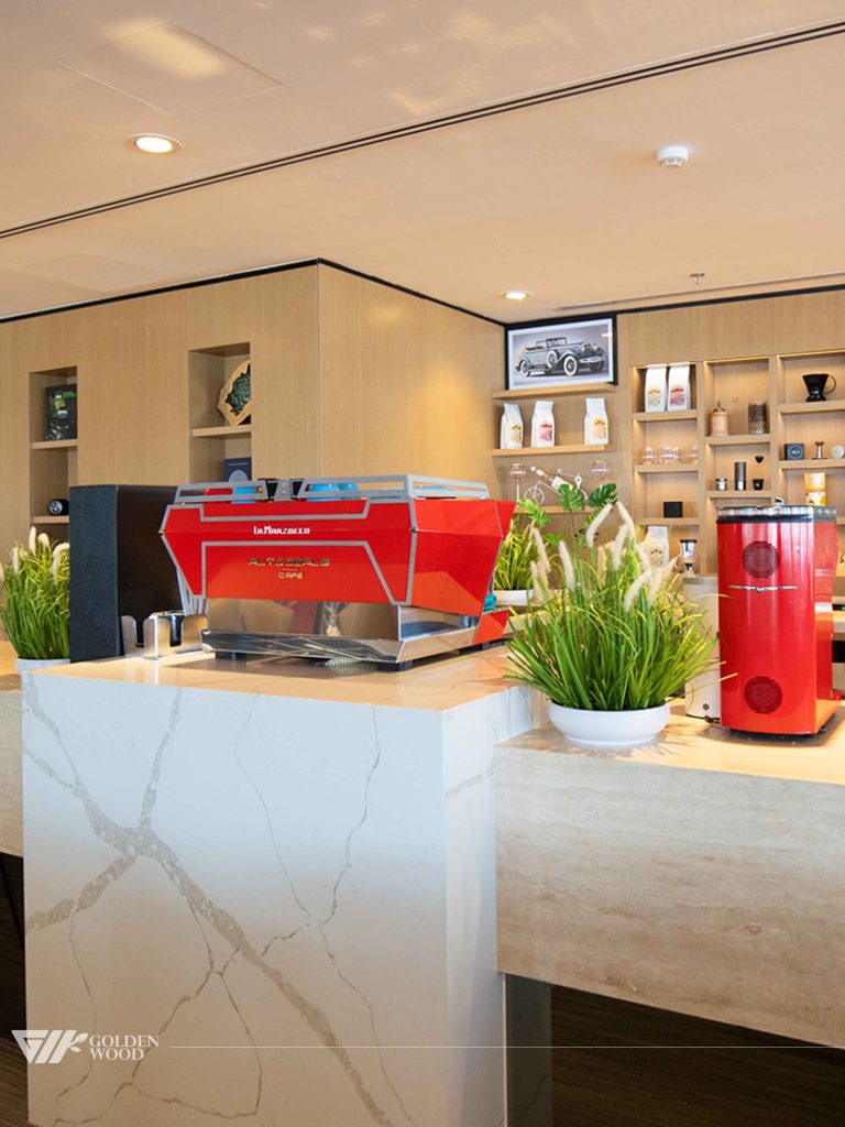 The Auto Deals space features a sleek, contemporary design with a modern automotive theme. The exterior showcases a bold, modern building with large glass windows displaying luxury cars. Inside, the coffee shop area is stylishly integrated, with minimalist furnishings and a focus on high-end coffee equipment. The space blends automotive aesthetics with a comfortable environment, highlighted by clean lines, lighting accents, and curated decor, creating a unique experience for visitors.