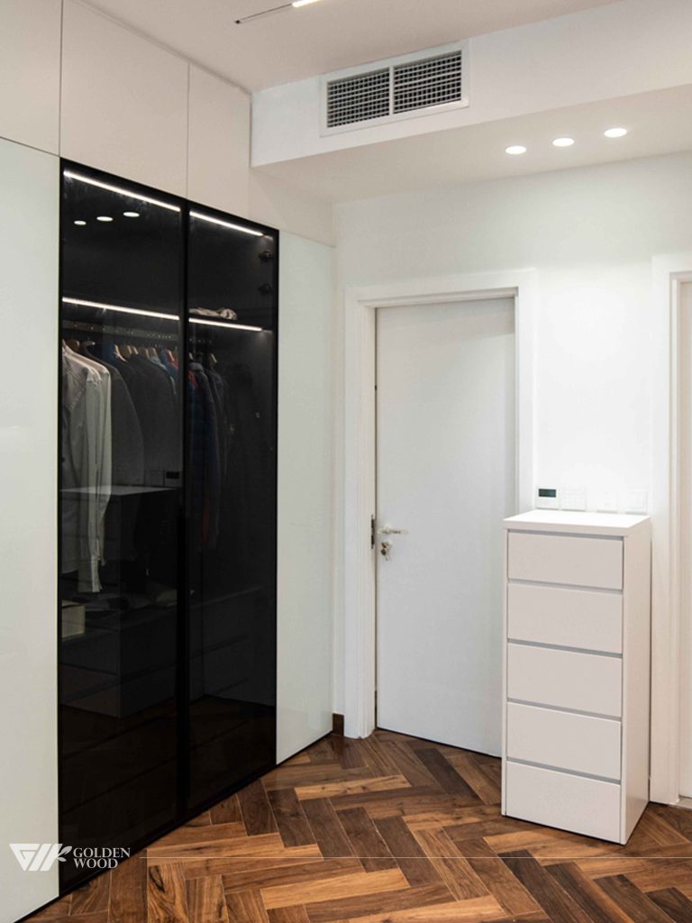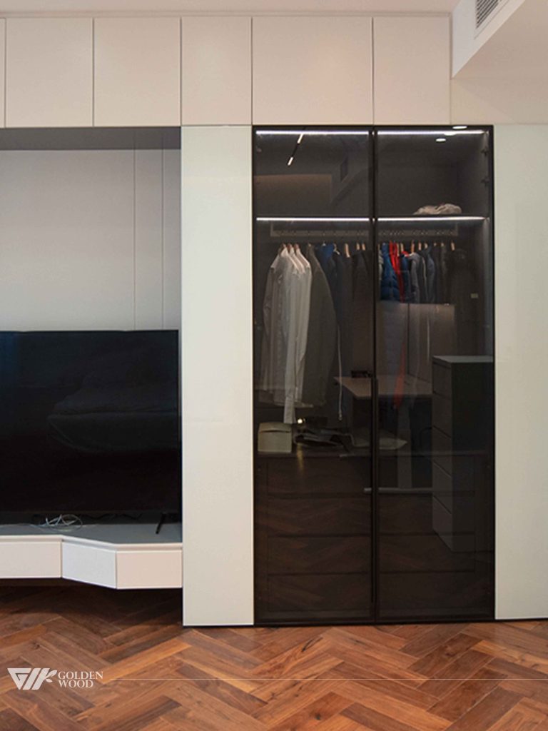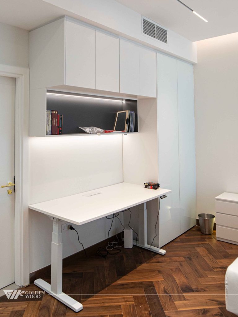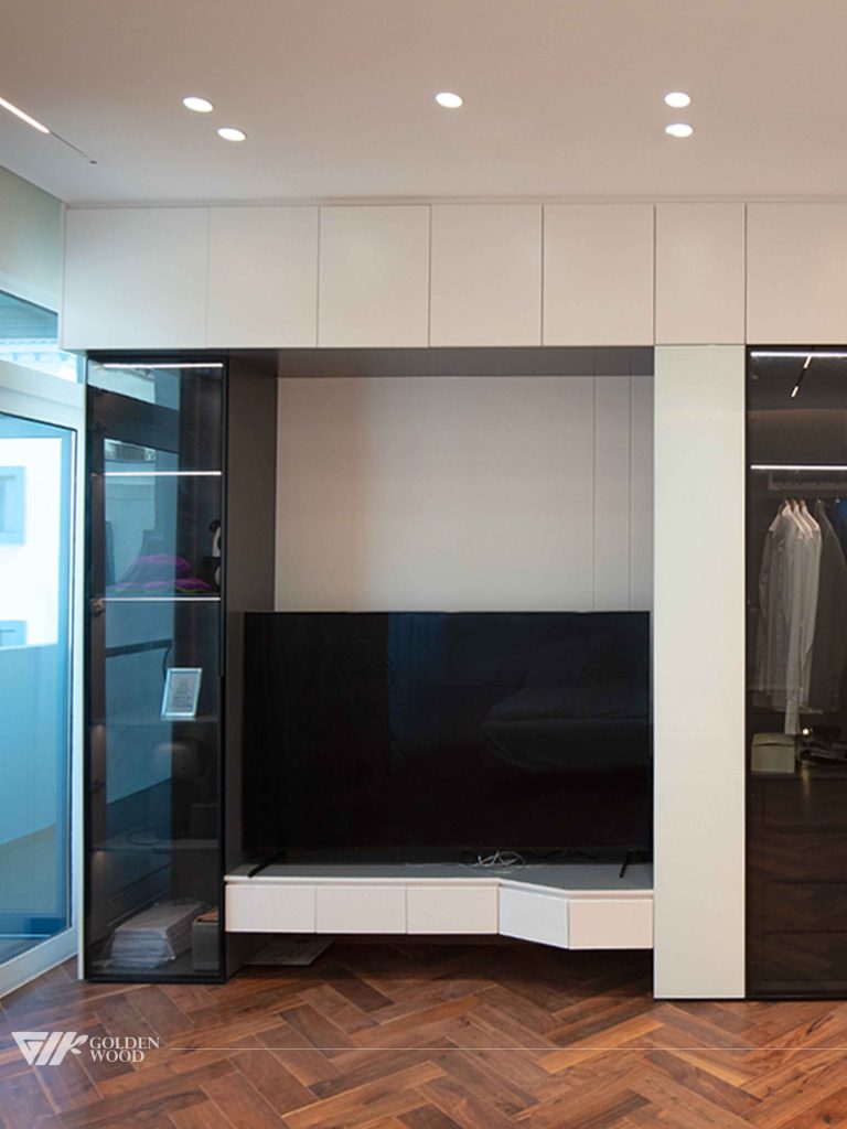 This villa features a modern, minimalist design with a focus on clean lines and functional layout. The living areas are seamlessly integrated with custom cabinetry, including a stylish TV unit with sleek white and black finishes. The rooms boast elegant hardwood flooring, complemented by subtle lighting that enhances the overall ambiance. In the bedroom and workspace areas, the design prioritizes simplicity and practicality, with built-in storage, a functional standing desk, and efficient use of space. The combination of light, neutral tones with elegant wood textures creates a warm, sophisticated atmosphere throughout.