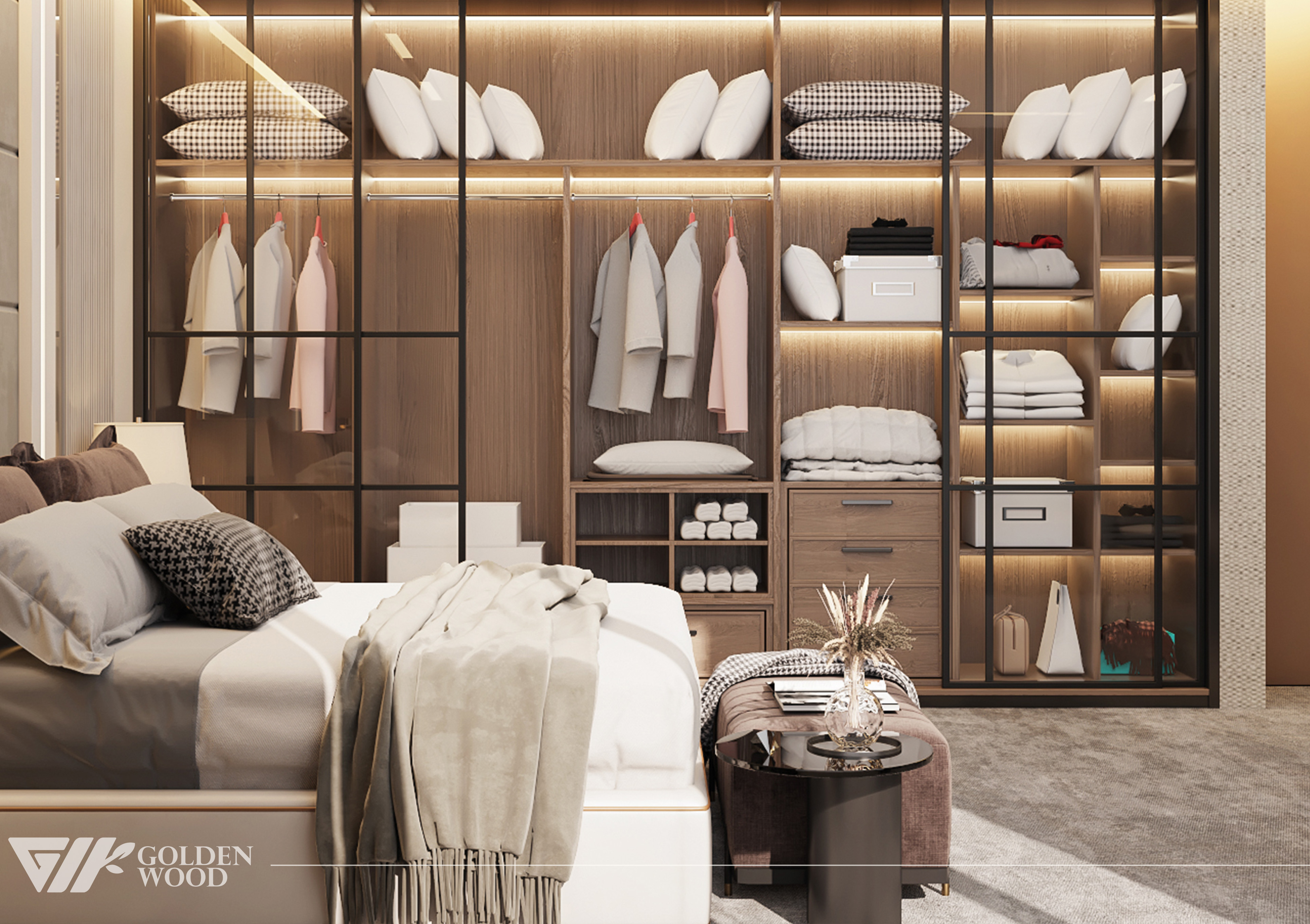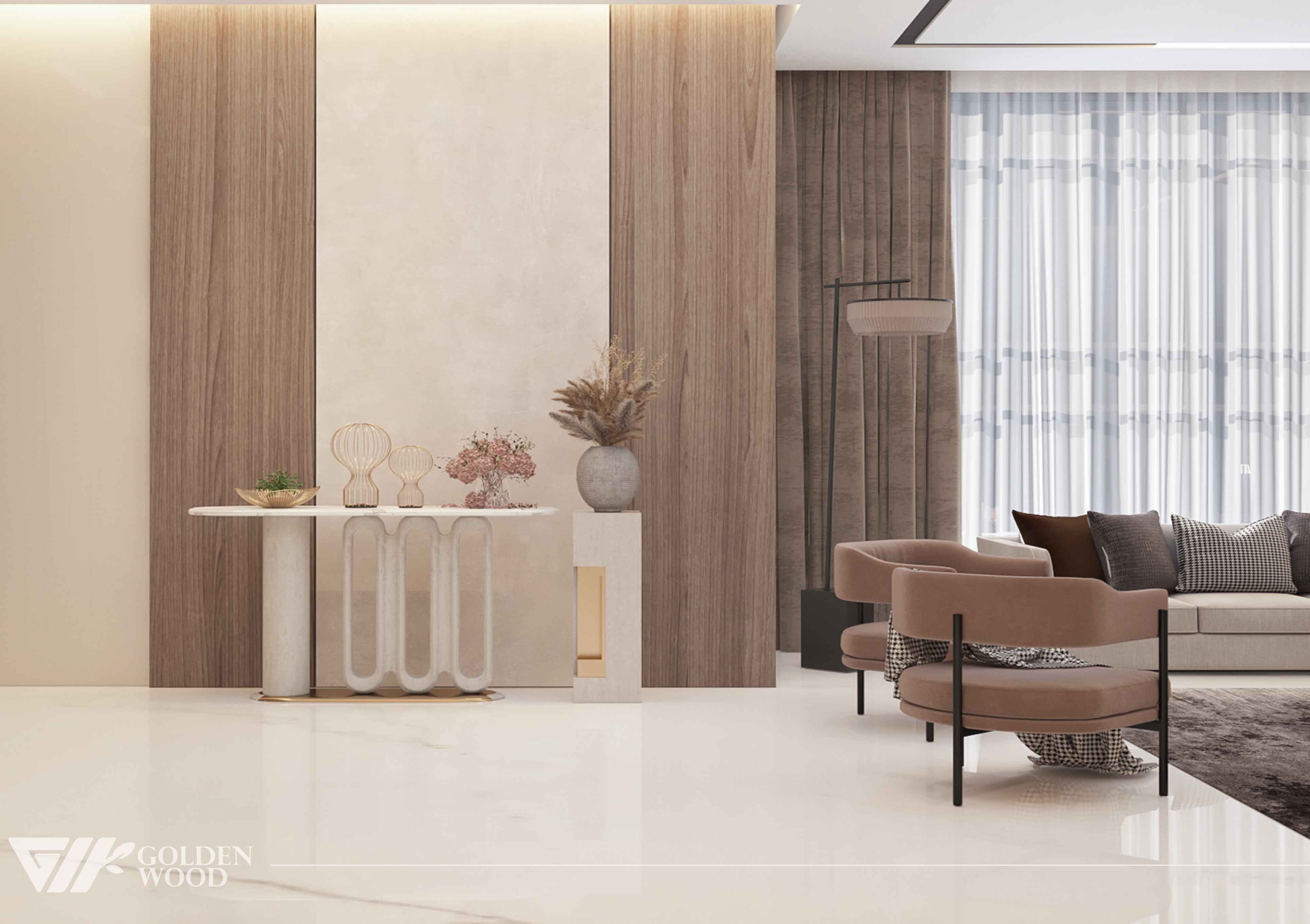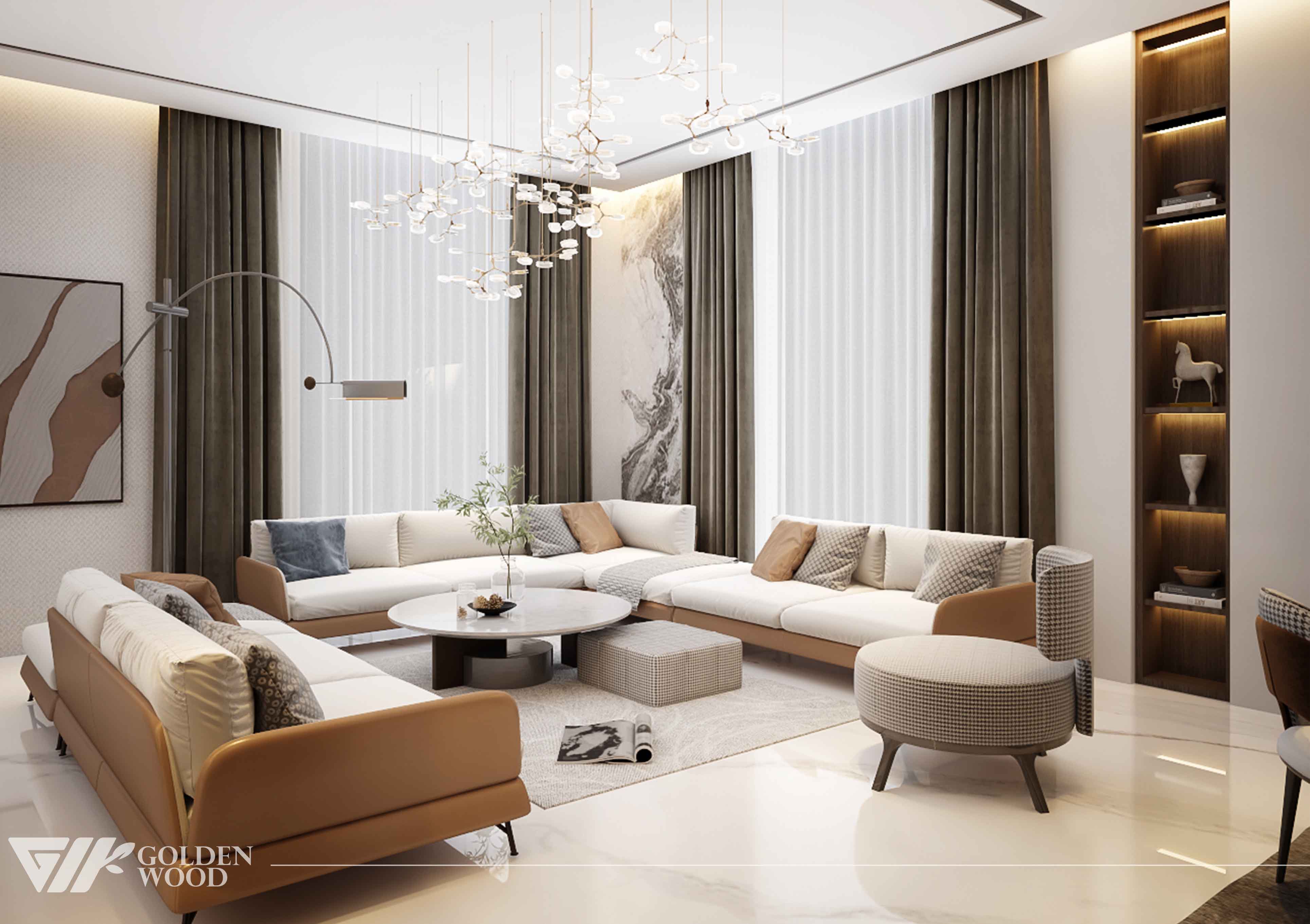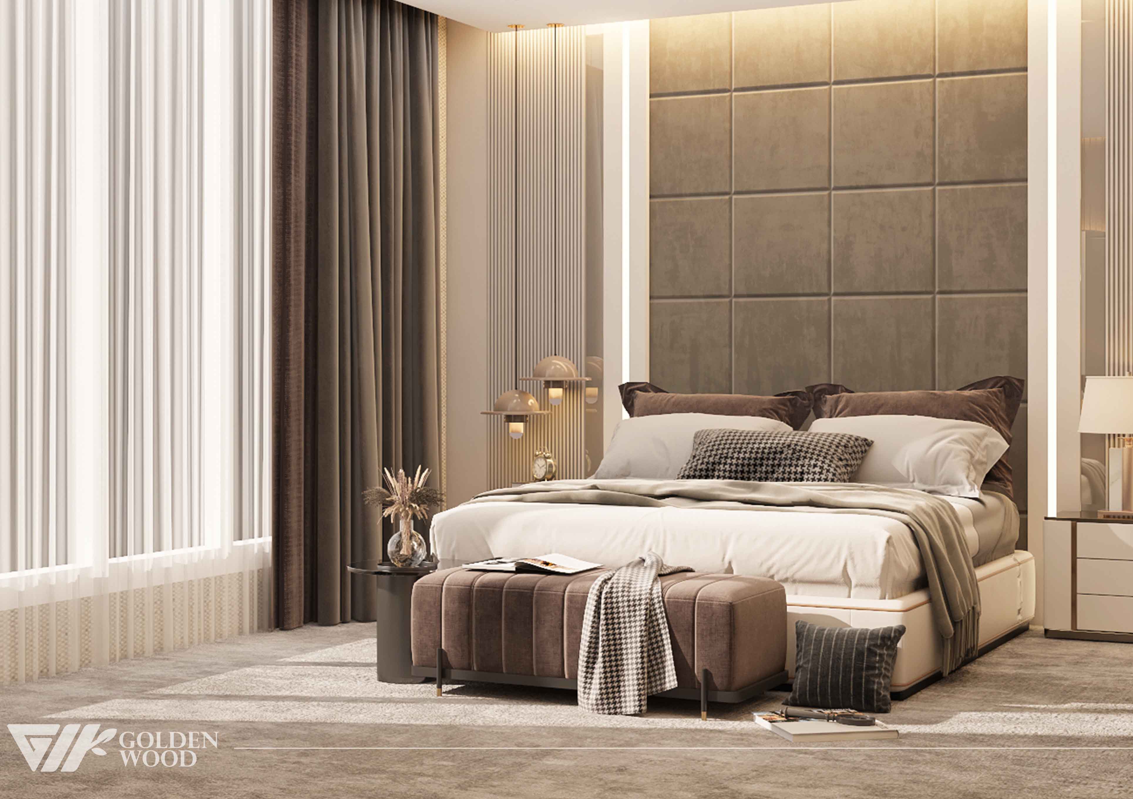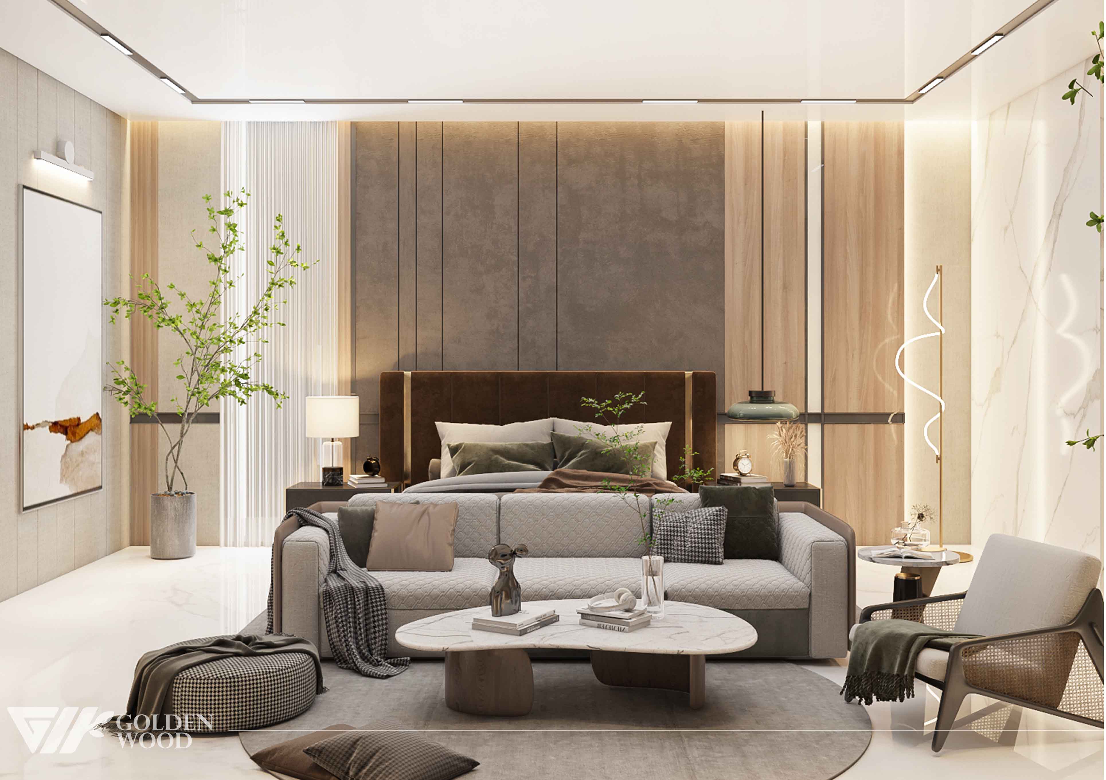 Showcases a modern, luxurious interior design with a focus on clean lines, soft neutral tones, and elegant materials. The spaces appear spacious and serene, featuring elements such as velvet textures, sleek furniture, and sophisticated lighting. The first image highlights a contemporary bedroom and living area with earthy tones and minimalist decor. The second image presents a serene, stylish bedroom with a built-in closet system and plush bedding. The third image features a modern living room with a sectional sofa, a designer chandelier, and tasteful decorative accents. Each space is thoughtfully designed to create a sense of comfort and refinement. The design seamlessly blends practicality with aesthetics, offering a harmonious living environment.