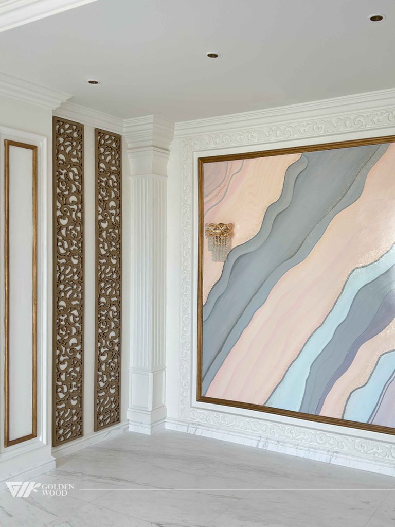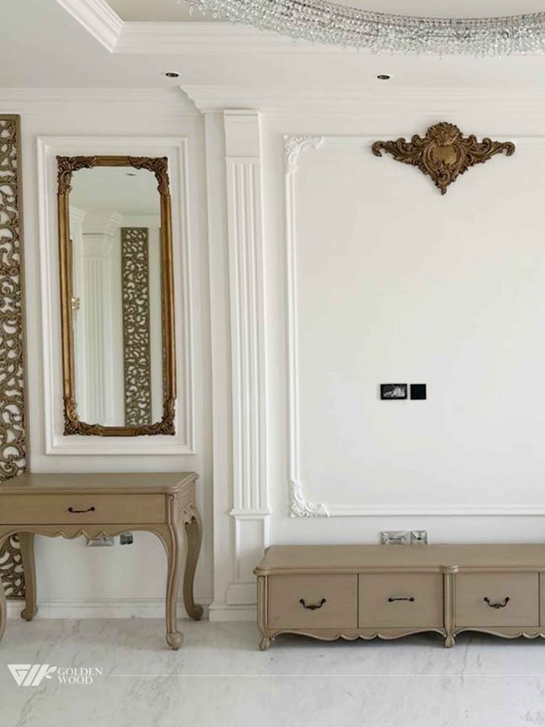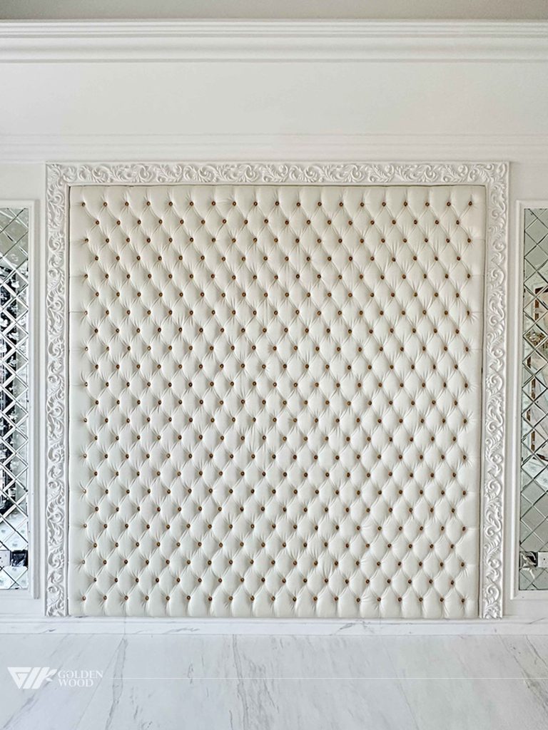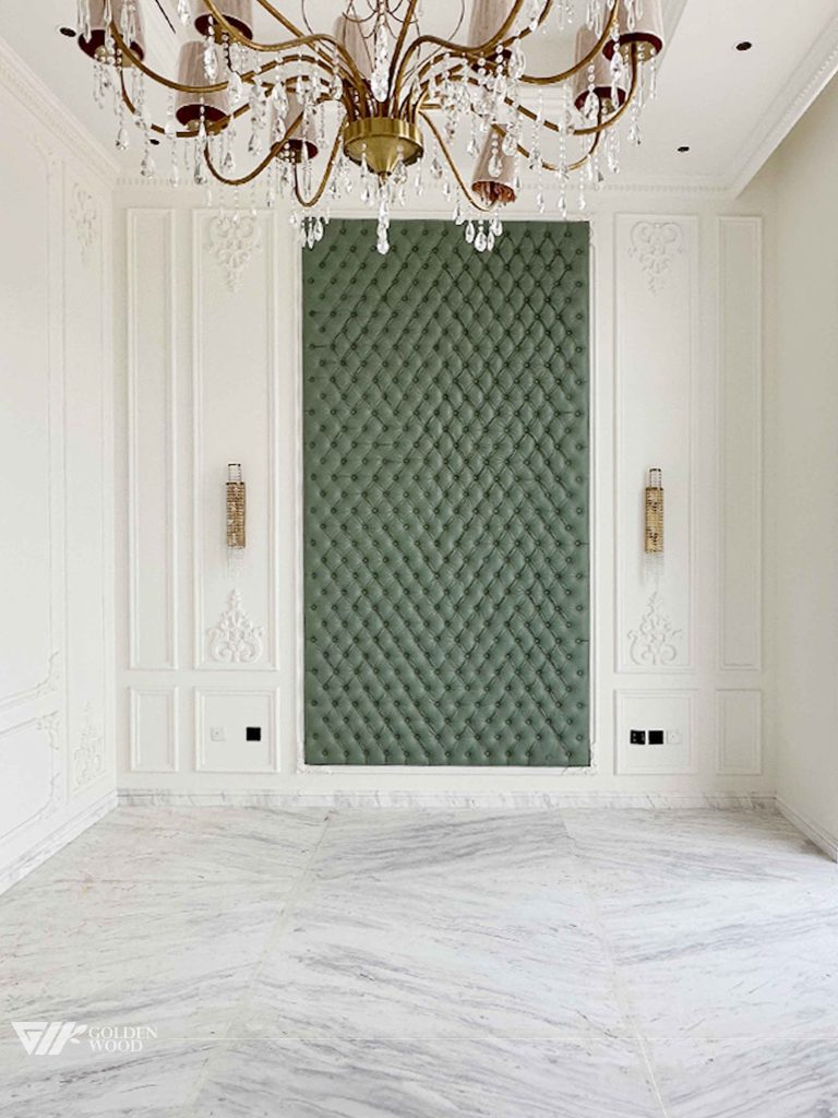 The Majestic Haven Villa Villa is an exquisite blend of luxury and elegance, featuring sophisticated design elements. The villa includes opulent walls with intricate designs such as tufted leather panels and decorative woodwork. Rich materials like marble flooring and carved details add to the grandeur, while the modern furniture and decorative elements, such as contemporary lighting and partitions, add a touch of modernity. The space feels both spacious and refined, with a focus on both style and functionality, making it a truly regal residence.