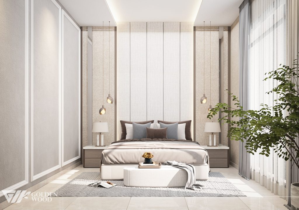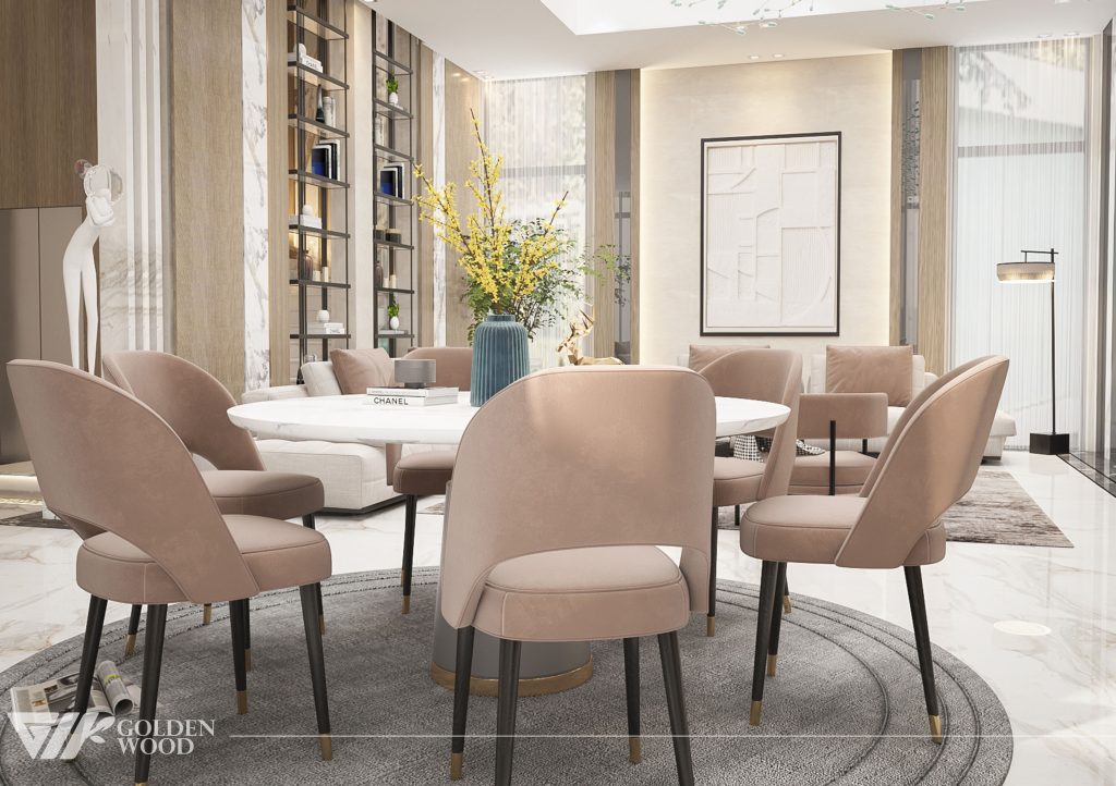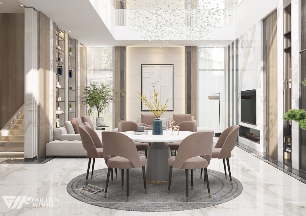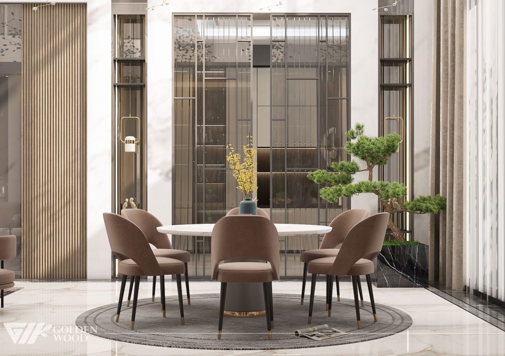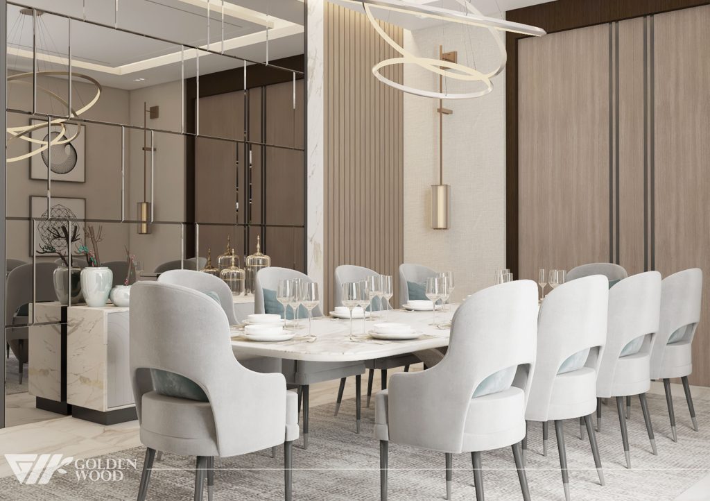 The living area is highlighted by custom crystal chandeliers and sculptural furniture, while the dining space offers a sophisticated round-table setup that fosters intimate gatherings. The bedroom suite continues the theme of serenity and comfort with plush textiles, ambient lighting, and minimalist elegance.
