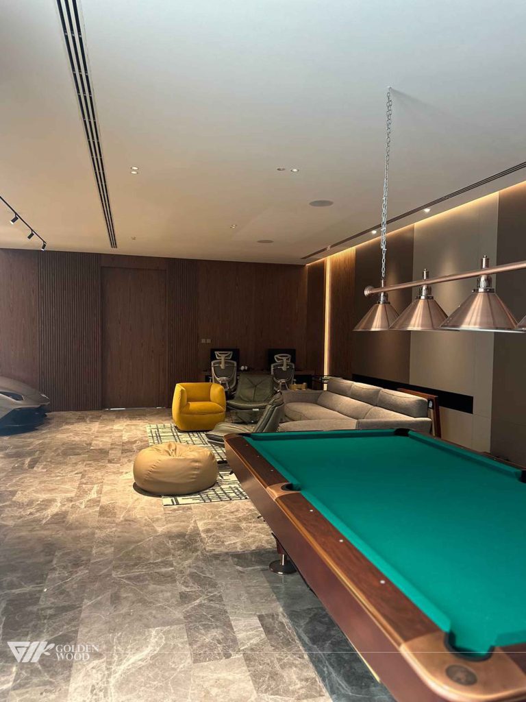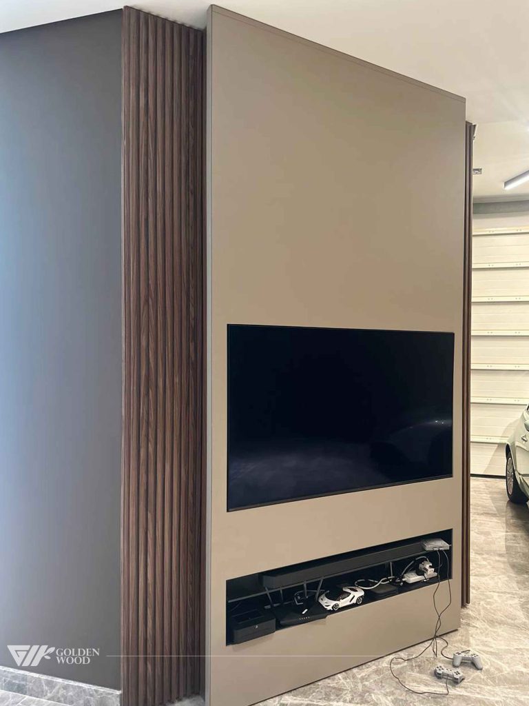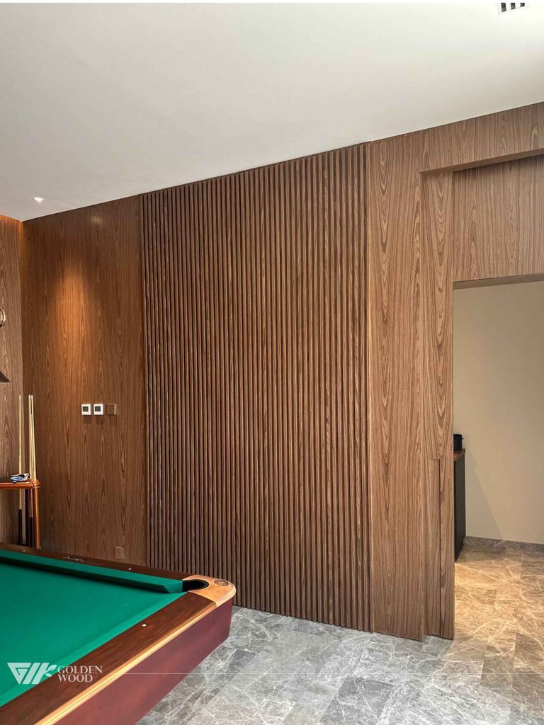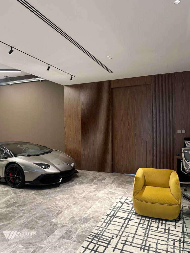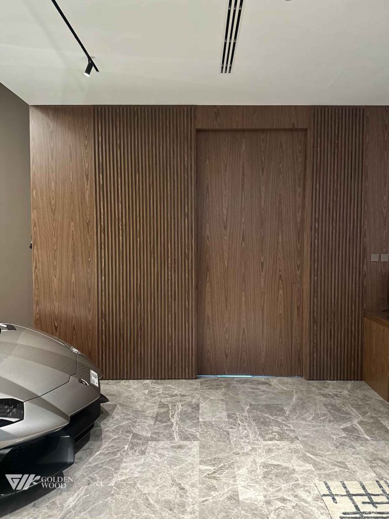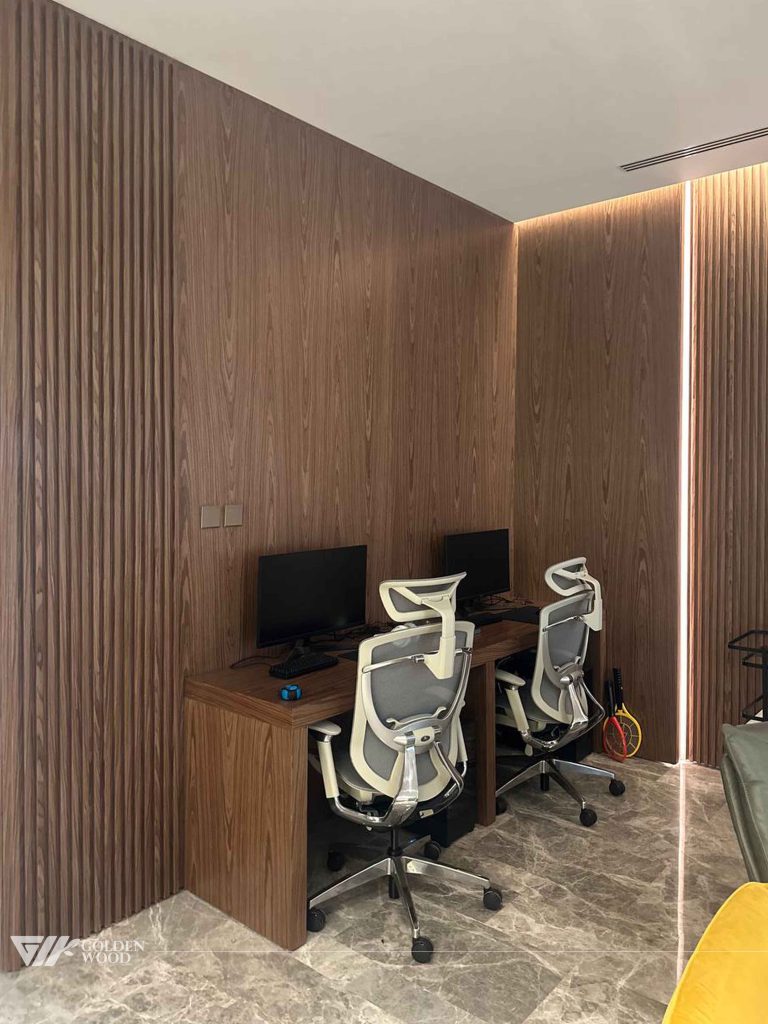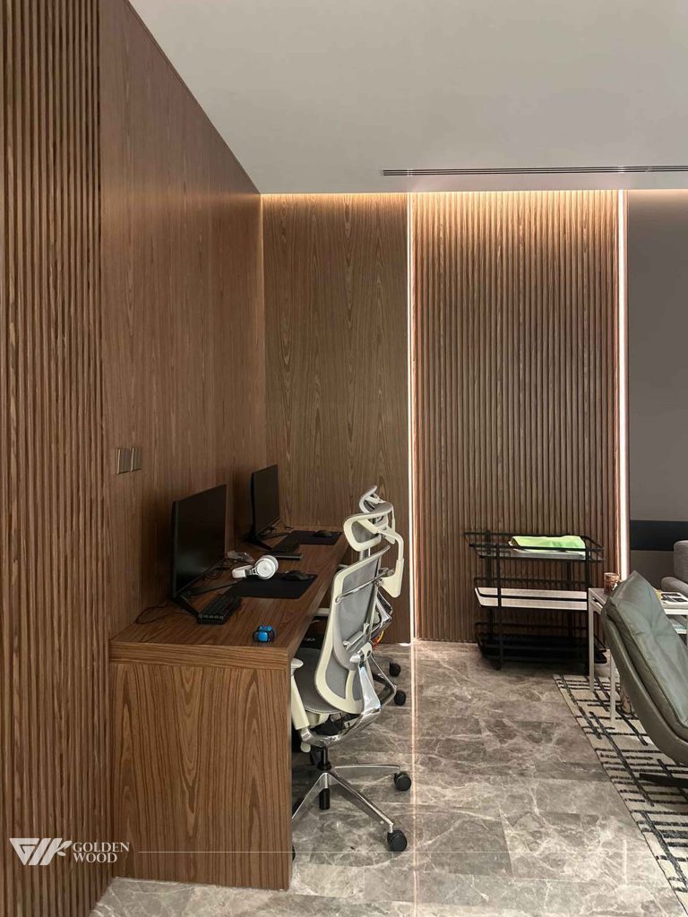 Elegant Wooden Paneling: The use of vertical wooden panels adds a sleek and contemporary touch, enriching the space with texture and depth.