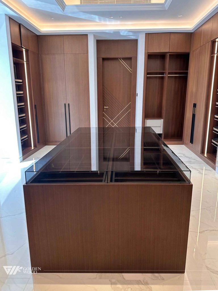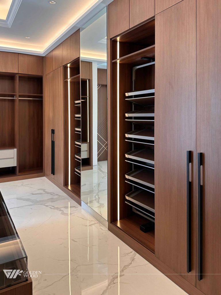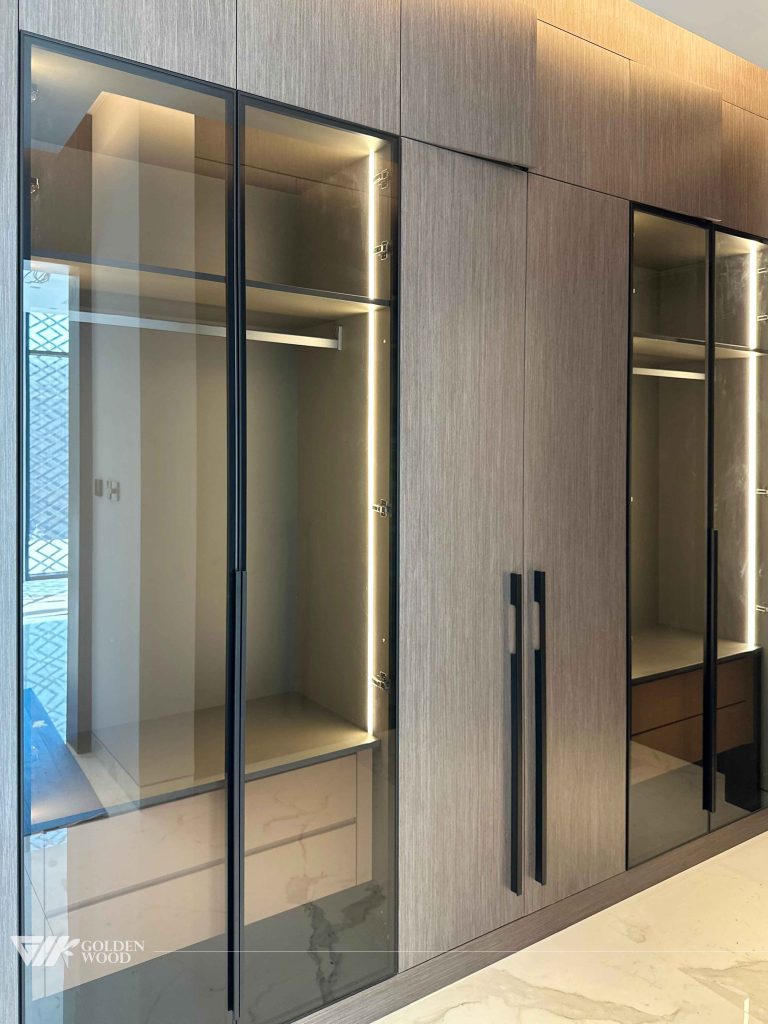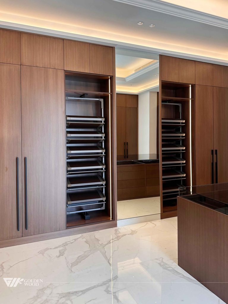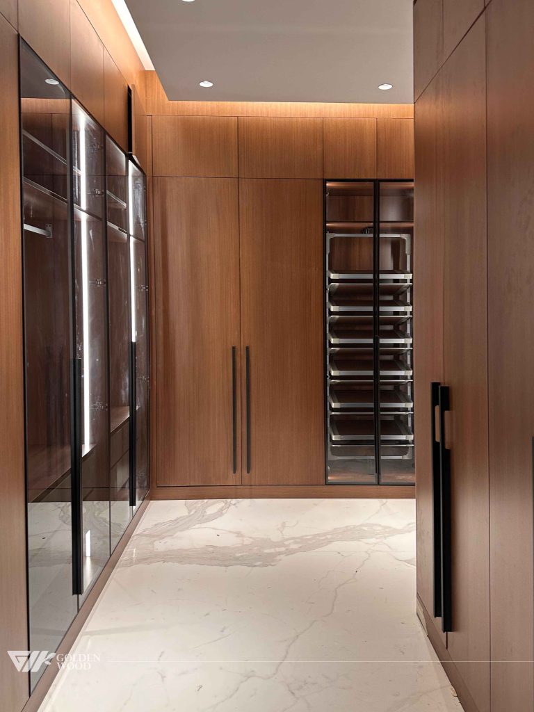 The GW24-172 Modern Oak Serenity project by Golden Wood features a luxurious and modern interior design, combining natural wood textures with sleek minimalist aesthetics. Custom cabinetry, intricate wall paneling, and elegant wardrobes are showcased with warm wood tones and refined detailing, including gold inlays and glass accents. The space is balanced with marble flooring and neutral color palettes, enhancing the overall sophistication. This project exemplifies high-end craftsmanship and contemporary elegance tailored to upscale residential environments.