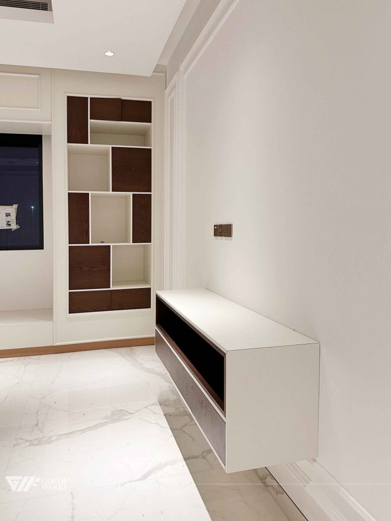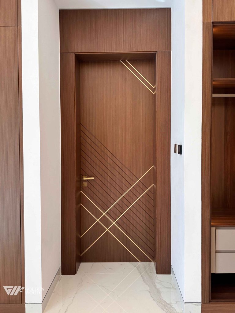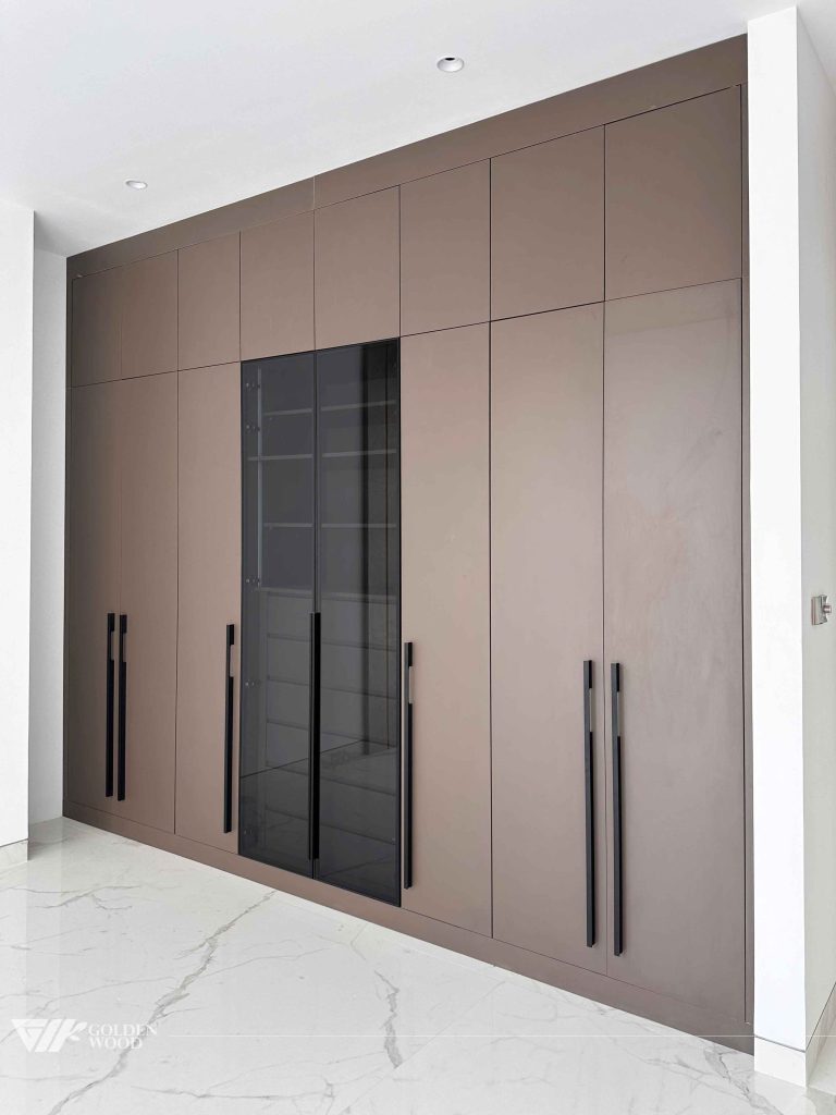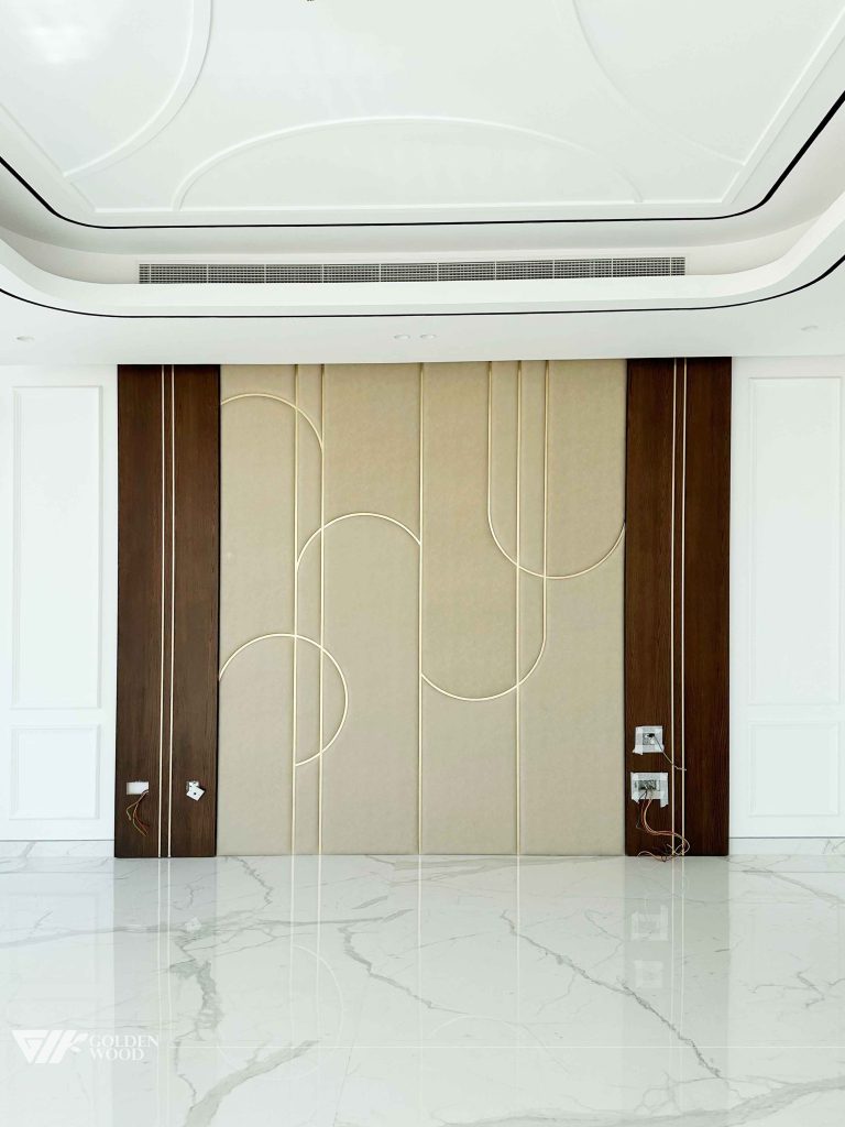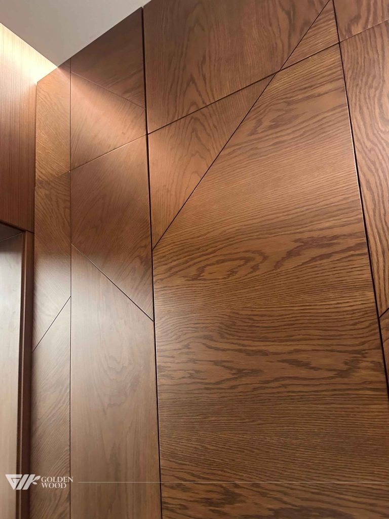 The GW24-172 Modern Oak Serenity project by Golden Wood features a luxurious and modern interior design, combining natural wood textures with sleek minimalist aesthetics. Custom cabinetry, intricate wall paneling, and elegant wardrobes are showcased with warm wood tones and refined detailing, including gold inlays and glass accents. The space is balanced with marble flooring and neutral color palettes, enhancing the overall sophistication. This project exemplifies high-end craftsmanship and contemporary elegance tailored to upscale residential environments.