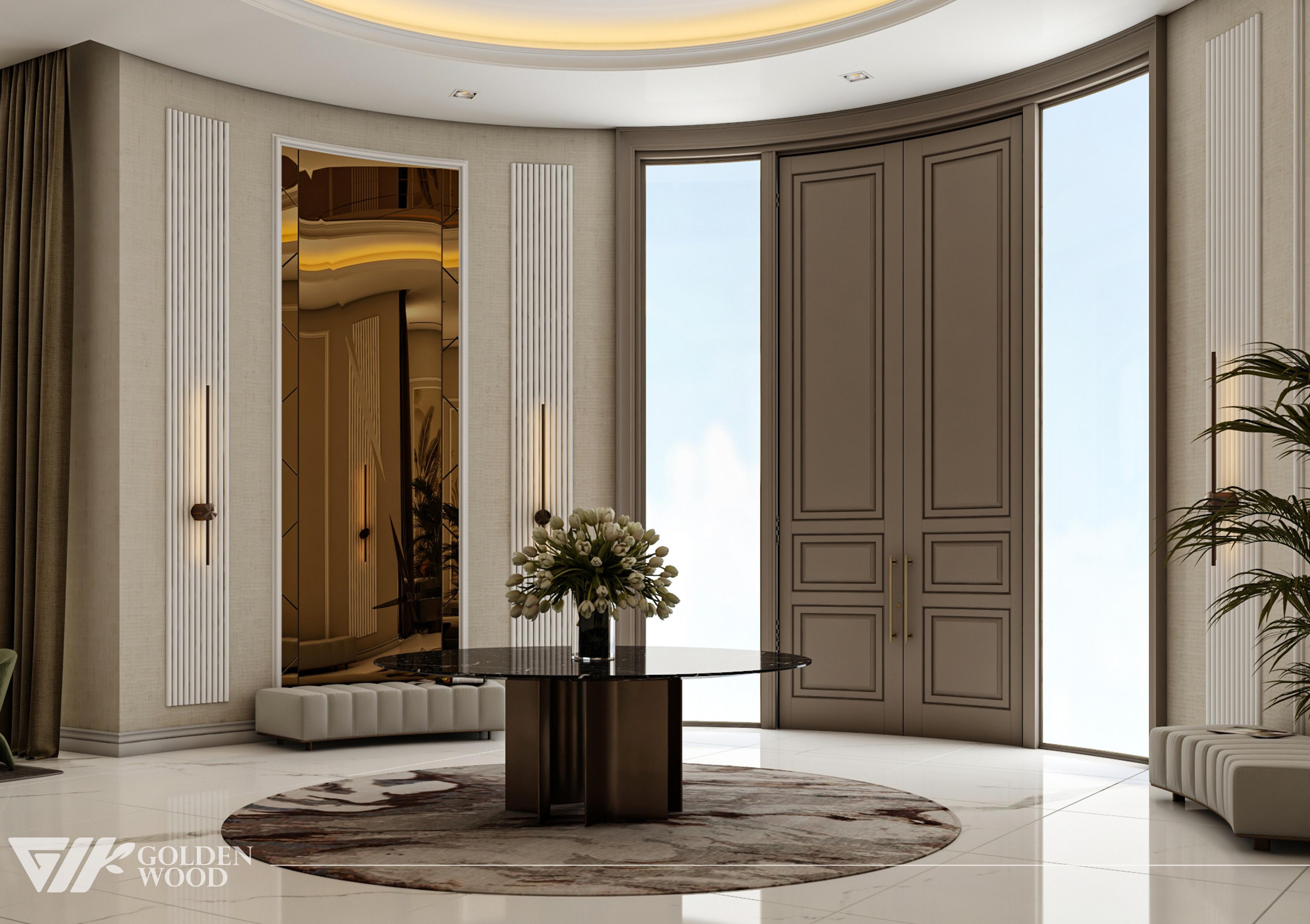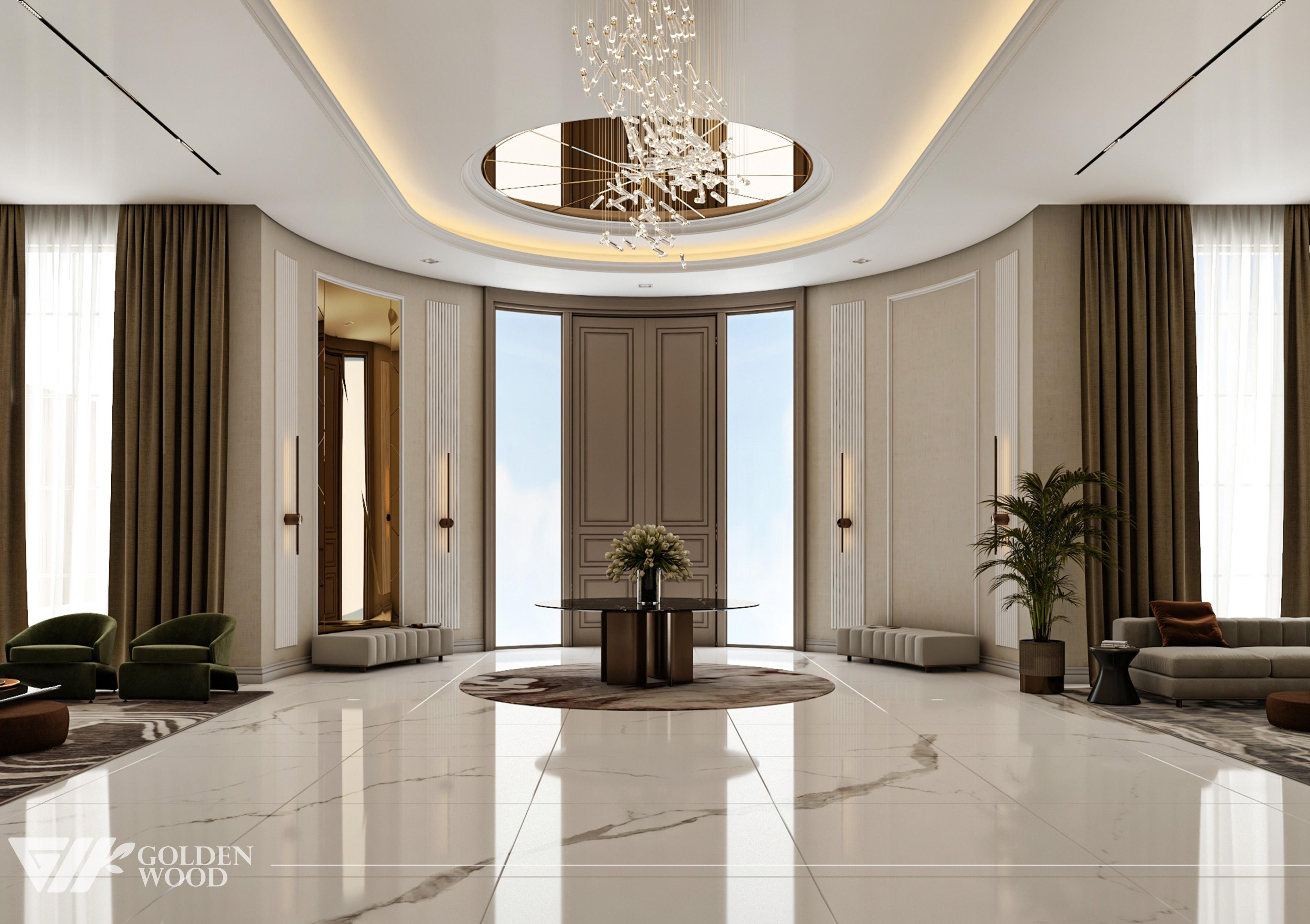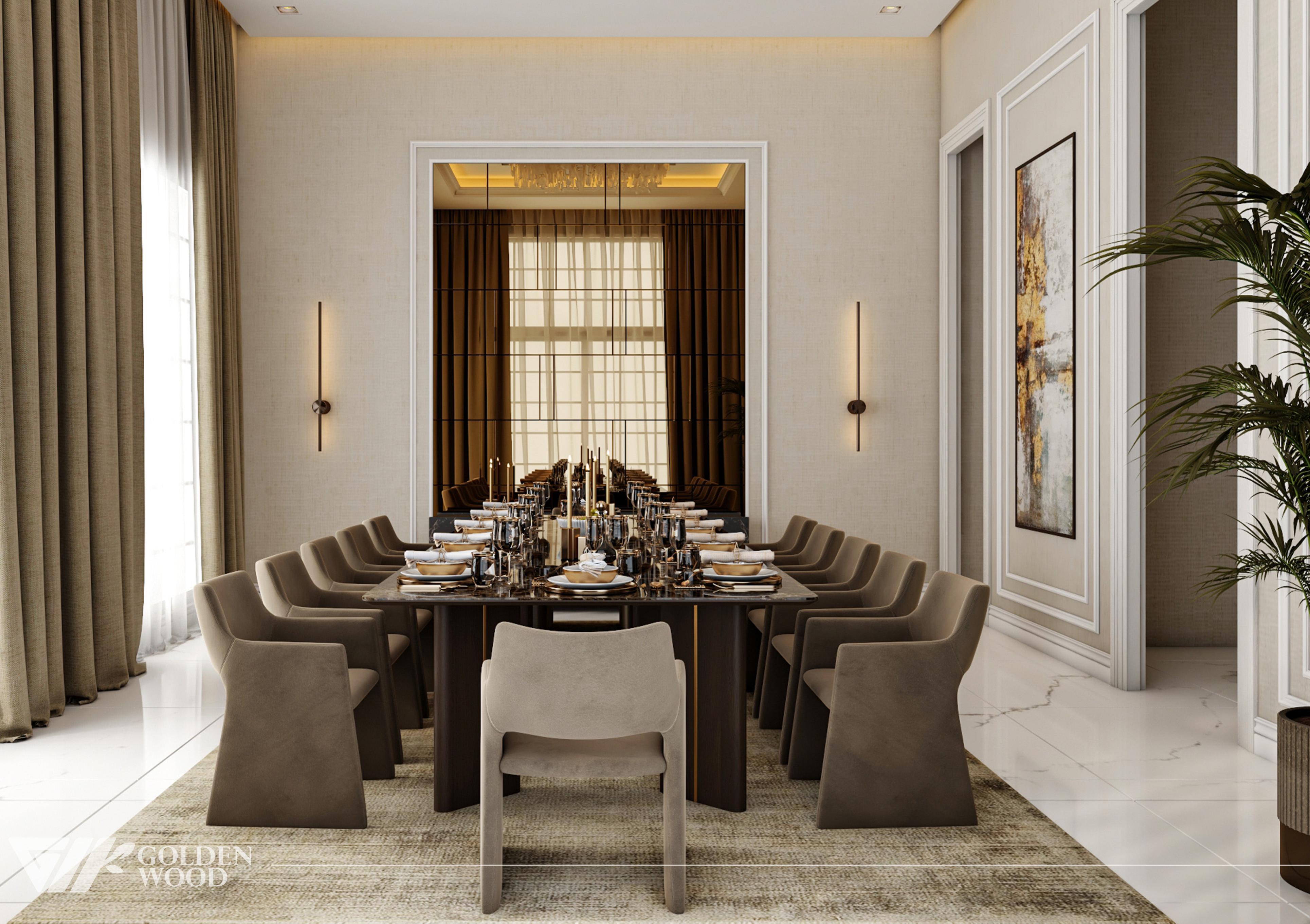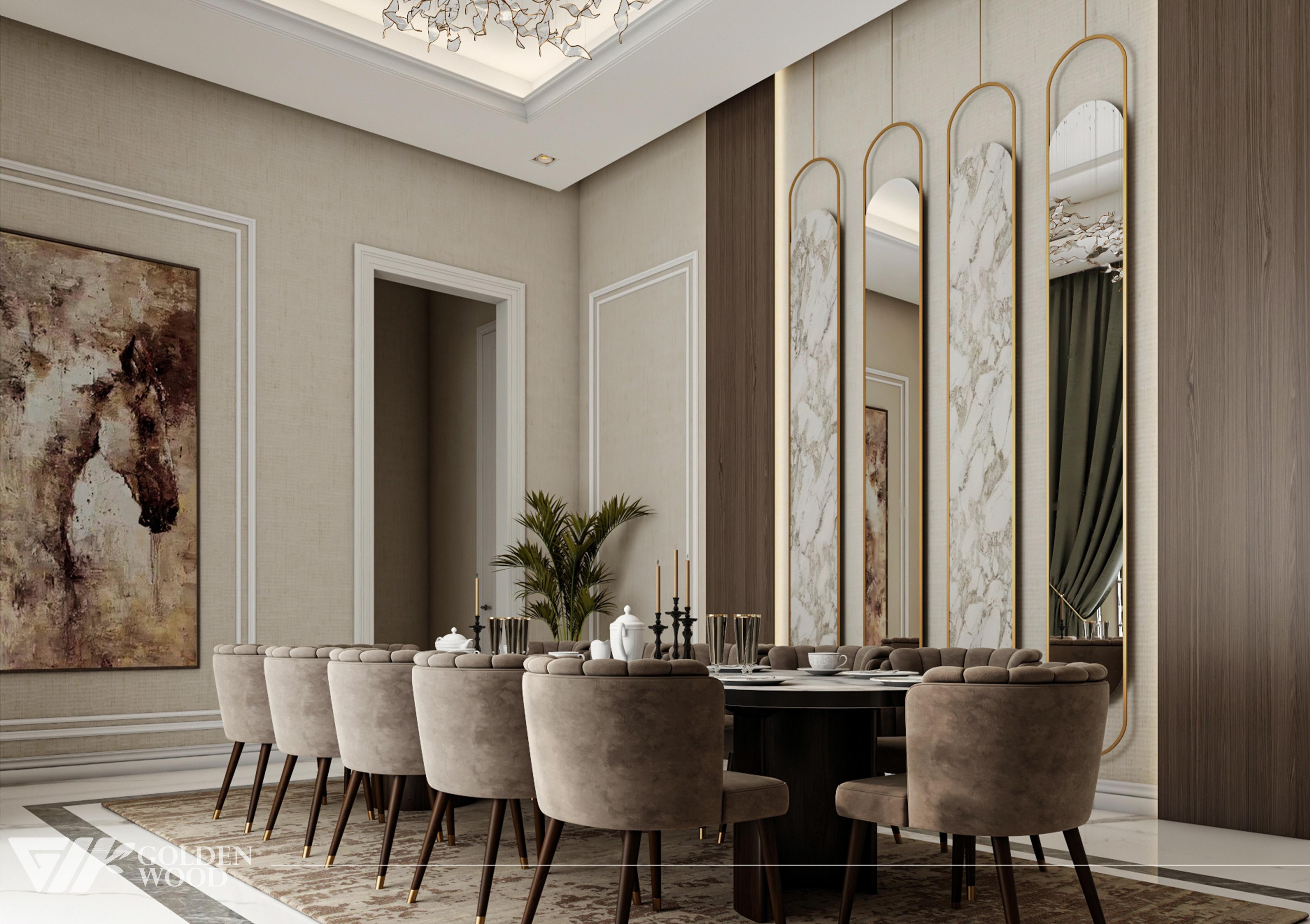 This project showcases an elegant, luxurious interior design with a sophisticated color palette of neutral tones and rich textures. The space blends contemporary and timeless elements to create a welcoming atmosphere. The entryway features a stylish mirror with warm lighting, setting the tone for the entire space. The dining room, designed for both function and aesthetic appeal, includes a grand table with exquisite tableware and artwork that enhances the ambiance. The living area is both comfortable and chic, with plush seating and a striking chandelier, balanced by the organic design of the furniture and decor. The design overall emphasizes luxury, comfort, and a sense of openness, with clean lines and minimalistic accents to highlight the beauty of the space.