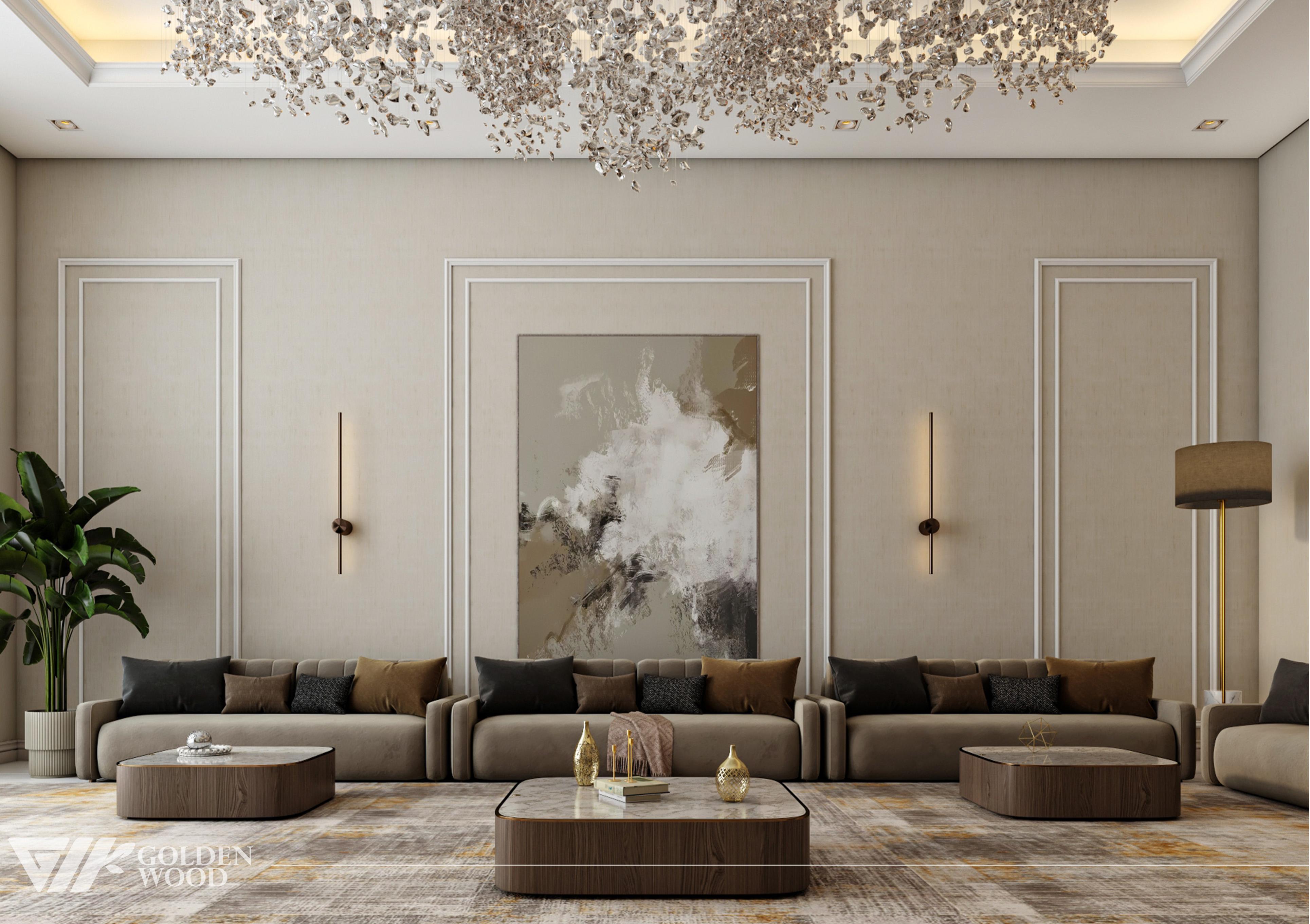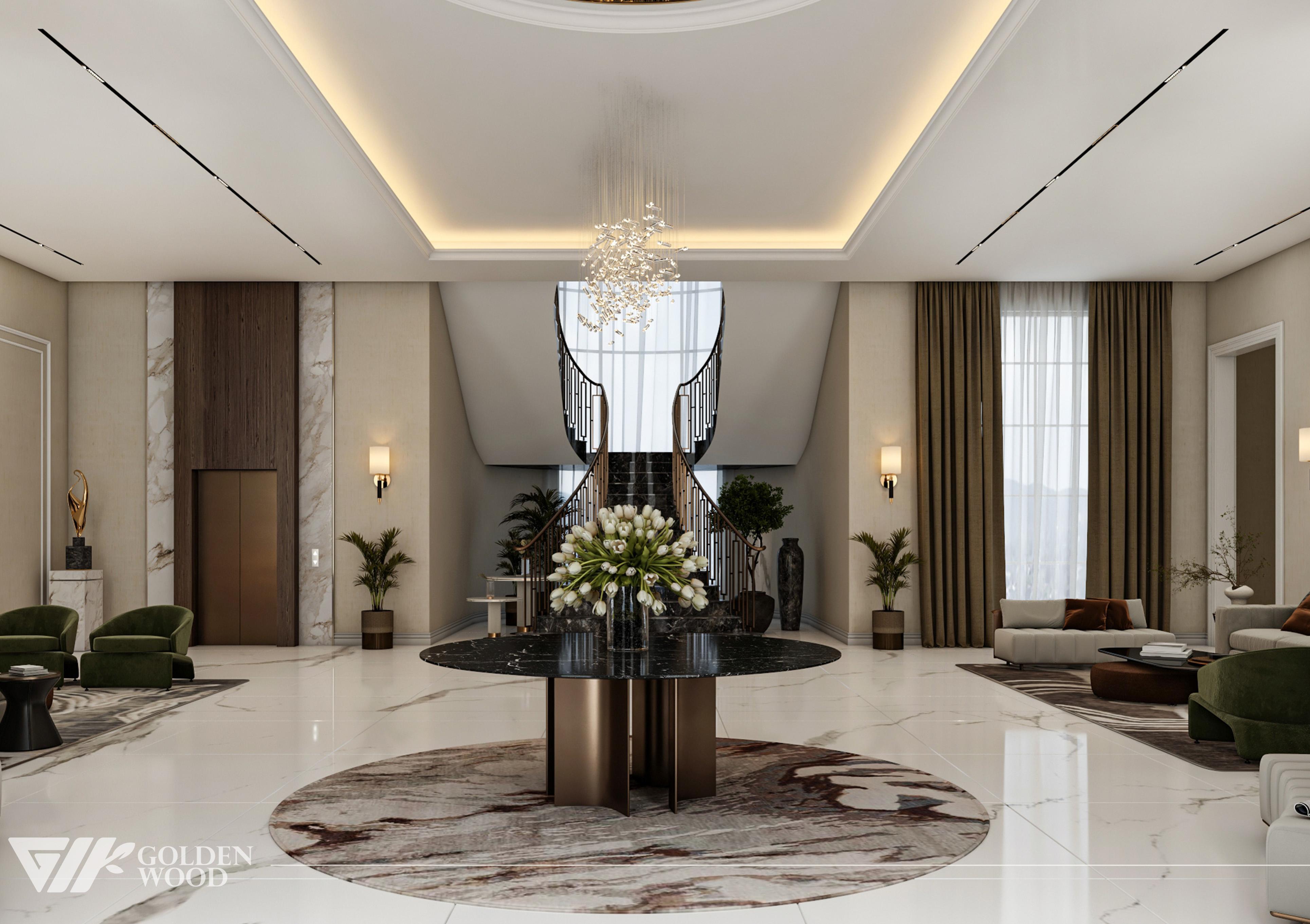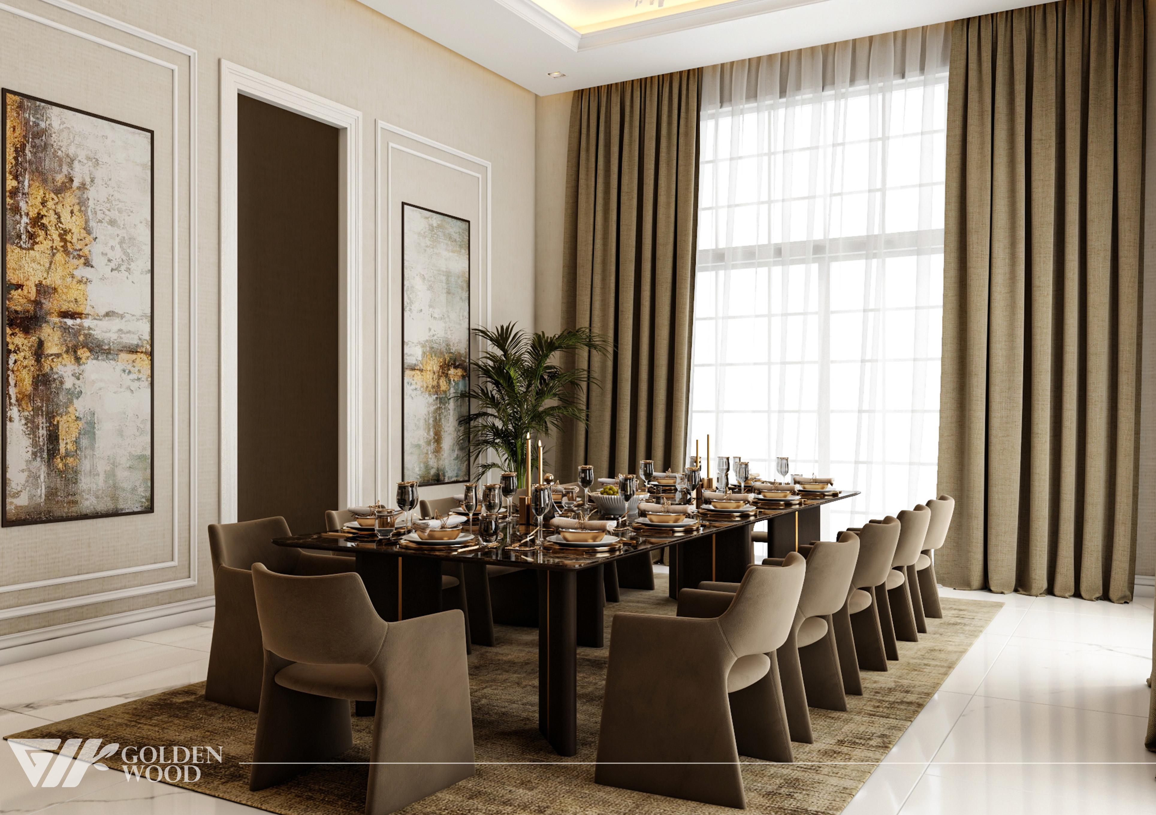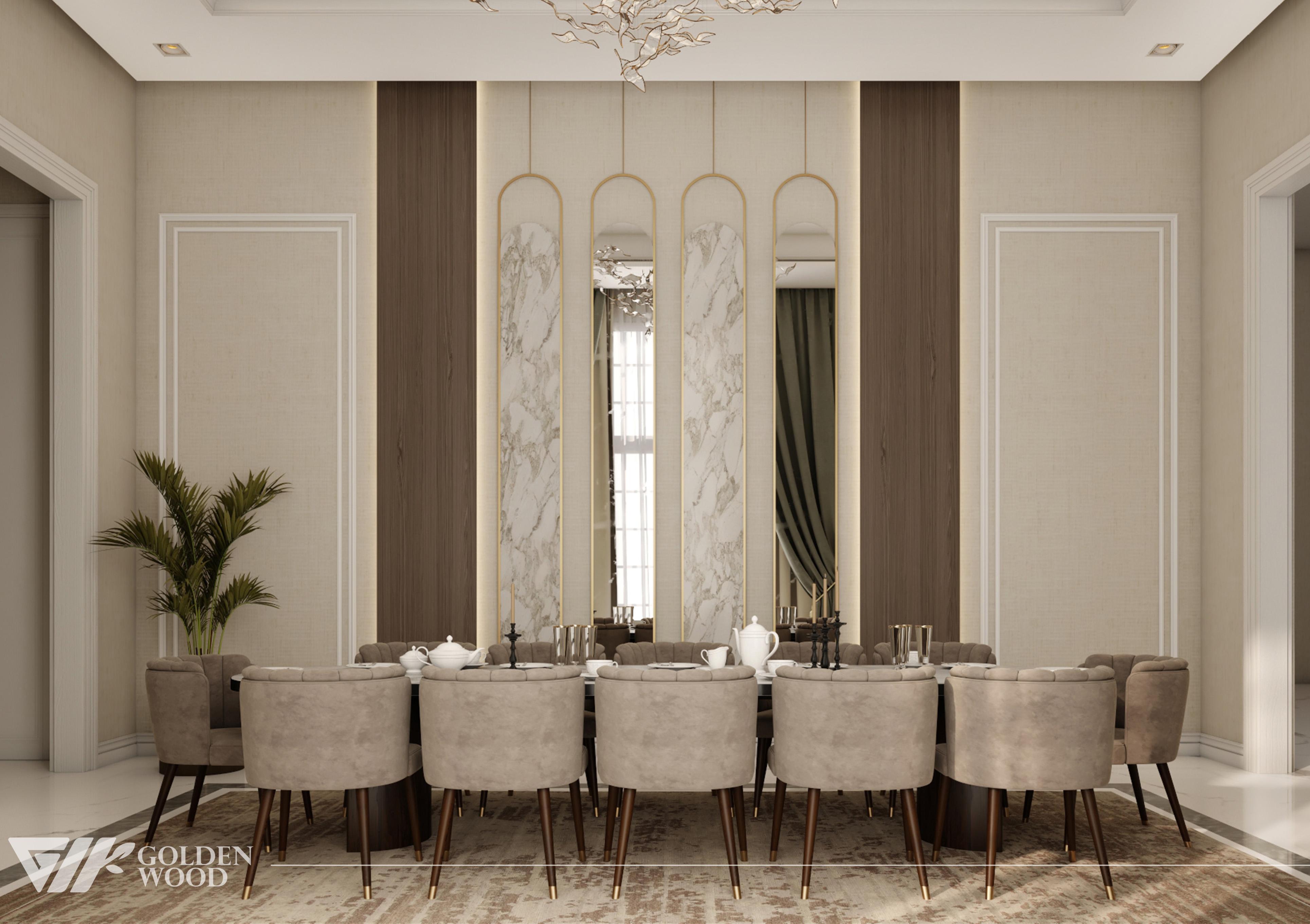 This project showcases an elegant, luxurious interior design with a sophisticated color palette of neutral tones and rich textures. The space blends contemporary and timeless elements to create a welcoming atmosphere. The entryway features a stylish mirror with warm lighting, setting the tone for the entire space. The dining room, designed for both function and aesthetic appeal, includes a grand table with exquisite tableware and artwork that enhances the ambiance. The living area is both comfortable and chic, with plush seating and a striking chandelier, balanced by the organic design of the furniture and decor. The design overall emphasizes luxury, comfort, and a sense of openness, with clean lines and minimalistic accents to highlight the beauty of the space.