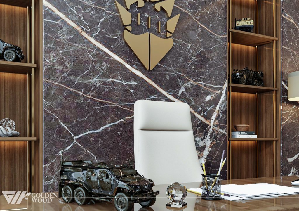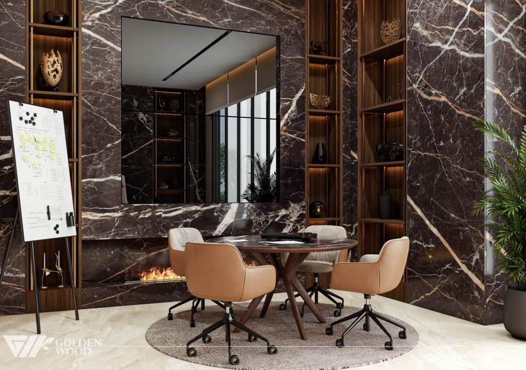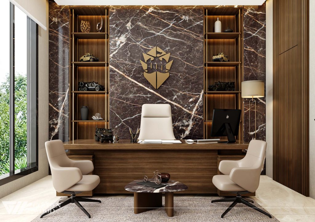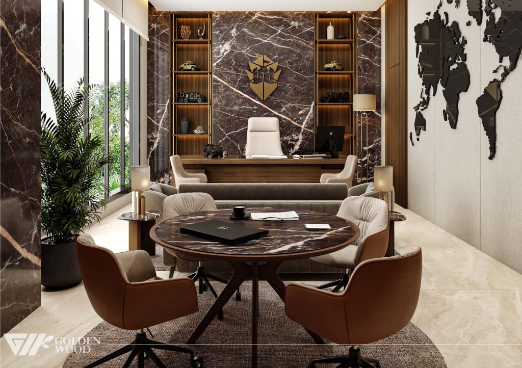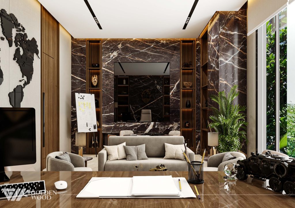 This executive office design exudes sophistication and authority through a blend of luxurious materials and refined detailing. Featuring rich marble accent walls, warm wooden finishes, and modern furnishings, the space creates a perfect balance between professionalism and comfort. The layout includes an elegant main desk area, a refined meeting corner, and a welcoming lounge setup — all enhanced by ambient lighting and thoughtful décor elements. The result is a timeless workspace that reflects prestige, functionality, and contemporary elegance.