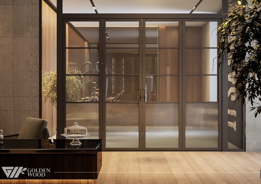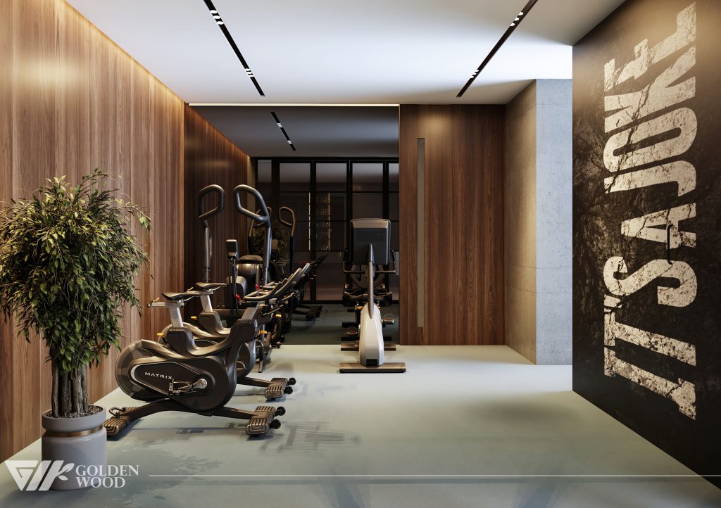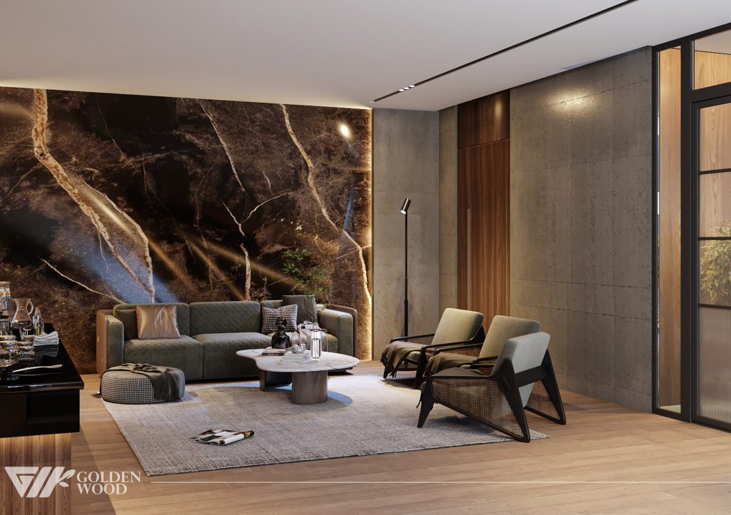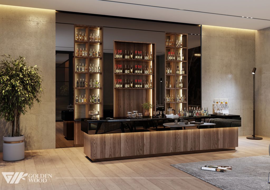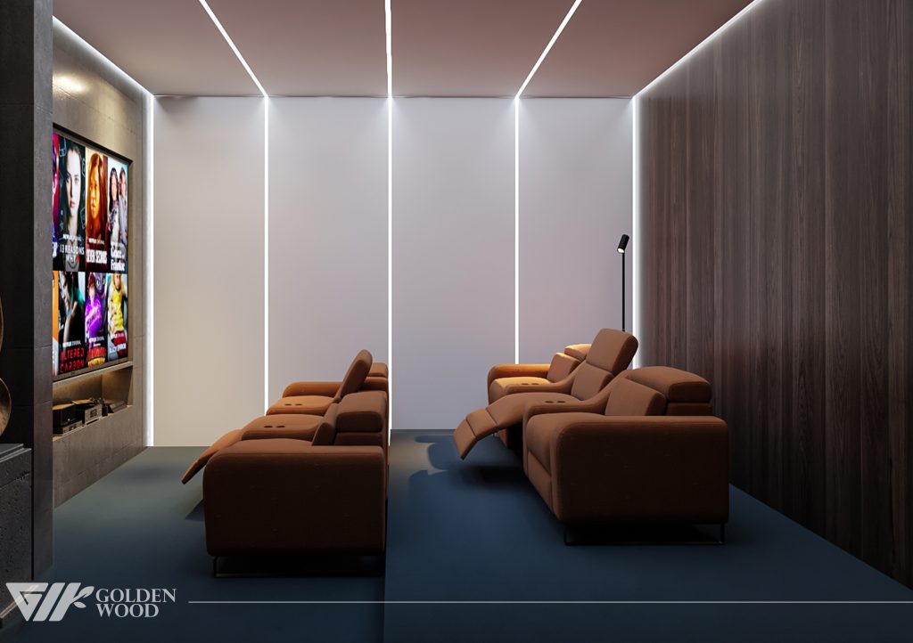 The Palm Jumeirah Project interior showcases a refined modern luxury concept designed by Golden Wood. The space features a private cinema with plush reclining seats, a sophisticated bar area with illuminated wooden shelving, and an elegant lounge accented by a striking marble feature wall. Warm lighting, premium materials, and a harmonious blend of wood and stone textures create an inviting atmosphere that perfectly balances comfort and elegance.