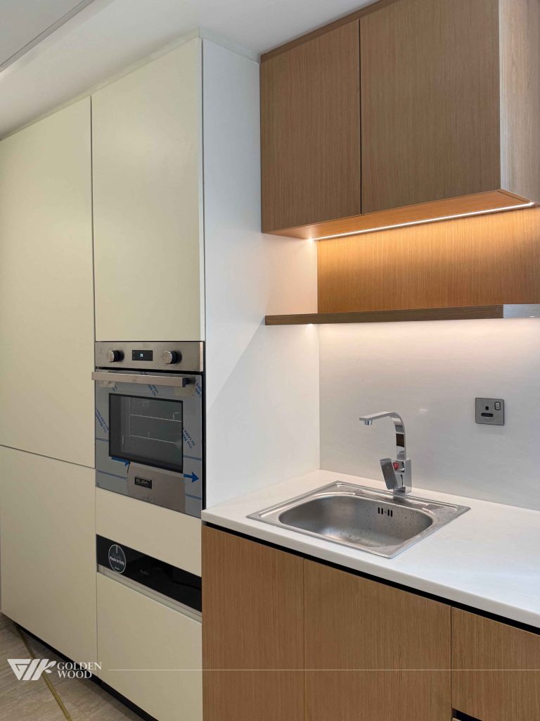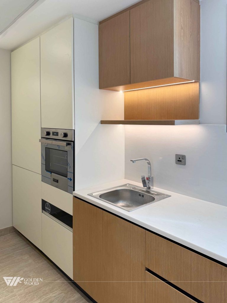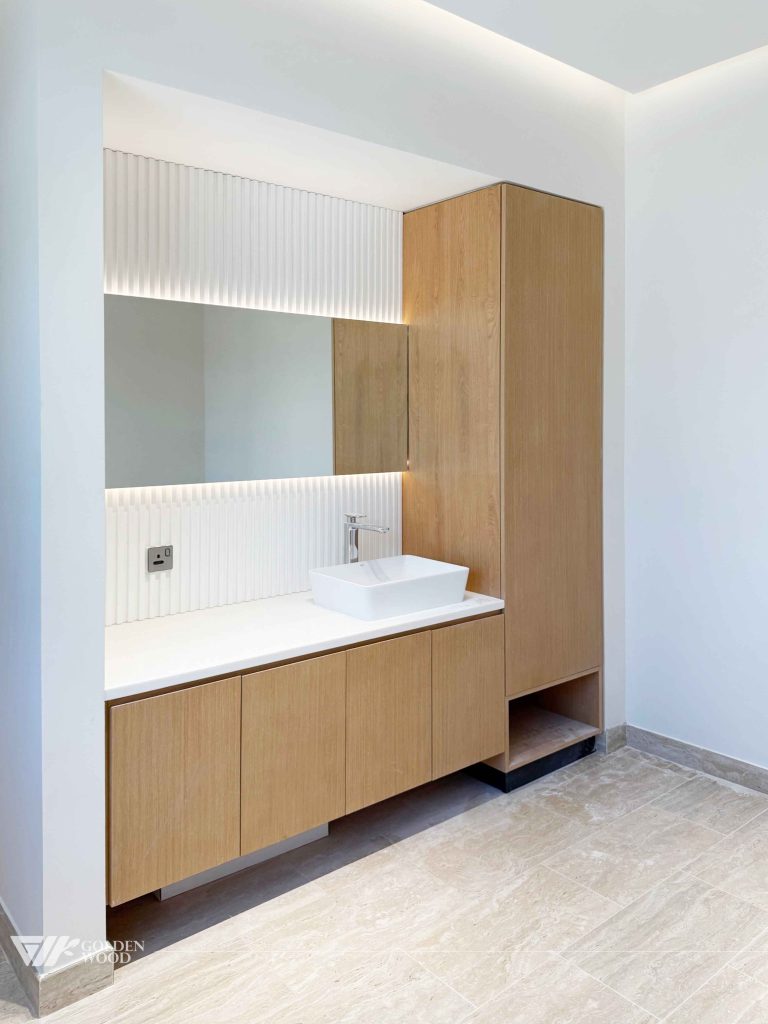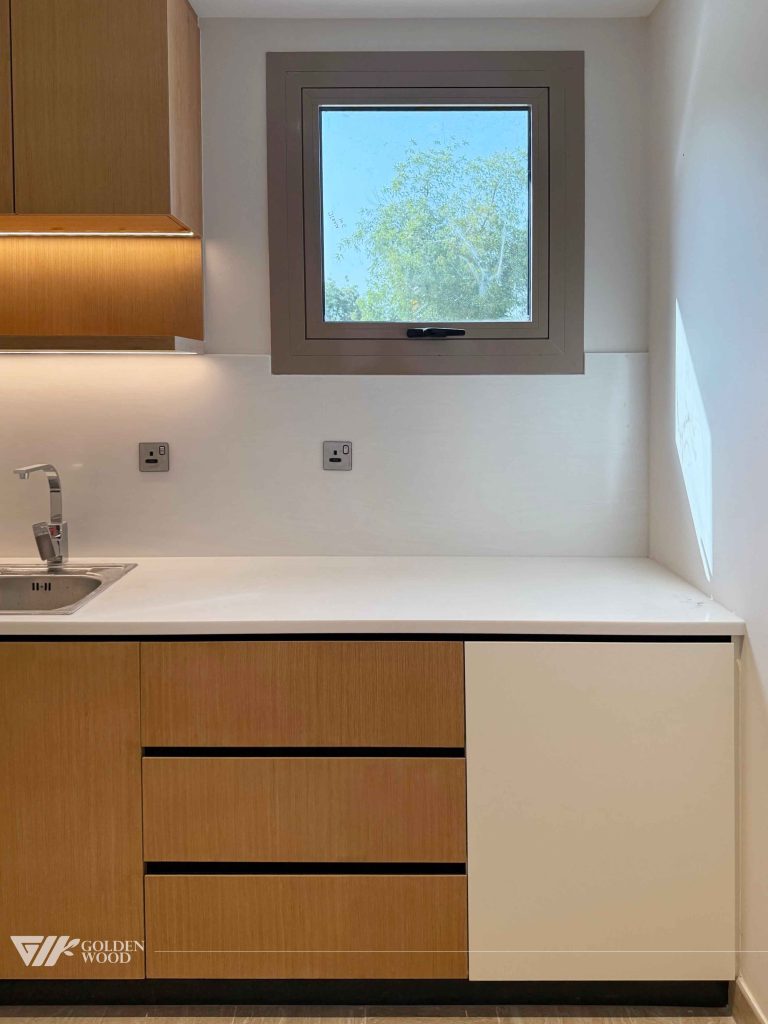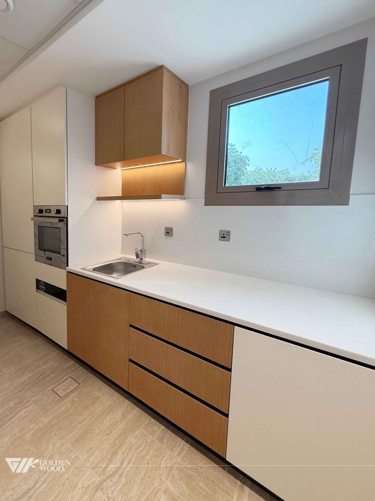 This villa, GW24-681 Padel Tennis & Ground Villa, showcases a blend of modern elegance and functional design. The interiors feature a harmonious mix of wood and white cabinetry, with clean lines and high-end finishes. The kitchen is equipped with built-in appliances, seamlessly integrated into the cabinetry, creating a minimalist yet highly efficient workspace. The use of light oak wood and neutral tones throughout the home contributes to a serene atmosphere, complemented by ample natural light from large windows. The villa is also designed with carefully thought-out storage solutions and stylish bathrooms, focusing on both form and function. Ideal for those who appreciate contemporary aesthetics with a touch of warmth, this villa is the perfect example of luxury living with comfort and style.