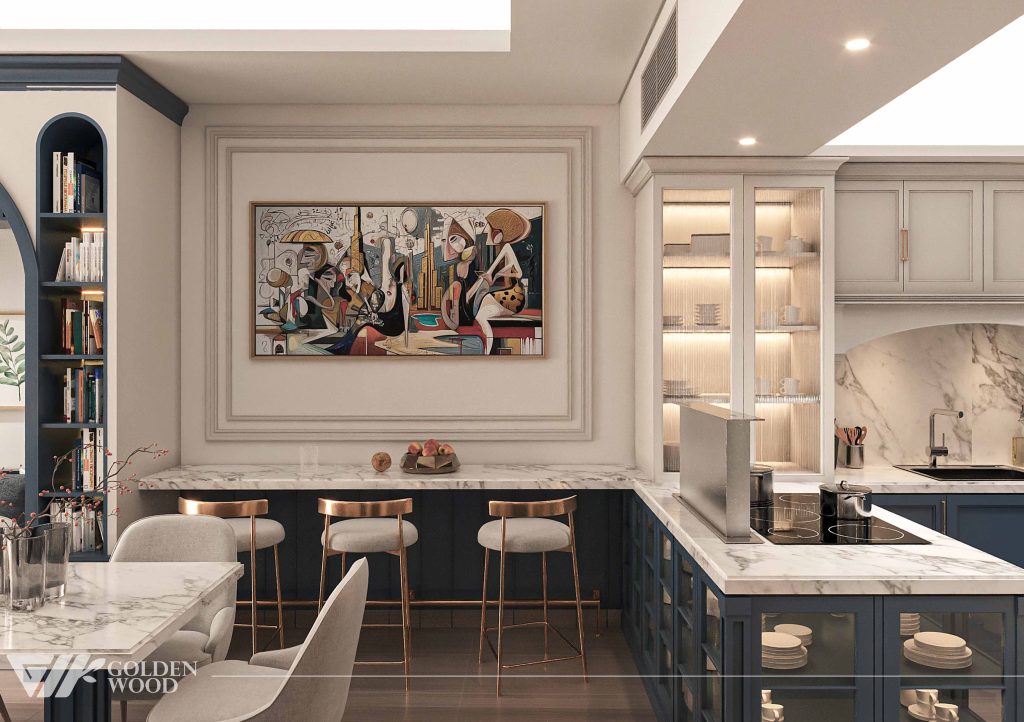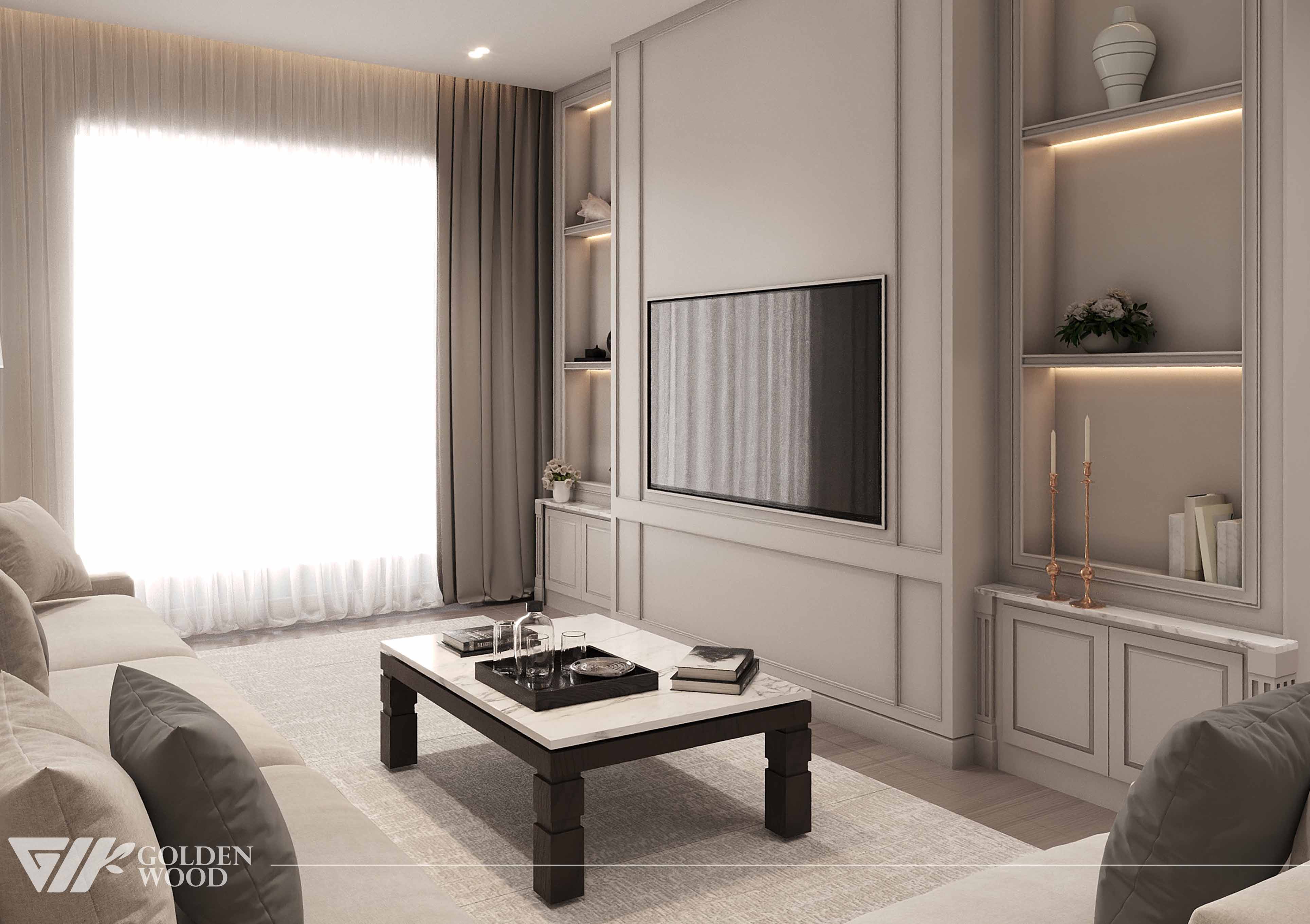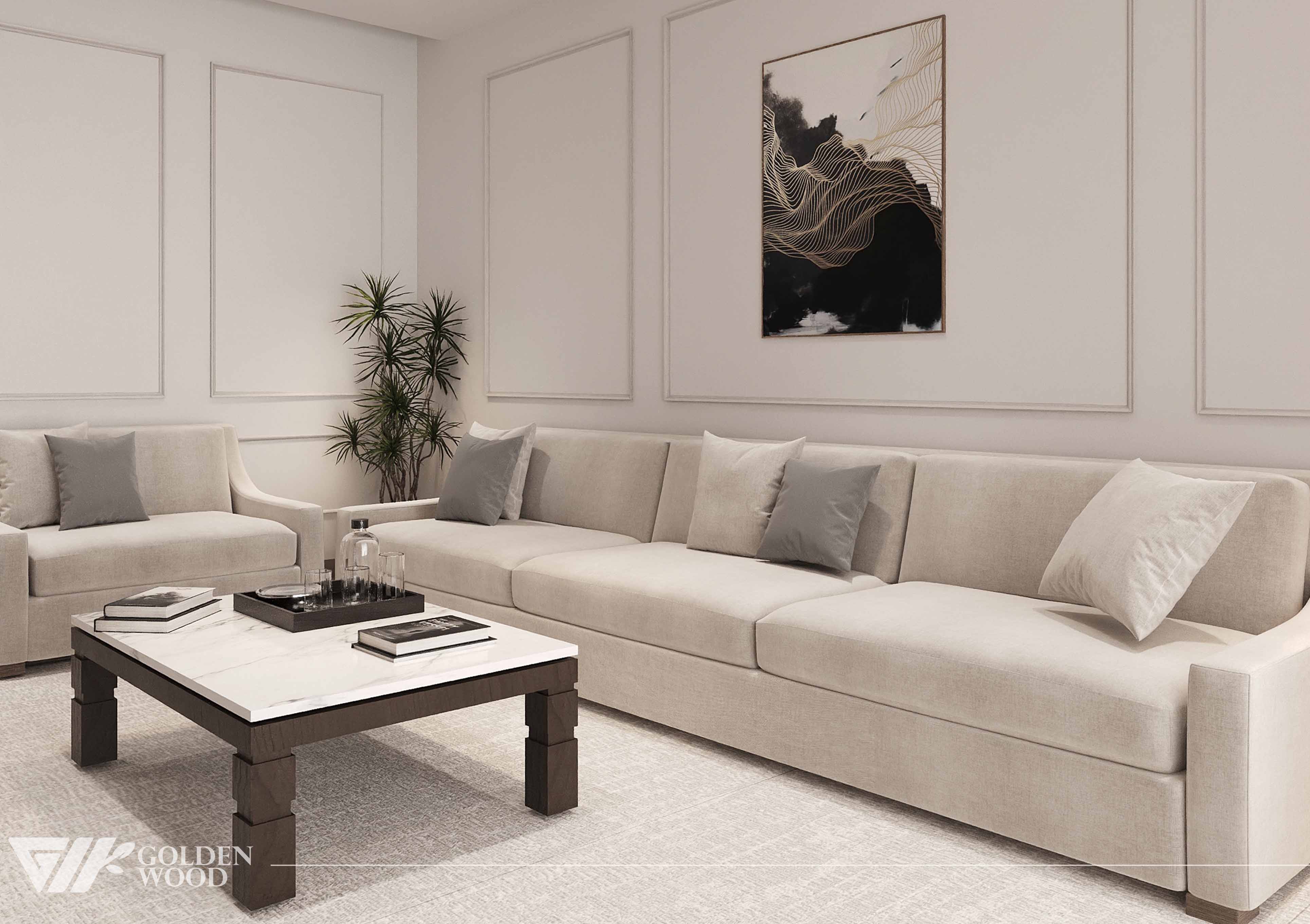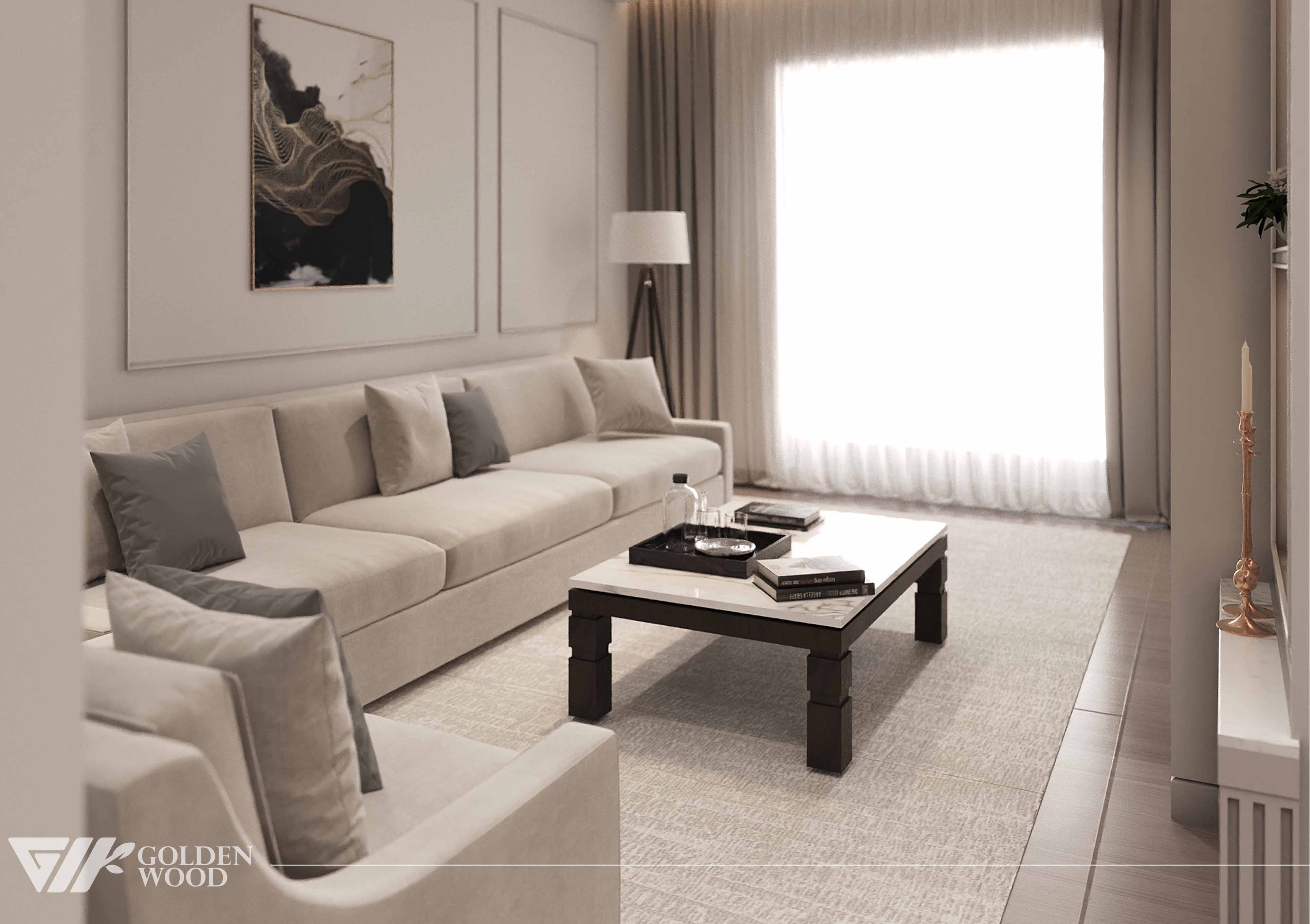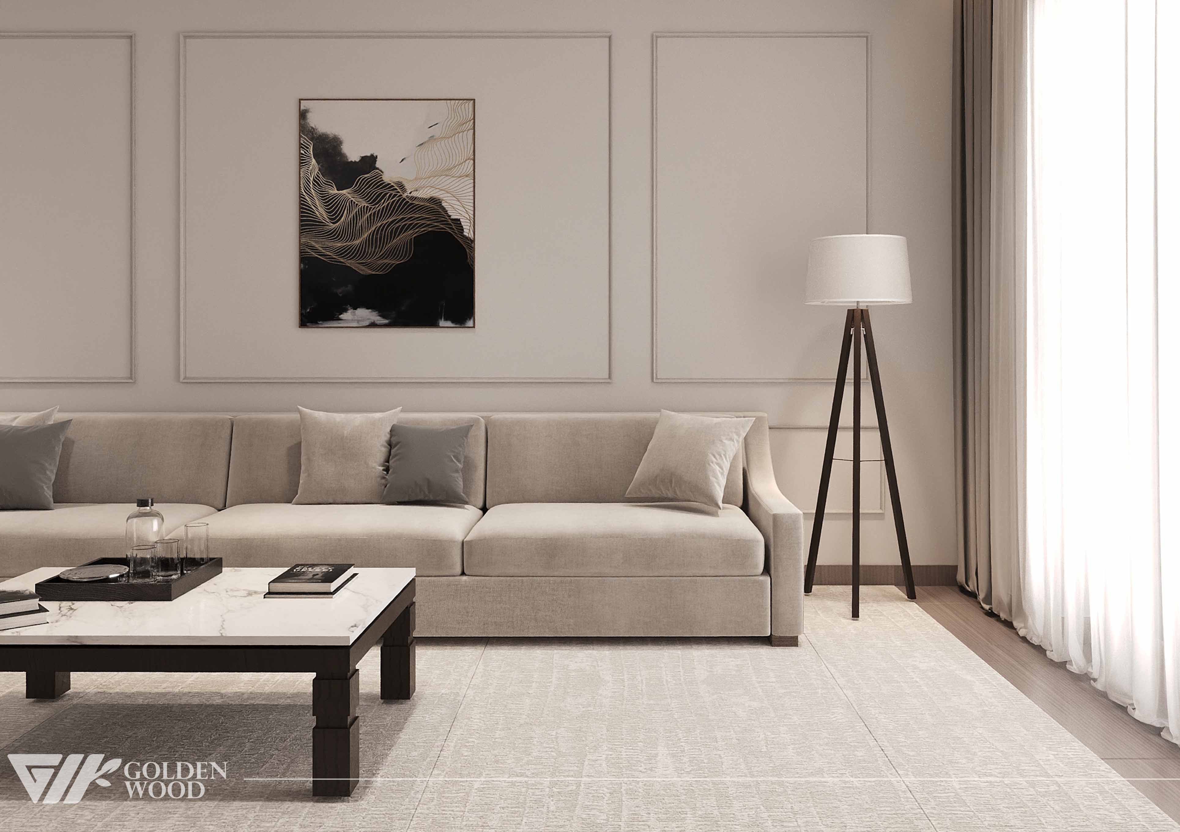 This refined living room design blends minimalist sophistication with cozy comfort. A long beige sectional sofa anchors the space, adorned with neutral-toned throw pillows that enhance its inviting appeal. The centerpiece is a rectangular coffee table with a white marble top and dark wooden legs, styled with a tray, glass bottle, and curated books. Above the sofa, a striking abstract artwork in black, white, and gold adds visual interest, framed by subtle wall paneling. Natural light filters through sheer curtains, complemented by a tall tripod floor lamp that casts a warm glow. The soft, textured rug and harmonious color palette create a tranquil atmosphere ideal for modern living.