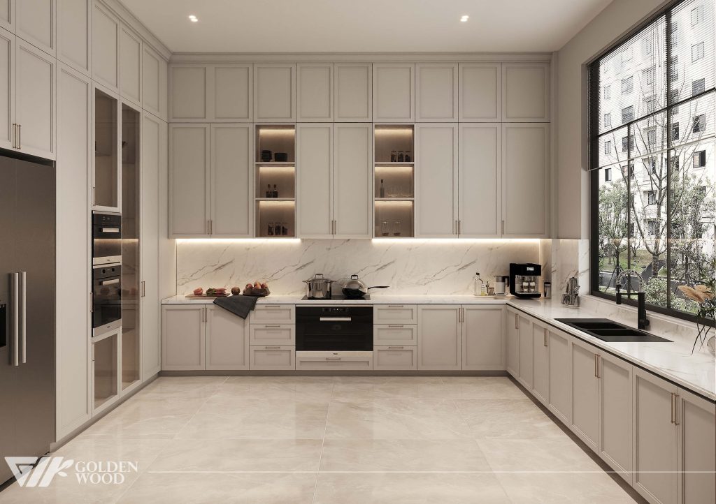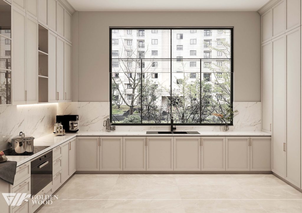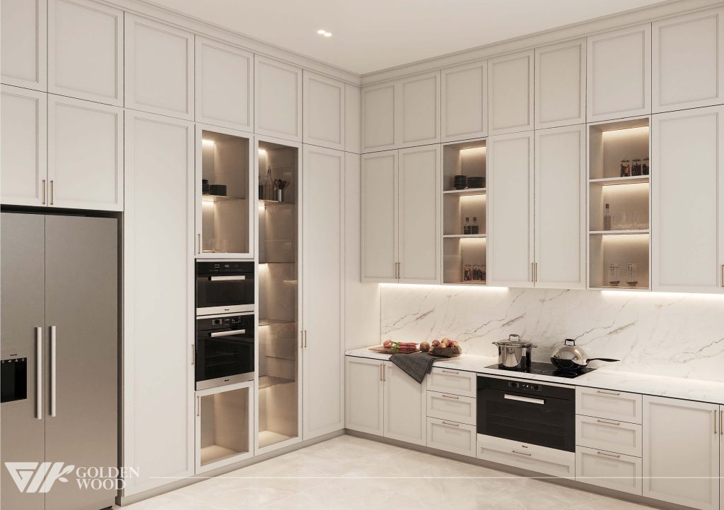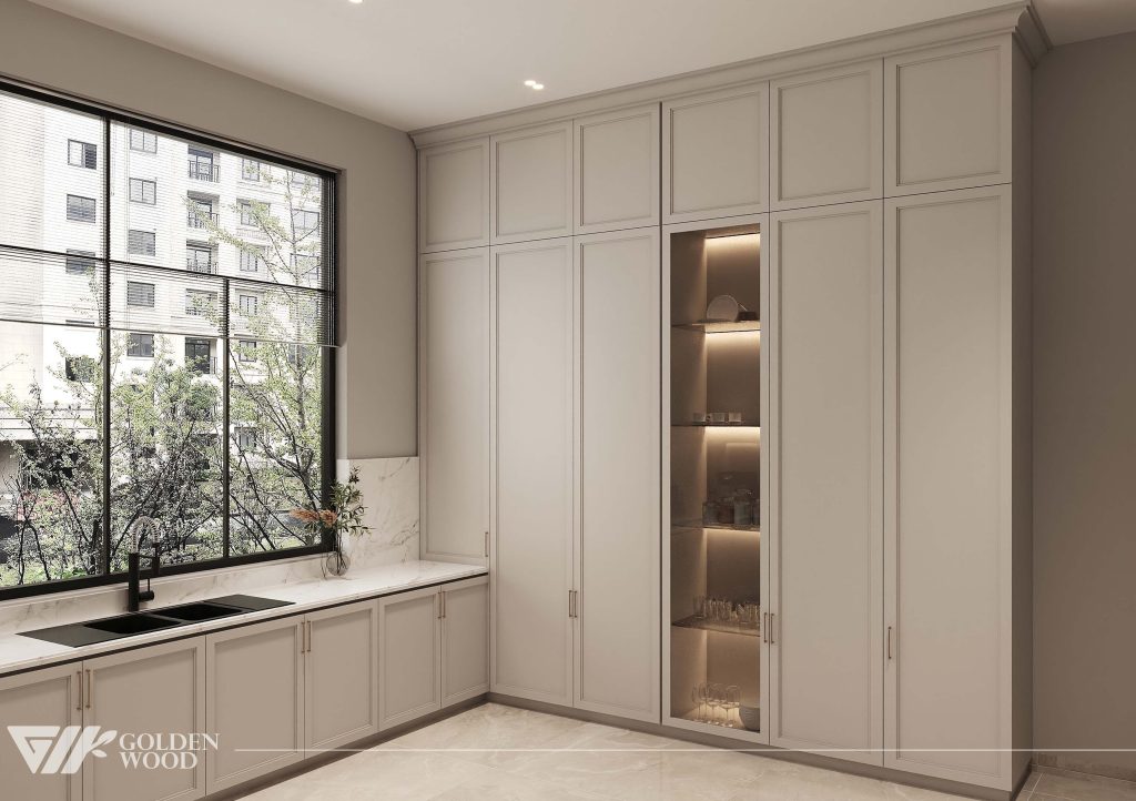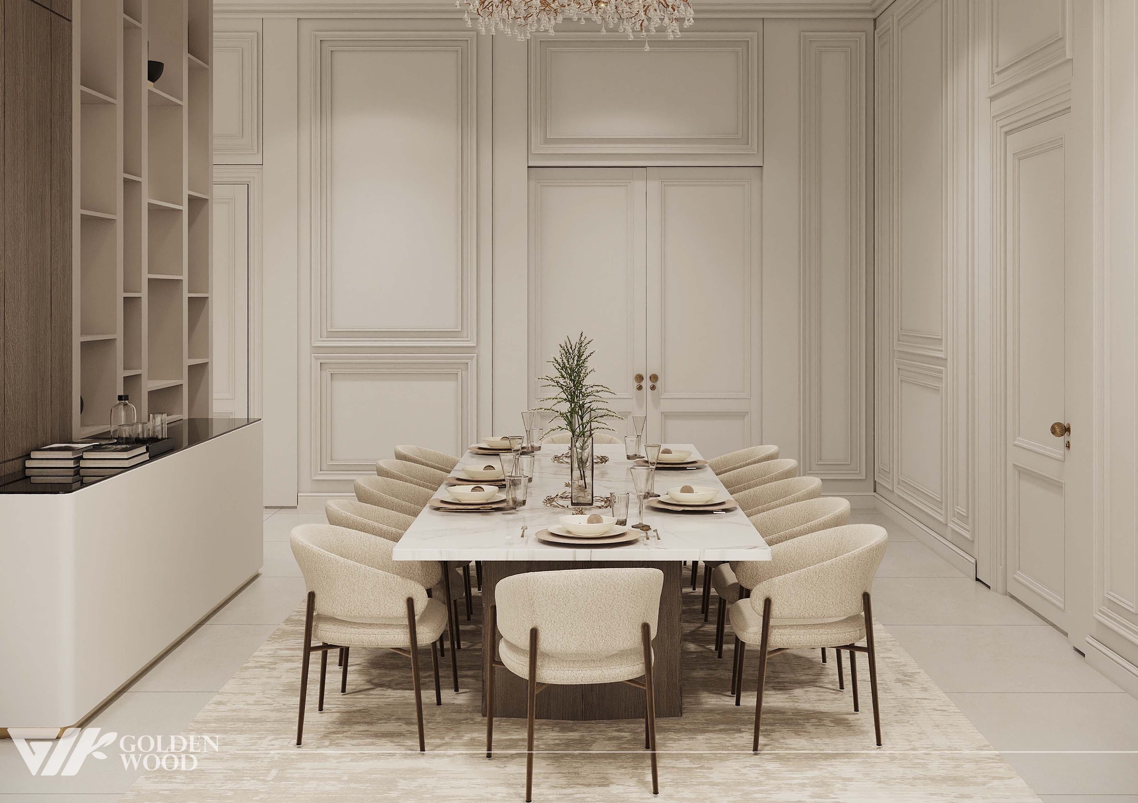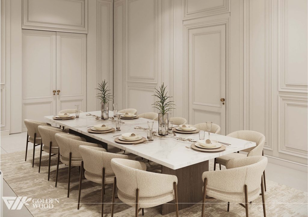 This luxurious dining room showcases refined elegance through a harmonious blend of classic detailing and modern sophistication. At its center is a long rectangular dining table with a polished white marble surface and a sturdy wooden base, surrounded by twelve upholstered chairs in soft beige fabric. Each place setting is meticulously arranged with coordinated tableware and glassware atop round placemats, reflecting thoughtful design and hospitality. A pair of tall glass vases filled with lush green foliage and a minimalist branch arrangement run along the center, adding organic texture. The high walls feature intricate panel molding in a soft cream tone, complemented by double doors with brass handles. A light-toned area rug anchors the space, enhancing the serene and inviting atmosphere—perfect for grand gatherings and intimate celebrations alike.
