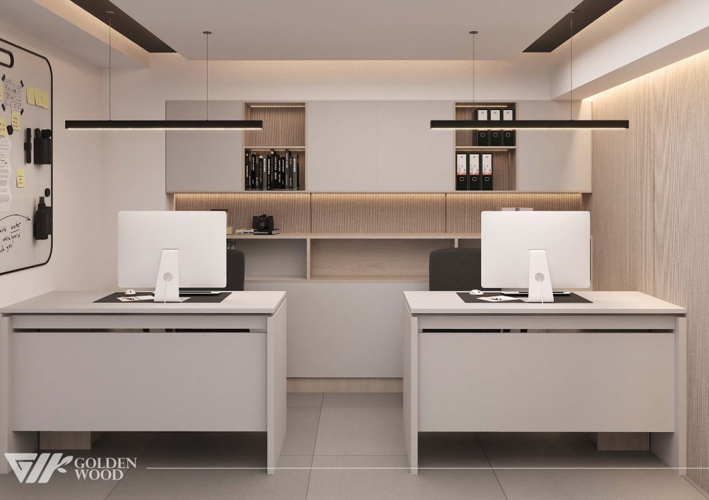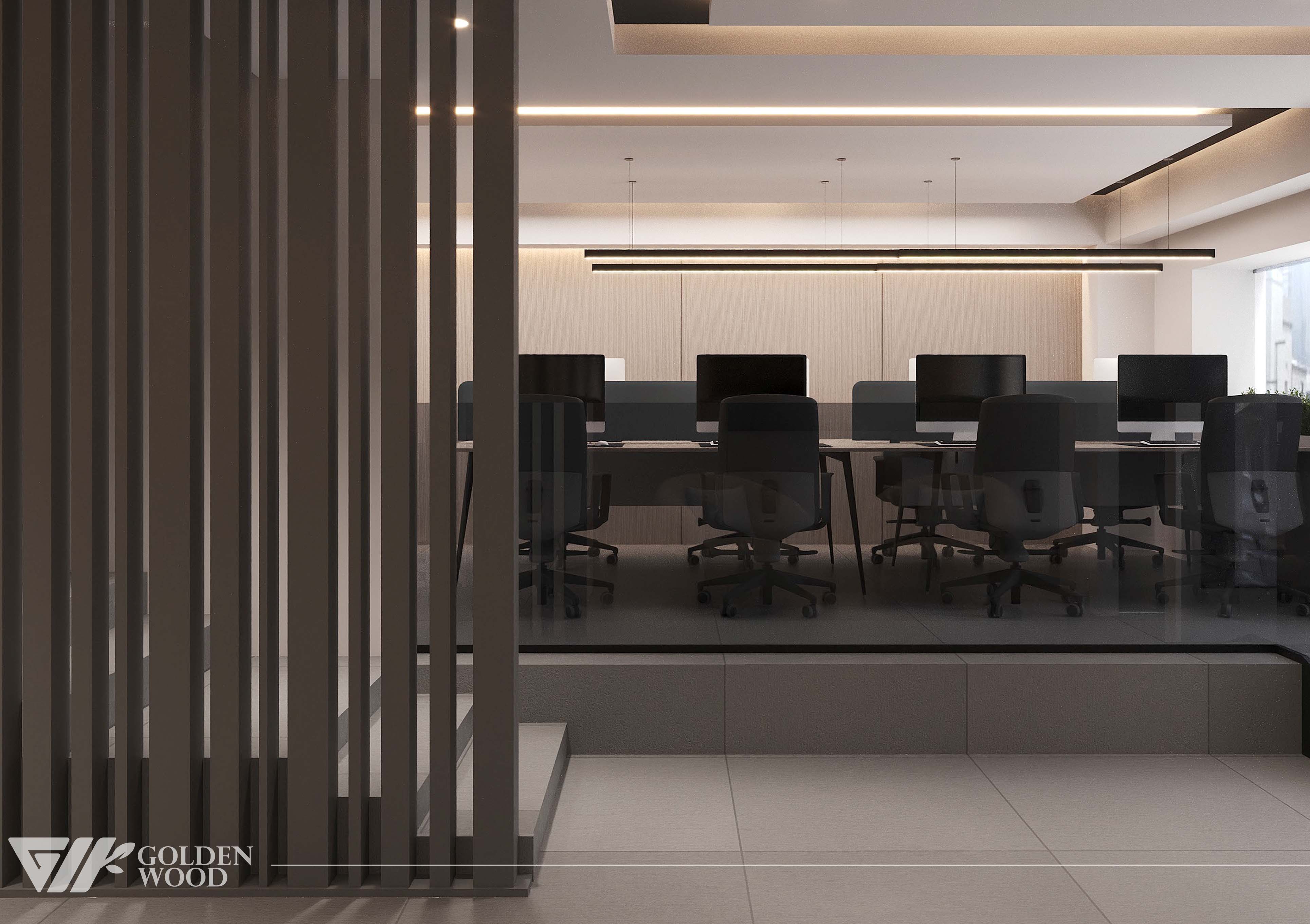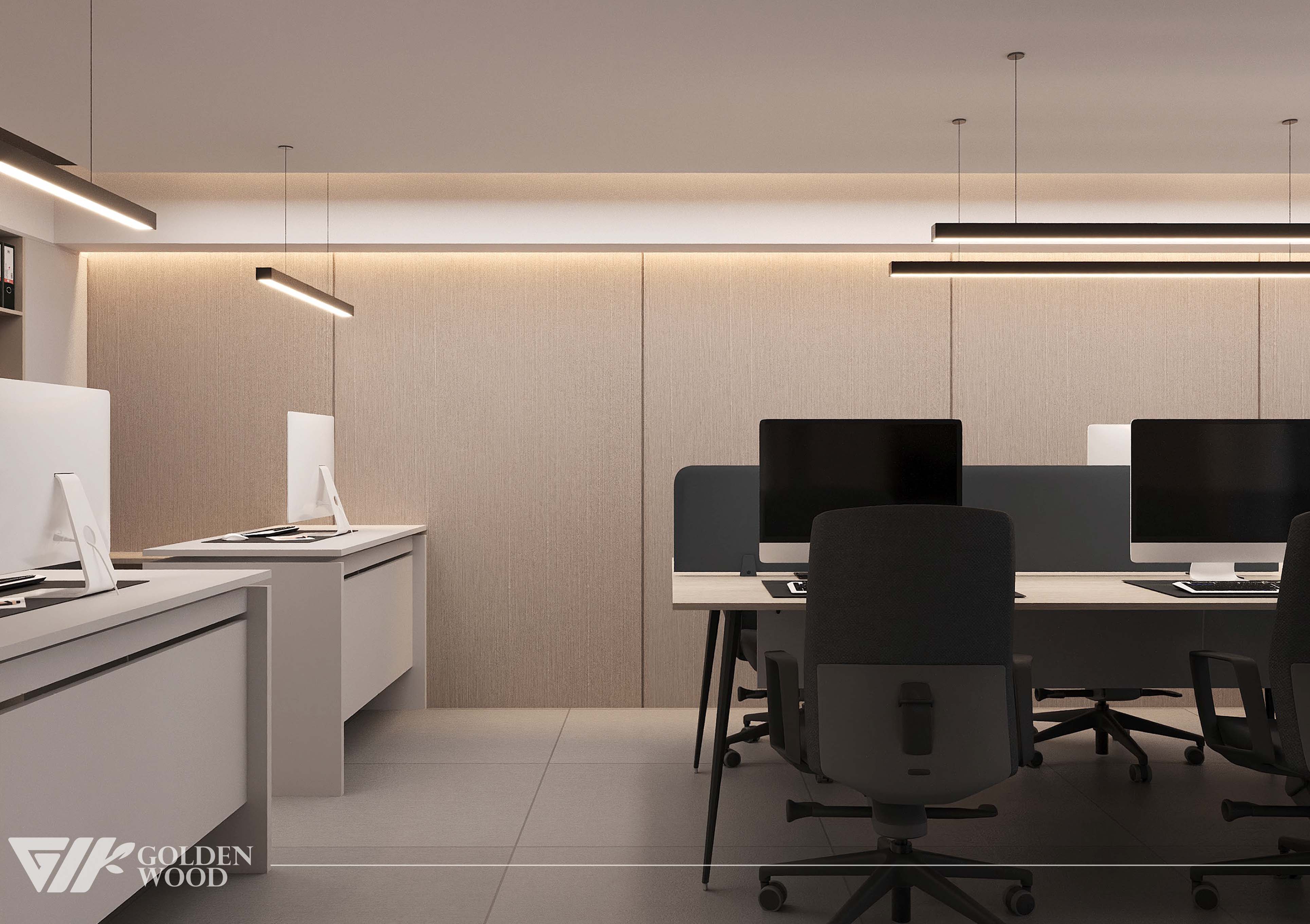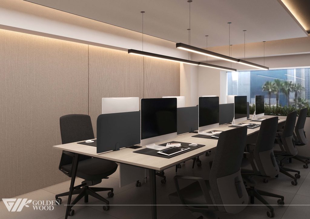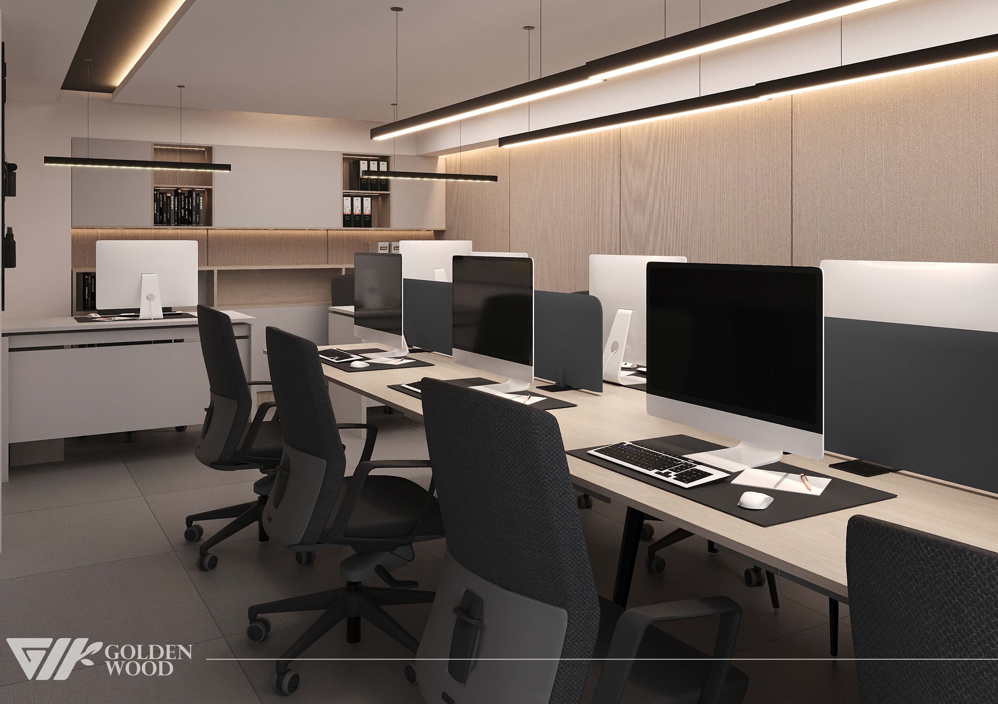This modern office interior exemplifies minimalist design and efficient layout. A long shared desk accommodates multiple workstations, each equipped with large monitors, ergonomic chairs, and privacy panels to balance collaboration with individual focus. Sleek pendant lights overhead provide clean, even illumination, while the neutral color palette of gray, beige, and white enhances the professional ambiance. Built-in cabinetry and shelves along the back wall offer organized storage for binders and supplies, contributing to a tidy and functional environment. The tiled flooring and streamlined furnishings complete the look, making this workspace ideal for productivity in a contemporary setting.