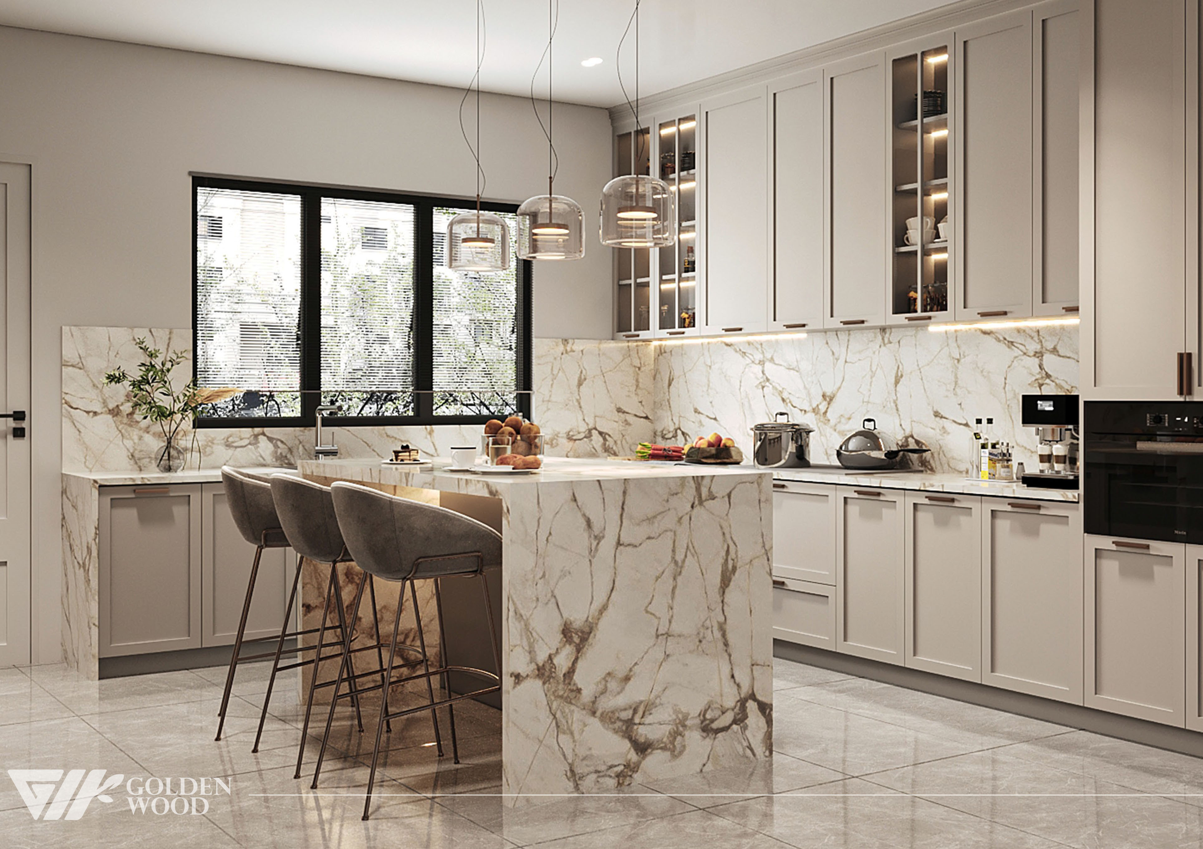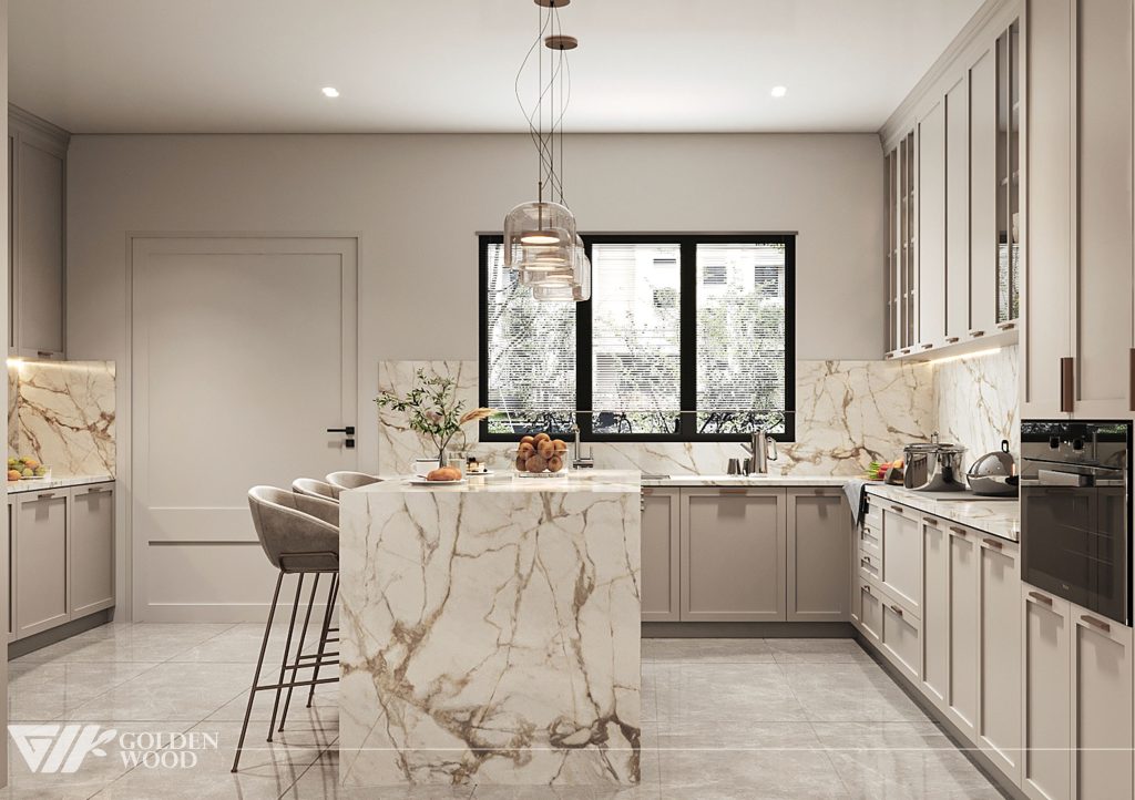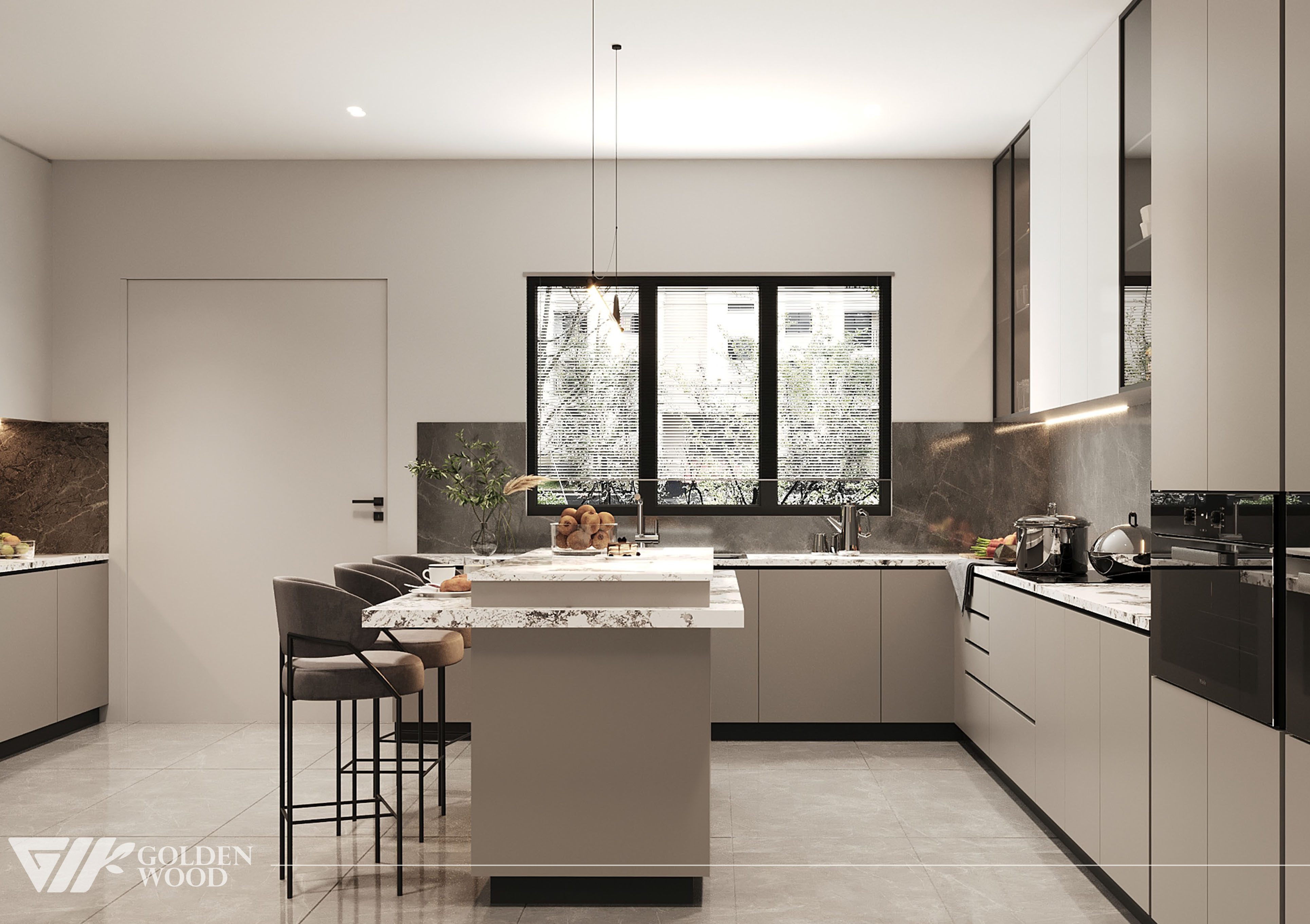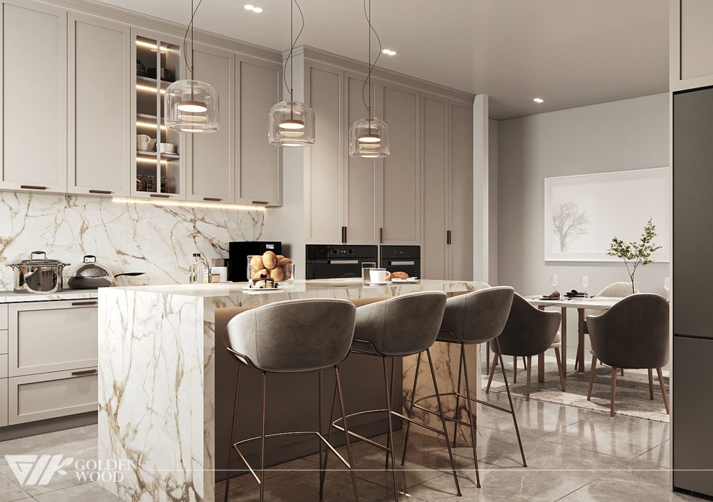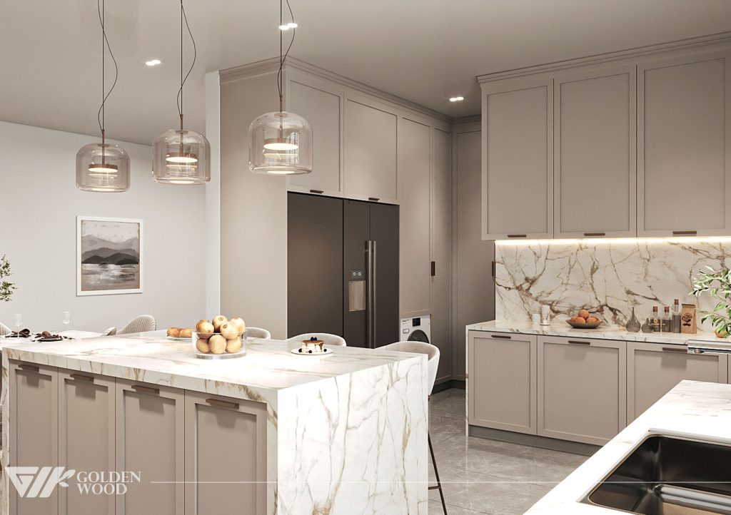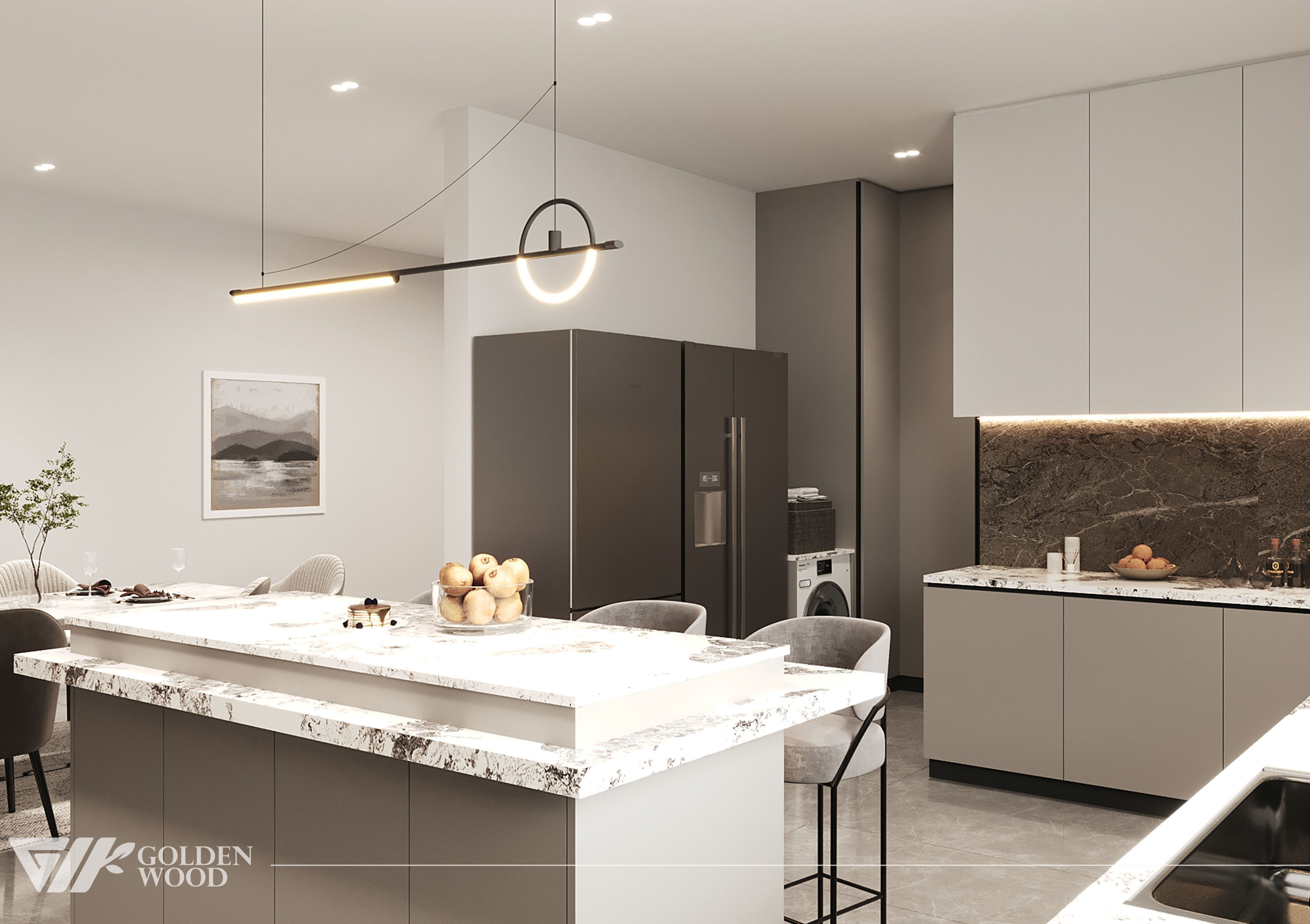 Golden Wood presents Marbella Project, a curated collection of contemporary kitchen interiors that blend minimalist elegance with functional sophistication. Each design features seamless cabinetry in soft neutral tones, complemented by bold marble countertops and backsplashes that serve as the visual centerpiece. Integrated lighting, high-end appliances, and refined material palettes elevate the ambiance, while thoughtful layouts ensure ergonomic flow and everyday practicality. From waterfall islands to ambient pendant lighting, Marbella Project redefines modern luxury for residential and hospitality spaces.