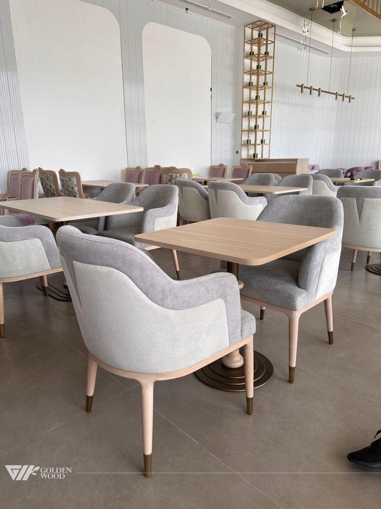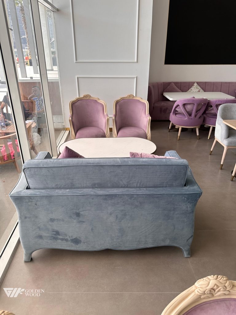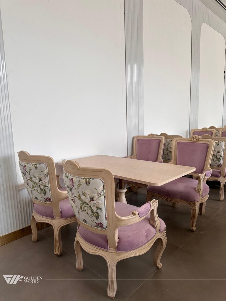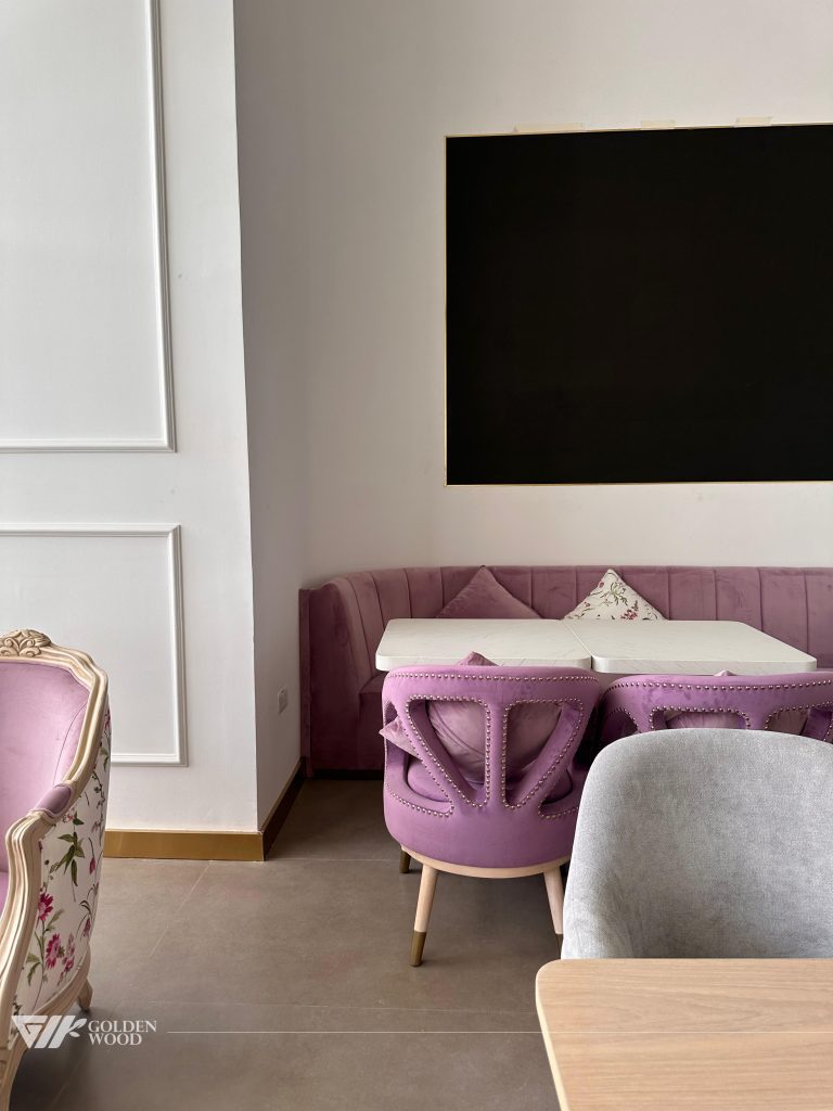 GW23-191 Laylak Restaurant by Golden Wood is a beautifully designed space that exudes elegance and sophistication. The interiors feature a soft, luxurious color palette with plush velvet chairs in shades of purple and gray, complemented by delicate floral patterns. The space combines classic and contemporary styles, with ornate wooden furniture and modern light fixtures that enhance the ambiance. Laylak offers a warm and inviting atmosphere, perfect for an exquisite dining experience. Every detail, from the furniture to the lighting, reflects Golden Wood’s commitment to creating refined, stylish, and comfortable environments.
