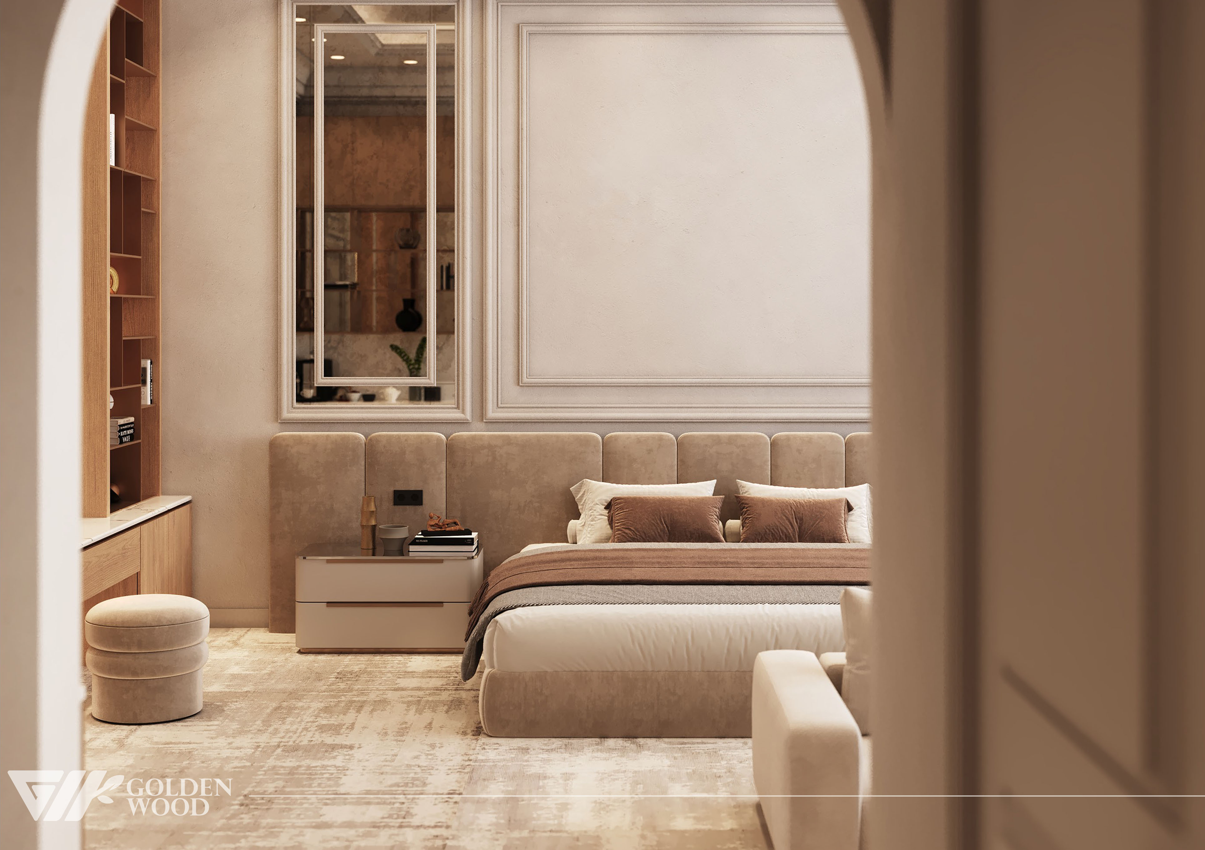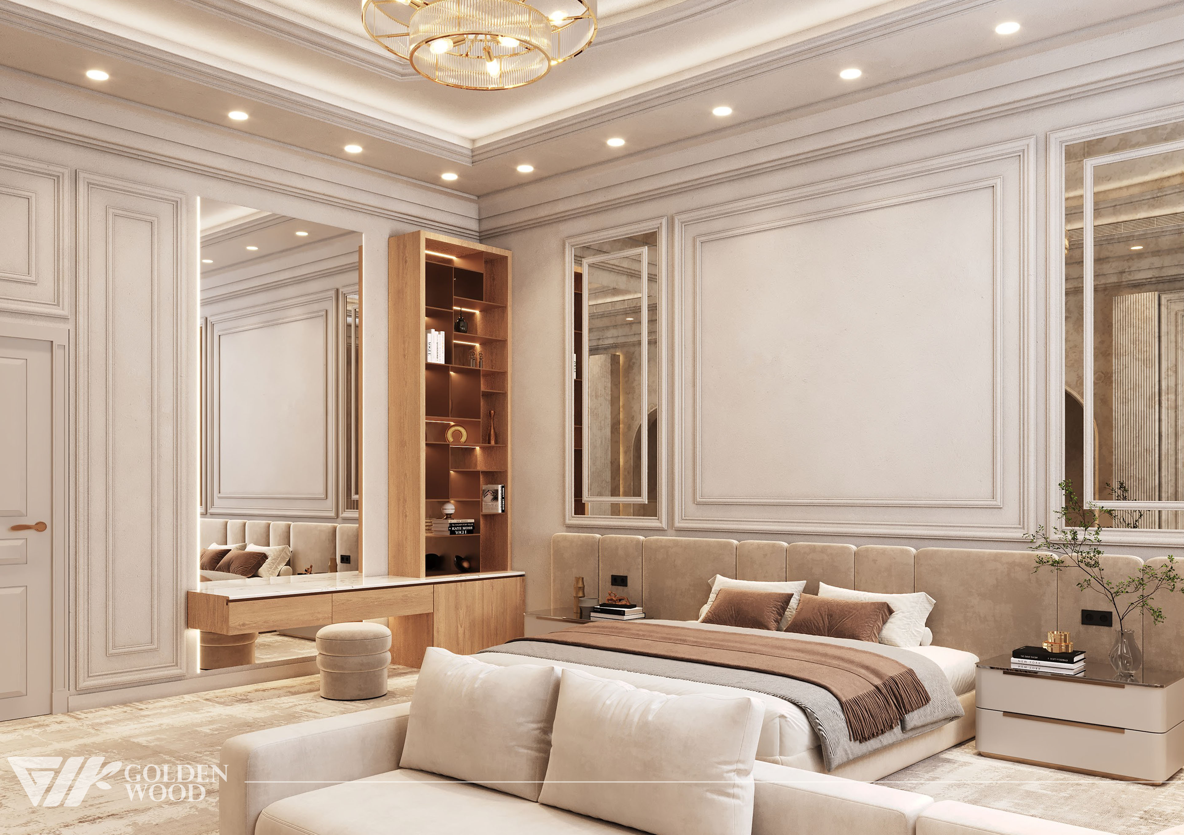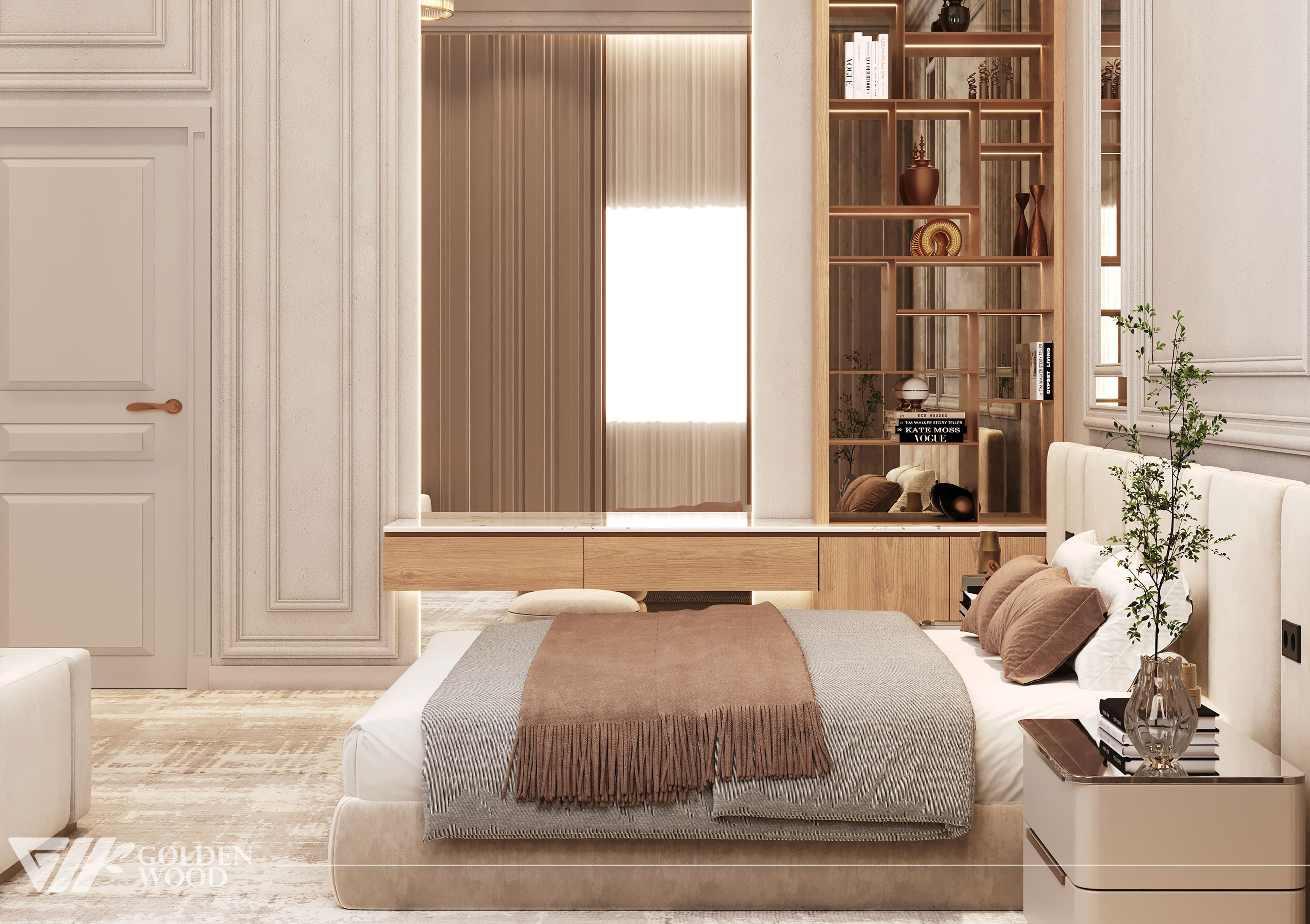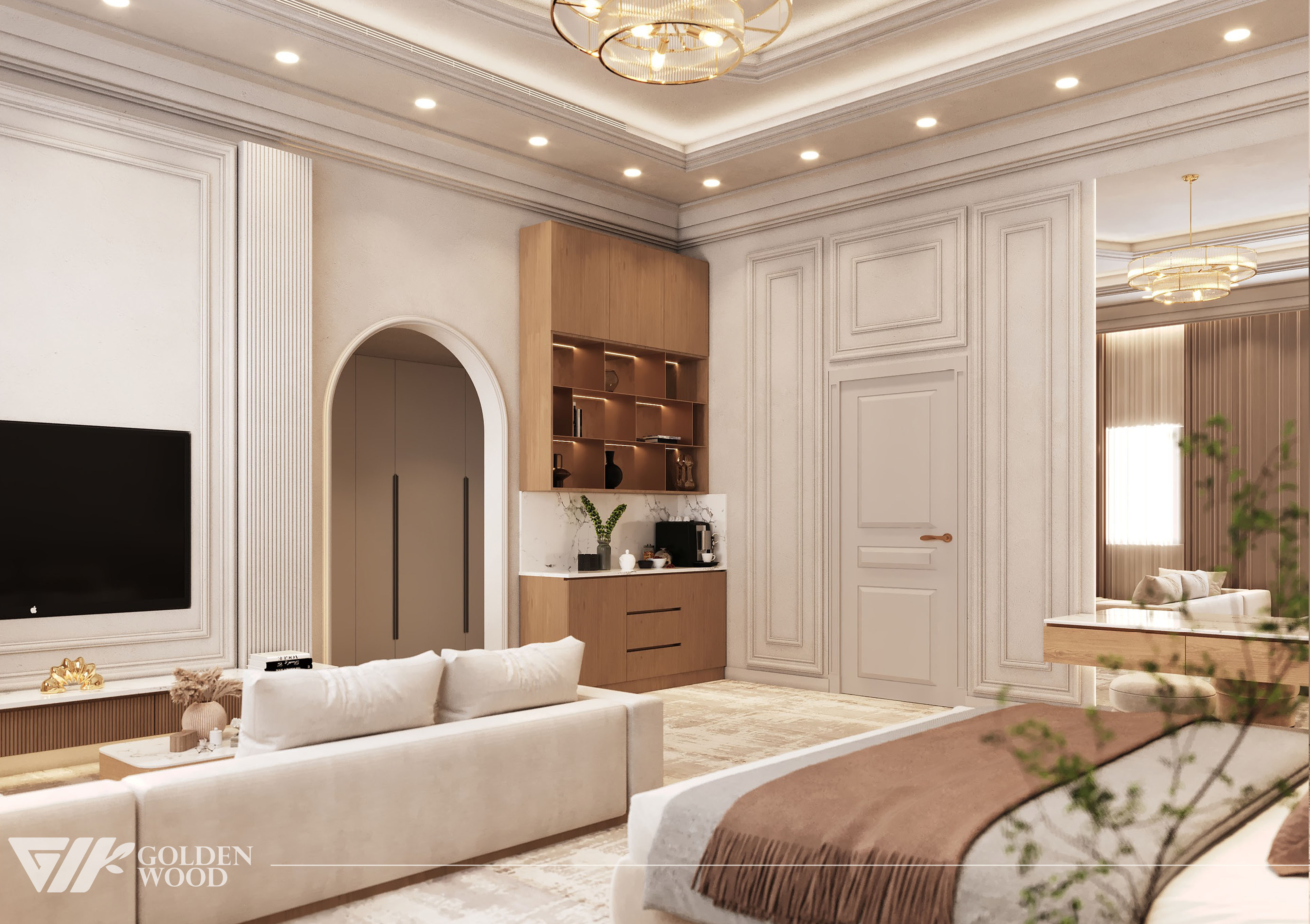 Methaa Project showcases a seamless blend of classic elegance and modern sophistication. The soft beige palette, warm wood accents, and refined detailing create a serene and luxurious ambiance. Thoughtfully designed lighting and built-in shelving add both function and aesthetic appeal, making every corner of the space feel cohesive, calm, and timeless.