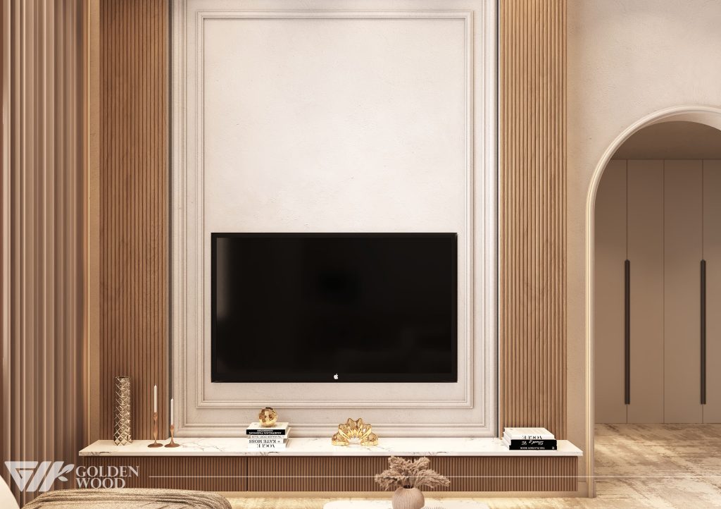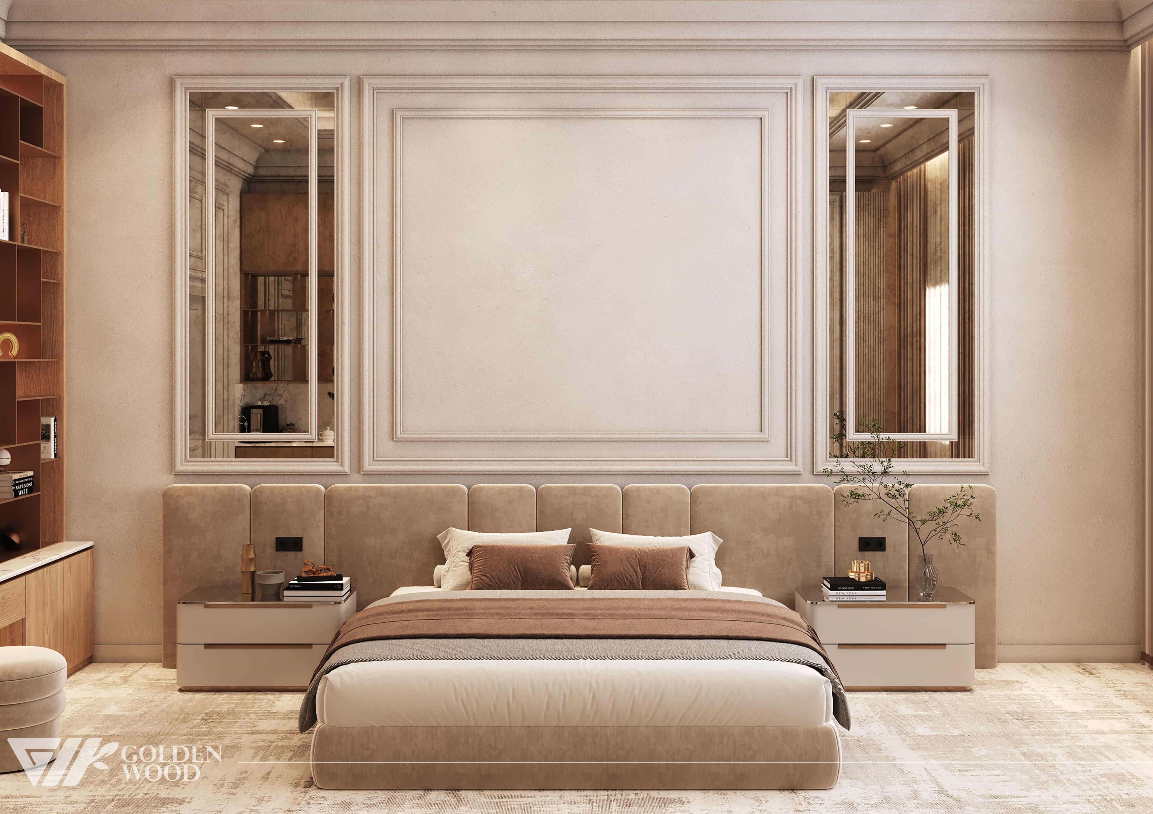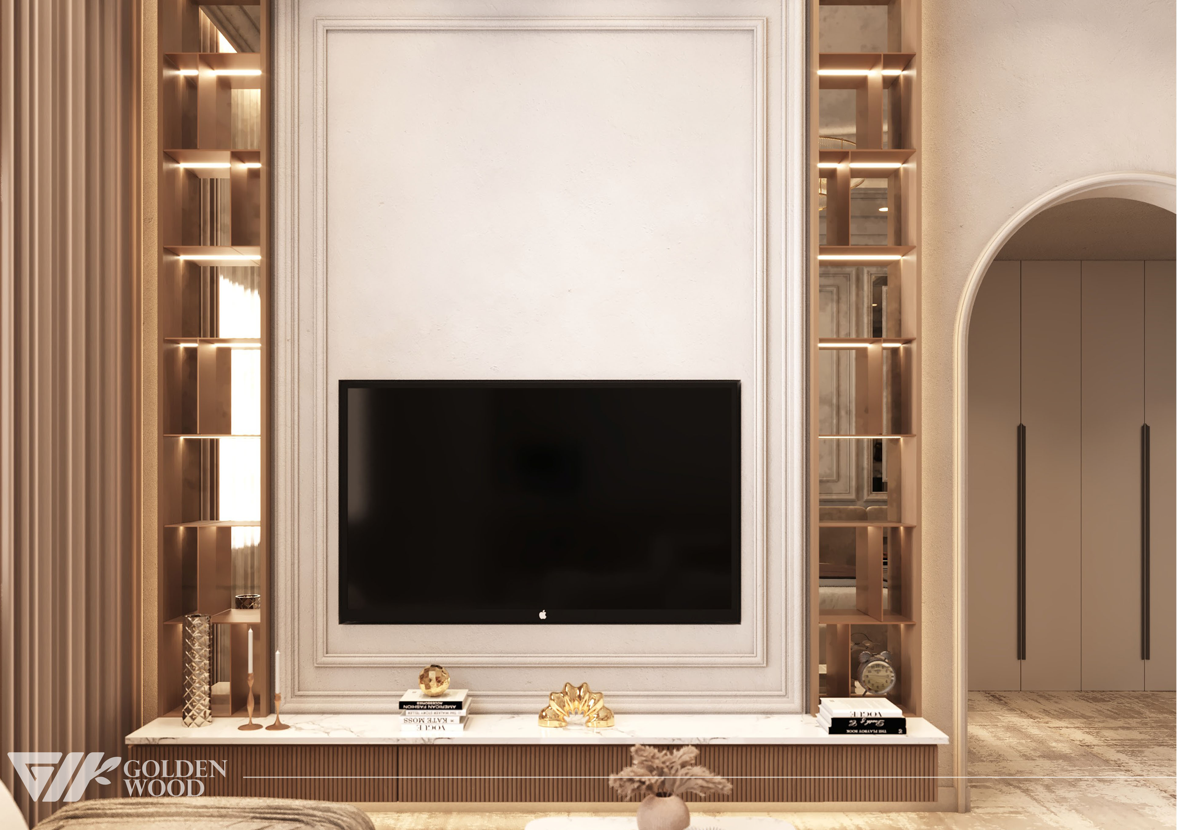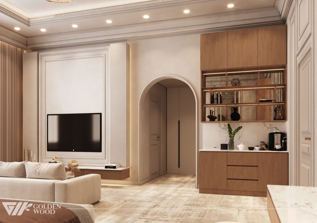 Methaa Project showcases a seamless blend of classic elegance and modern sophistication. The soft beige palette, warm wood accents, and refined detailing create a serene and luxurious ambiance. Thoughtfully designed lighting and built-in shelving add both function and aesthetic appeal, making every corner of the space feel cohesive, calm, and timeless.