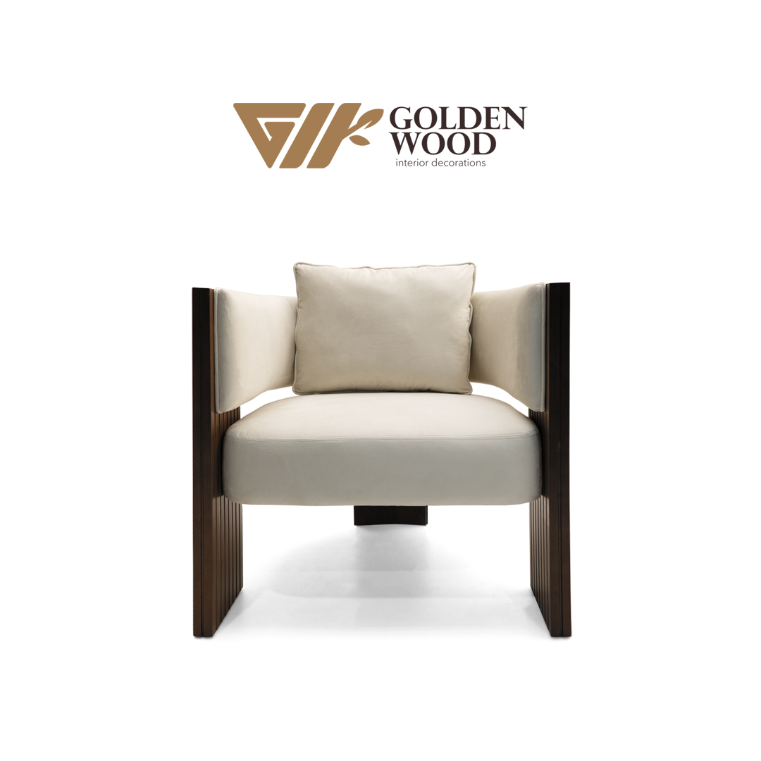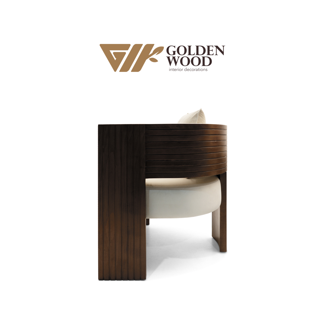 Elevate your interior with the Aurum Halo Lounge Chair, a masterpiece of modern elegance and artisanal craftsmanship. Designed by Golden Wood, this chair blends sculptural form with luxurious comfort. Its circular backrest, carved from rich dark wood with horizontal grooves, creates a bold silhouette that commands attention. The plush, light-toned upholstery offers a soft contrast, inviting you to relax in style. Whether placed in a living room, study, or boutique setting, the Aurum Halo is more than seating—it’s a statement.