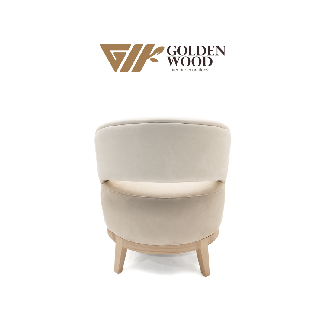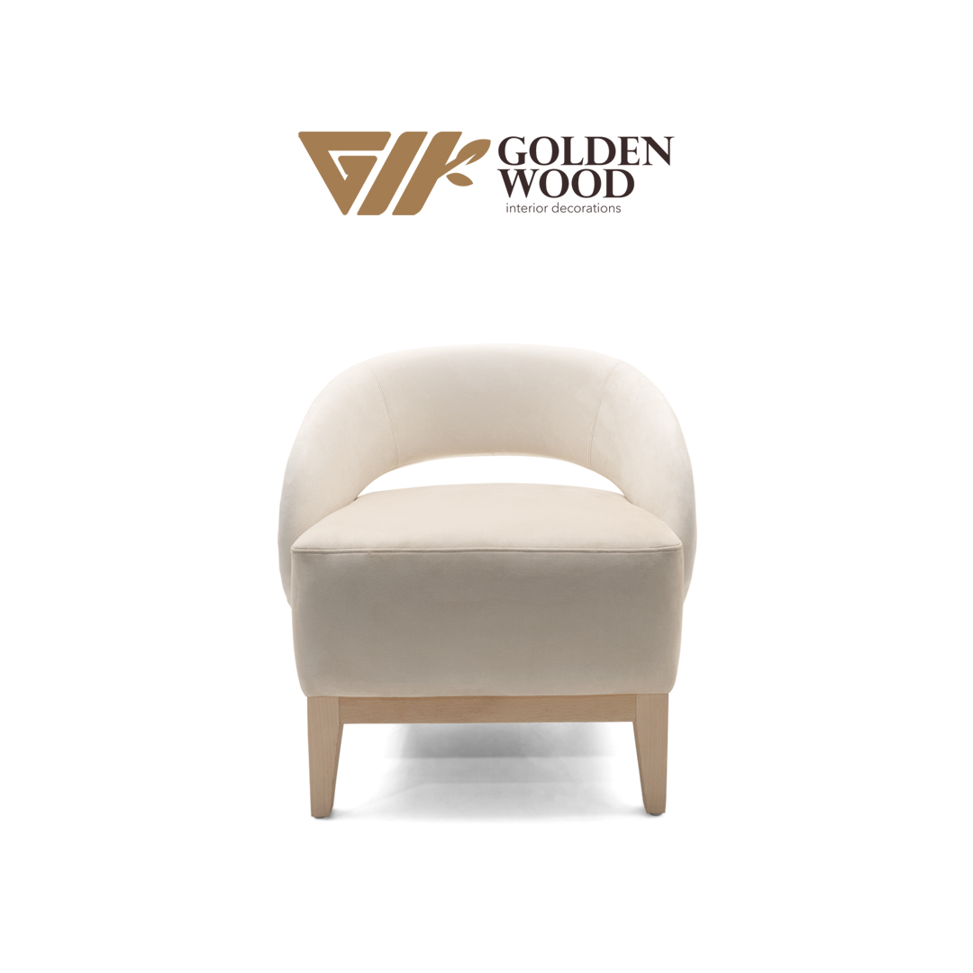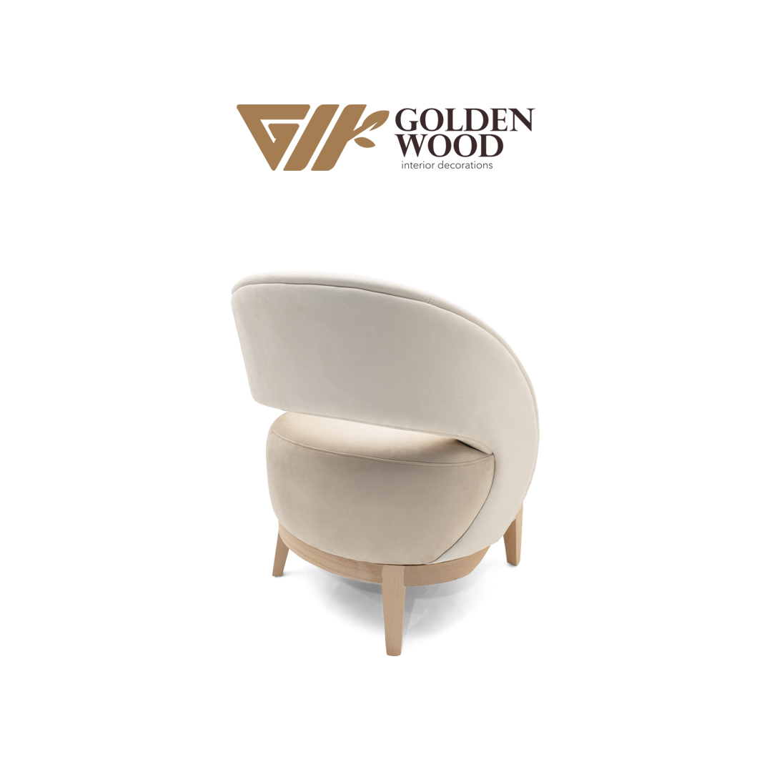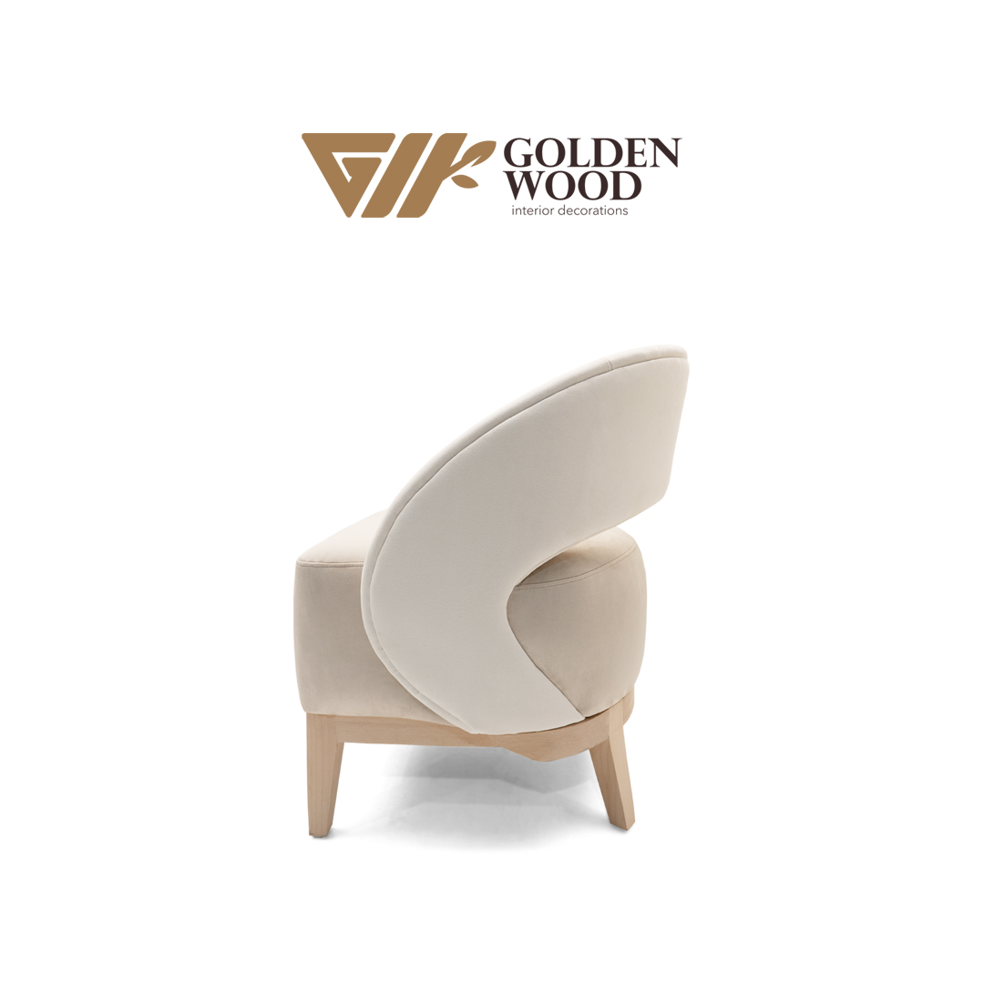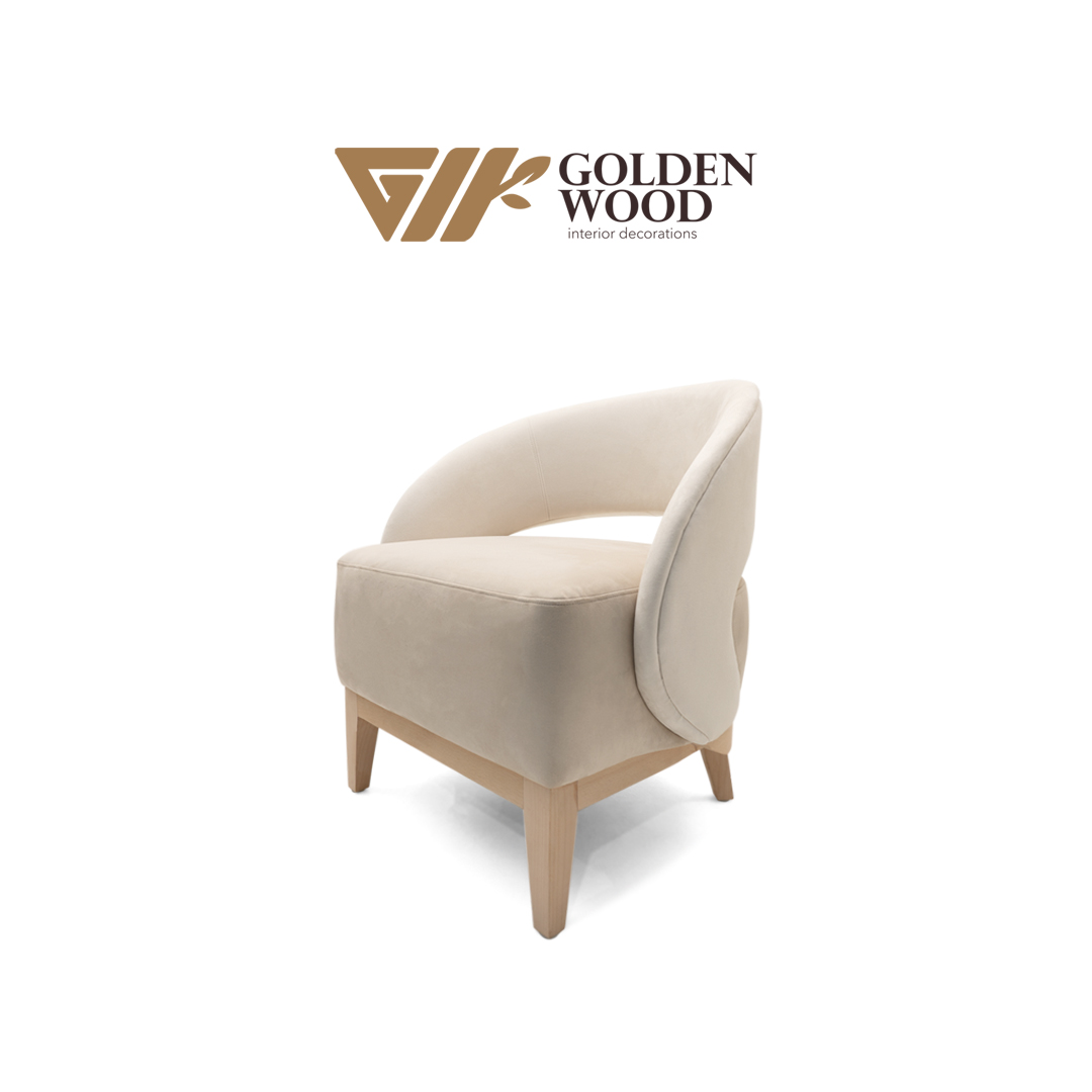 Gracefully sculpted for modern interiors, the Serenova Curve Accent Chair by Golden Wood blends minimalist design with organic warmth. Its rounded backrest flows seamlessly into the armrests, creating a soft, enveloping silhouette that invites relaxation. Upholstered in a creamy beige fabric and supported by natural wood legs, this chair offers a harmonious balance of comfort and style. Whether placed in a reading nook, living room, or boutique space, Serenova adds a touch of quiet sophistication to any setting.
