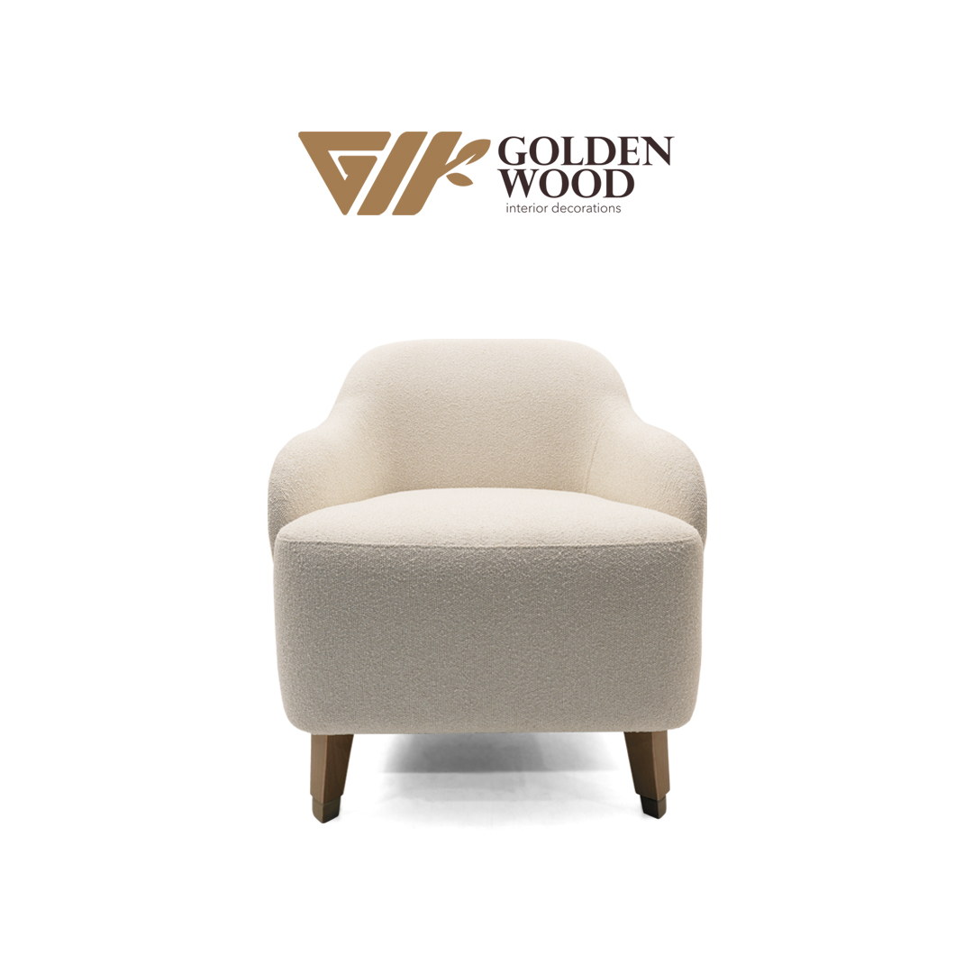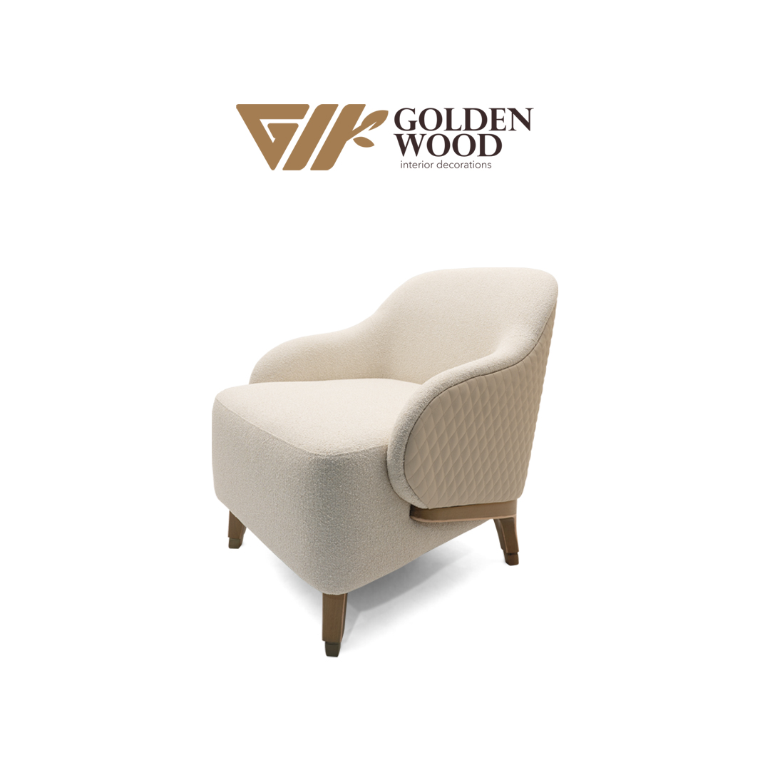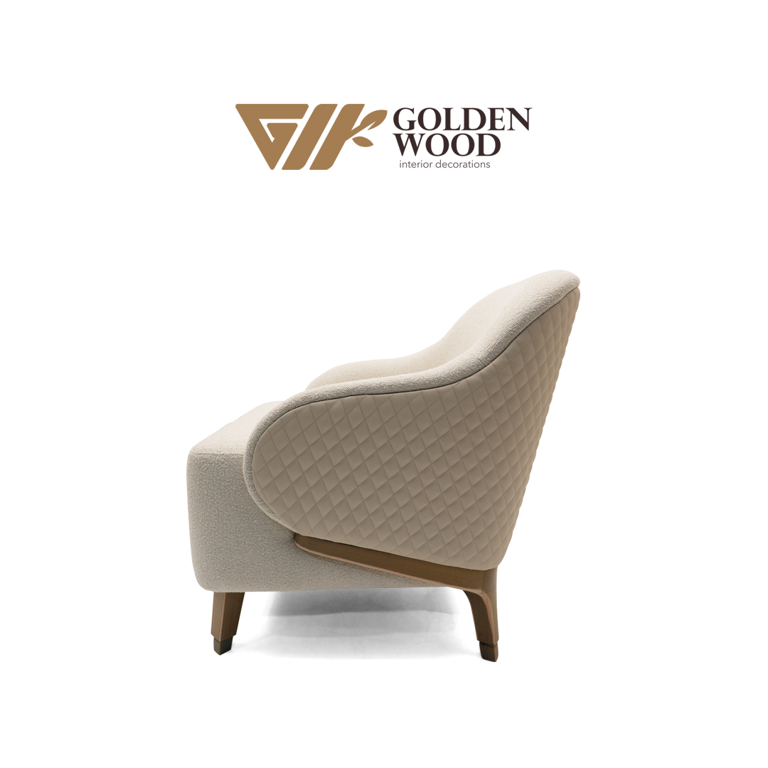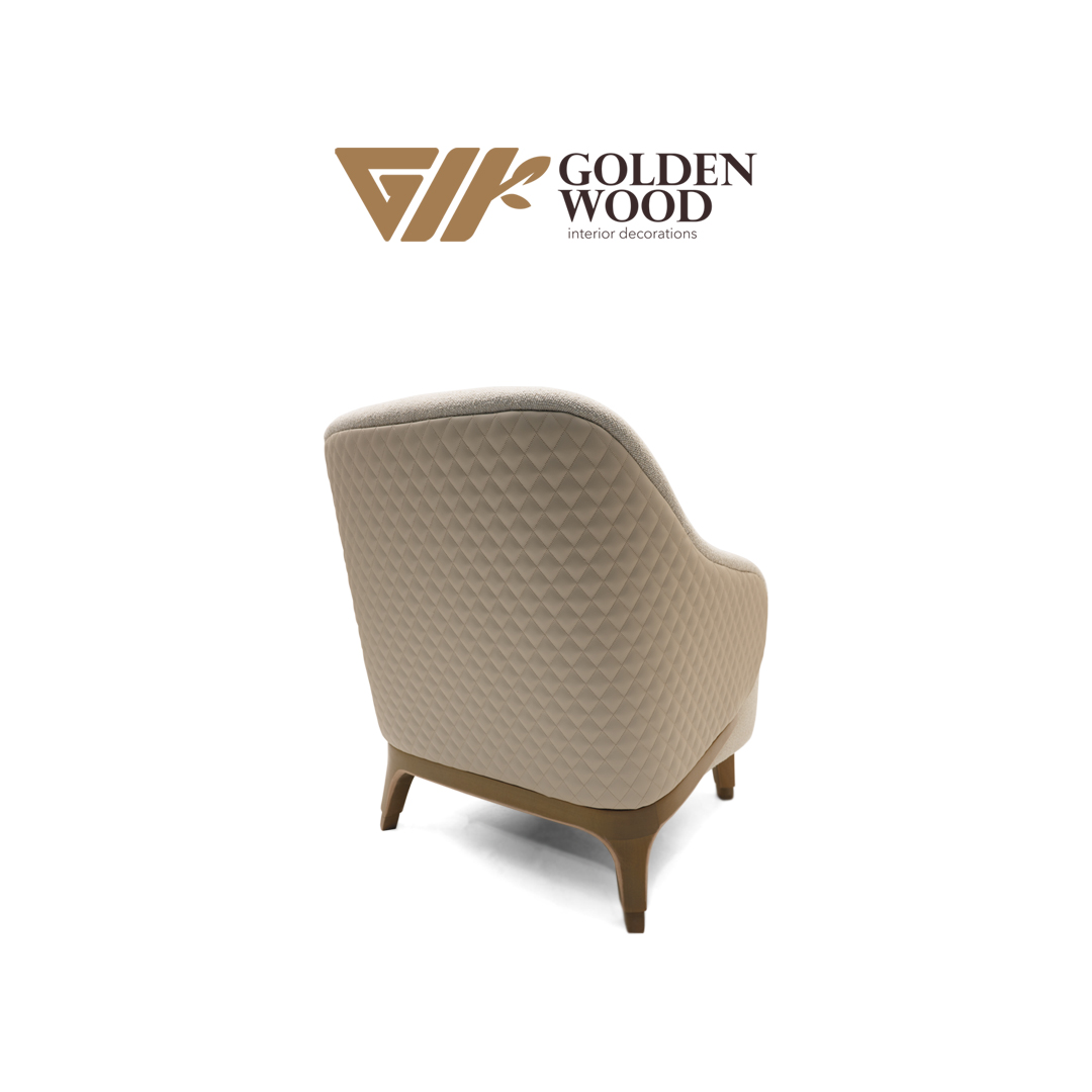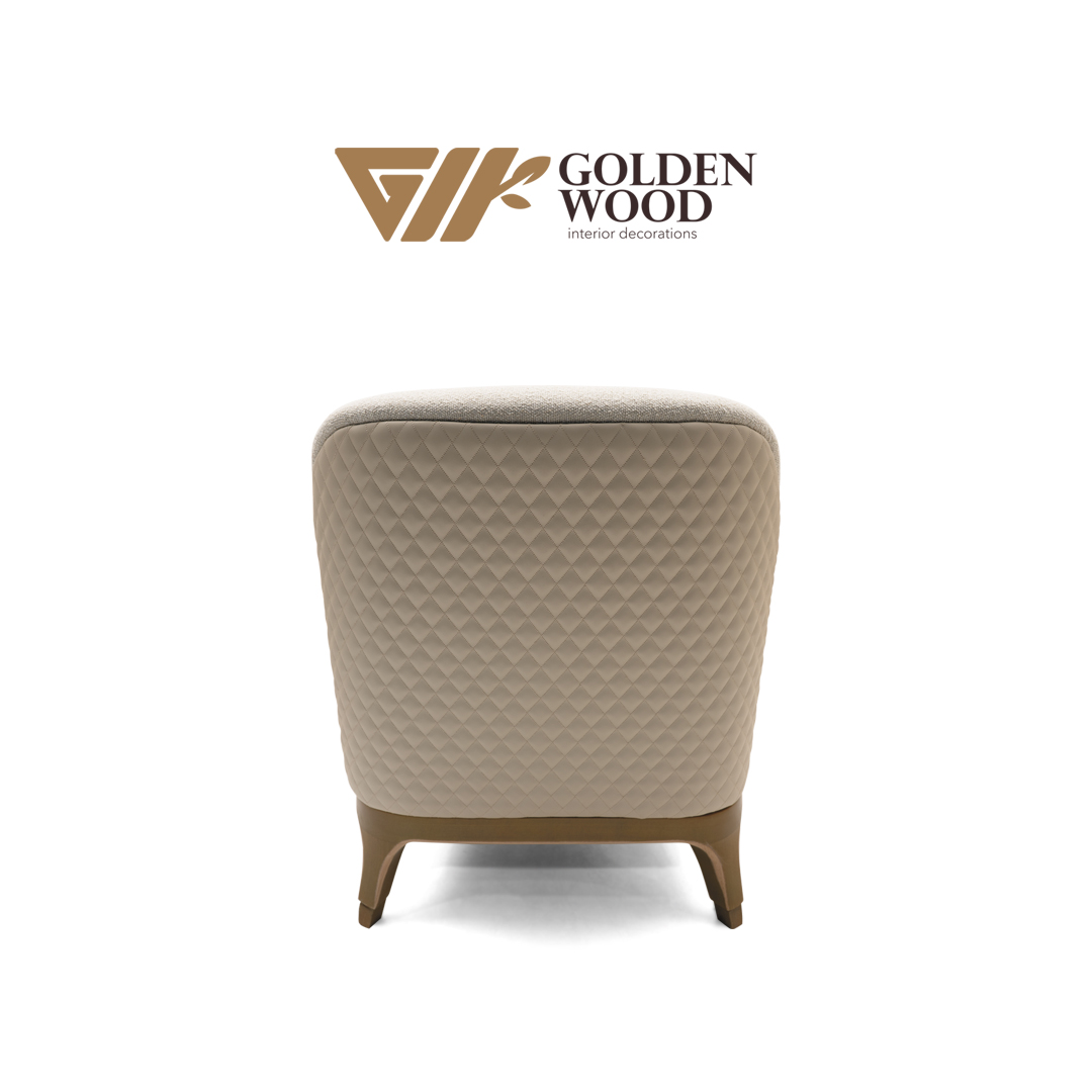 The Velora Diamond Armchair by Golden Wood is a celebration of refined craftsmanship and modern elegance. Upholstered in a soft beige fabric, this chair features a gracefully curved silhouette that cradles the body in comfort. The standout detail—a diamond-quilted pattern on the back and sides—adds texture and sophistication, making it a true statement piece. Supported by gently tapered wooden legs in a warm natural finish, Velora is designed to elevate any space with its timeless charm and luxurious feel.