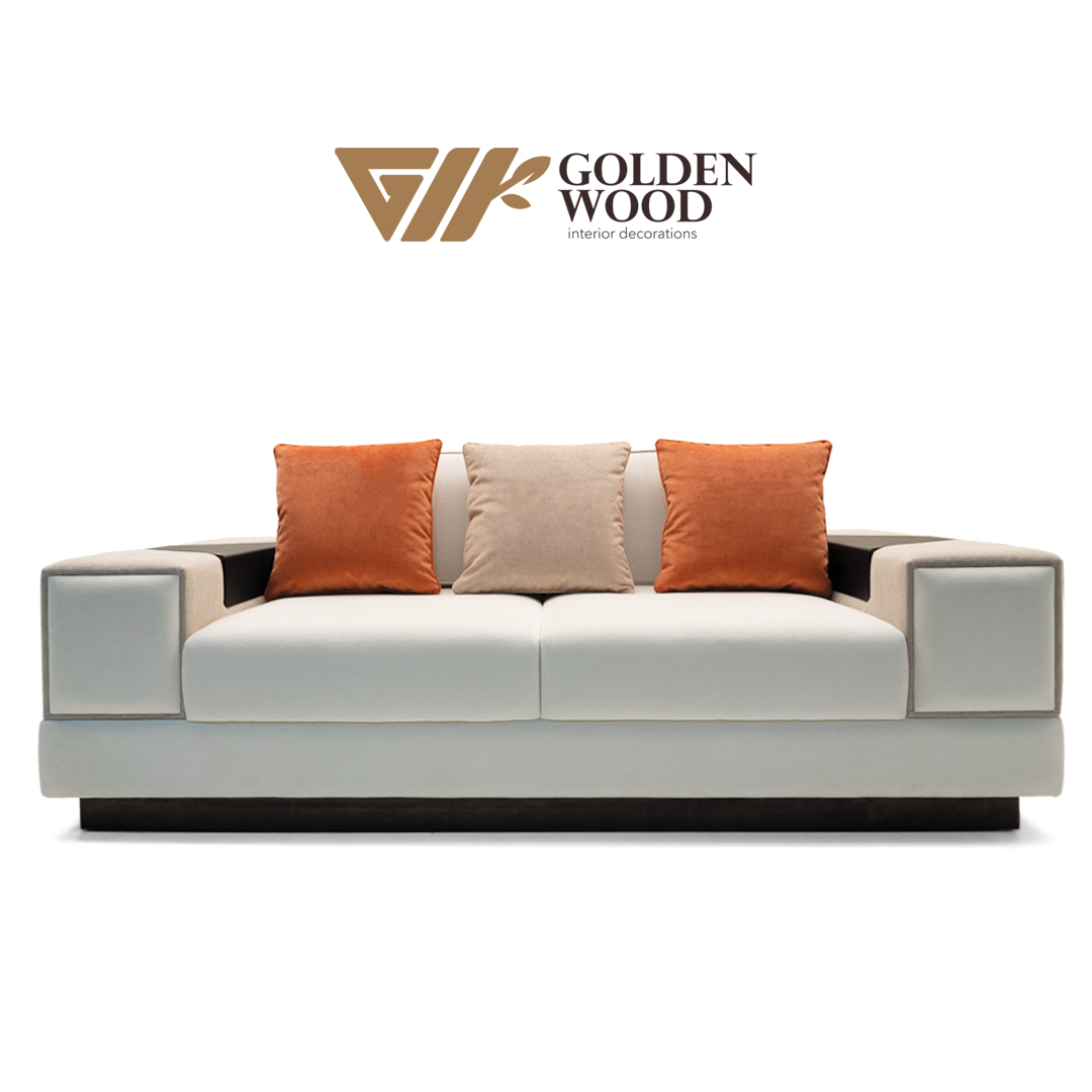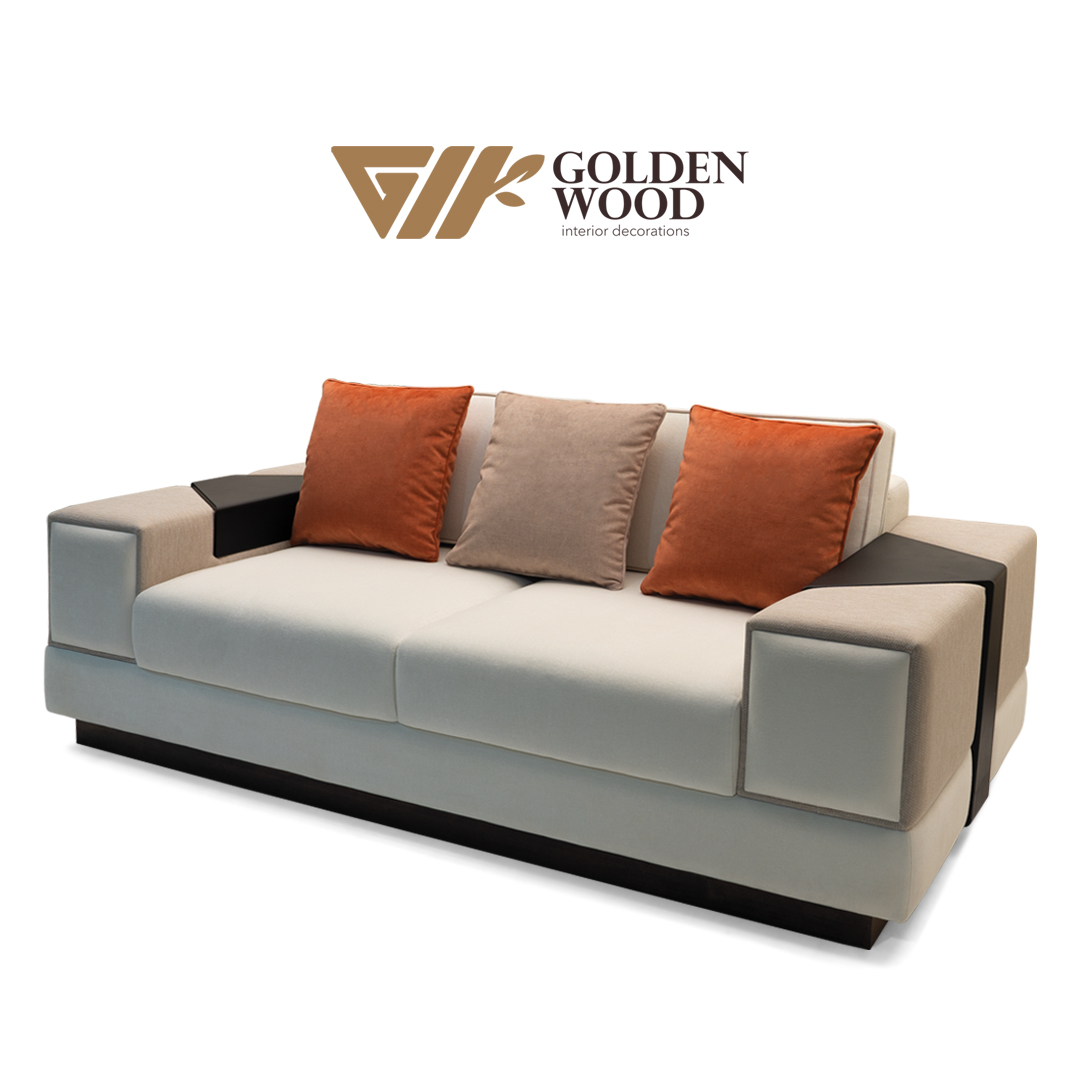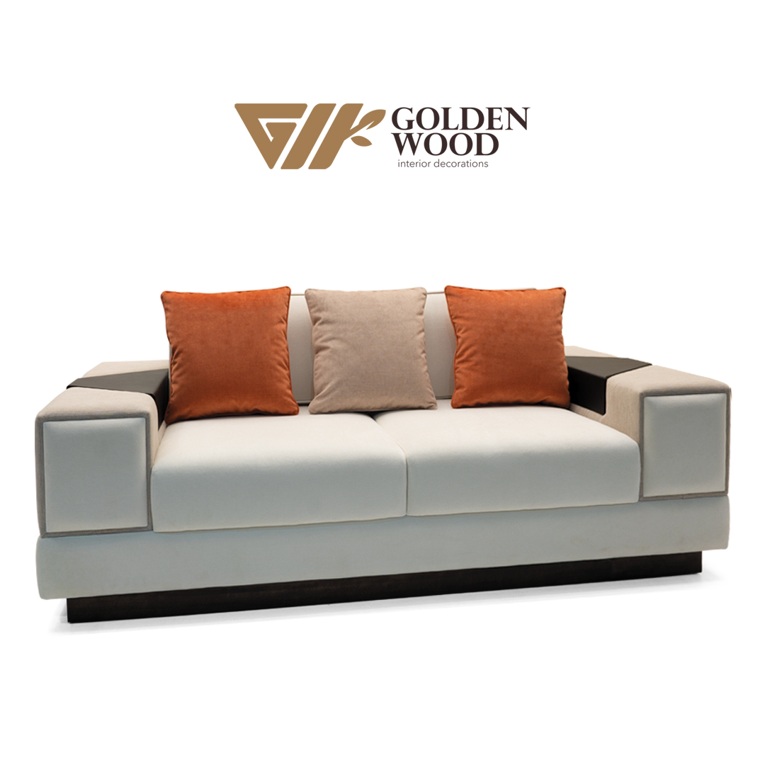 The Solara Luxe Sofa by Golden Wood is a refined blend of minimalist design and warm sophistication. Upholstered in a soft, neutral fabric, it offers a serene foundation for any modern living space. Accented with bold burnt orange and beige cushions, the sofa introduces a subtle pop of color while maintaining a clean aesthetic. Wide armrests with sleek dark paneling add both style and utility, making this piece as functional as it is beautiful. Whether you’re entertaining guests or unwinding solo, the Solara Luxe invites comfort with a designer’s touch.
