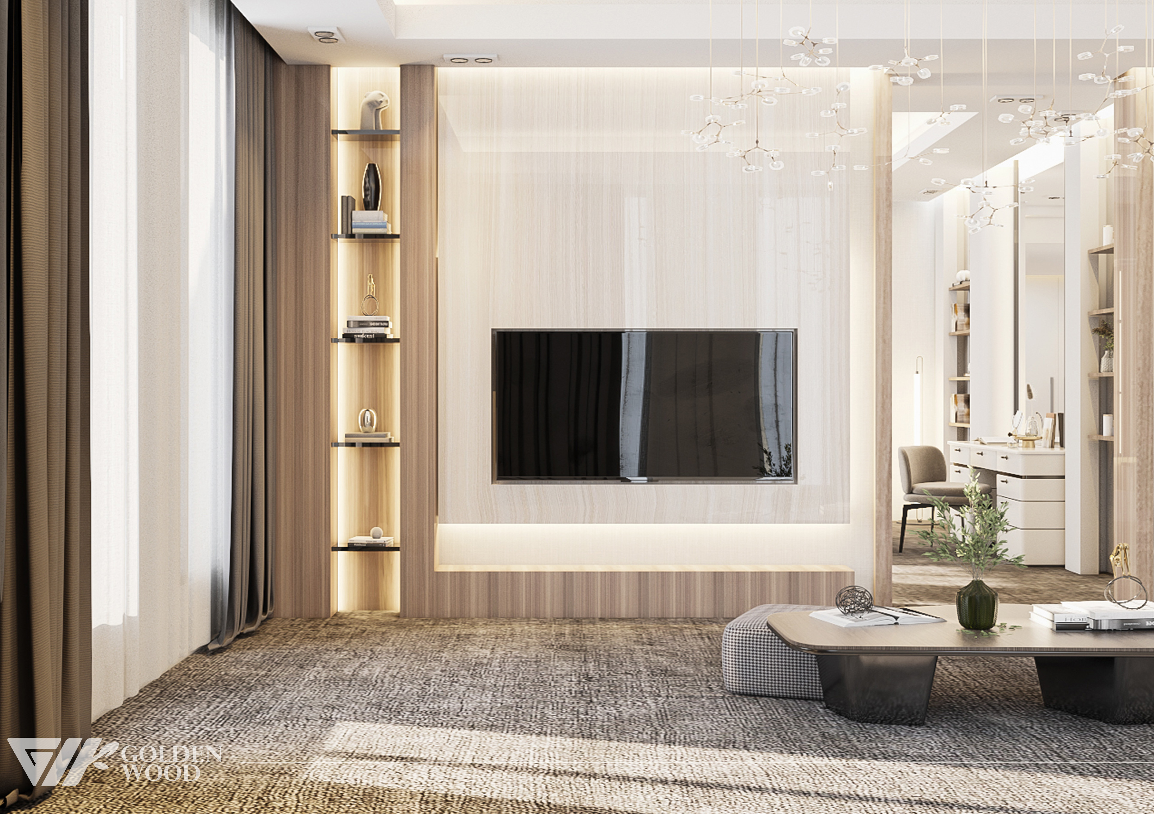 “Modern Elegance” embodies a sophisticated blend of minimalist design and luxurious comfort. This project features a series of open, airy spaces where light and texture interplay, creating an inviting yet elegant atmosphere. The carefully chosen color palette of soft neutrals, rich browns, and clean whites adds a sense of calm and warmth. Thoughtfully designed details, such as the floral-themed shelving, plush bedding, and contemporary lighting fixtures, highlight both functionality and style. The aesthetic is further enhanced by subtle architectural lines, high-quality materials, and artistic elements, culminating in a modern living experience that is both refined and cozy.