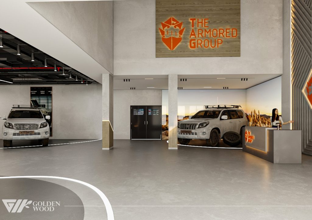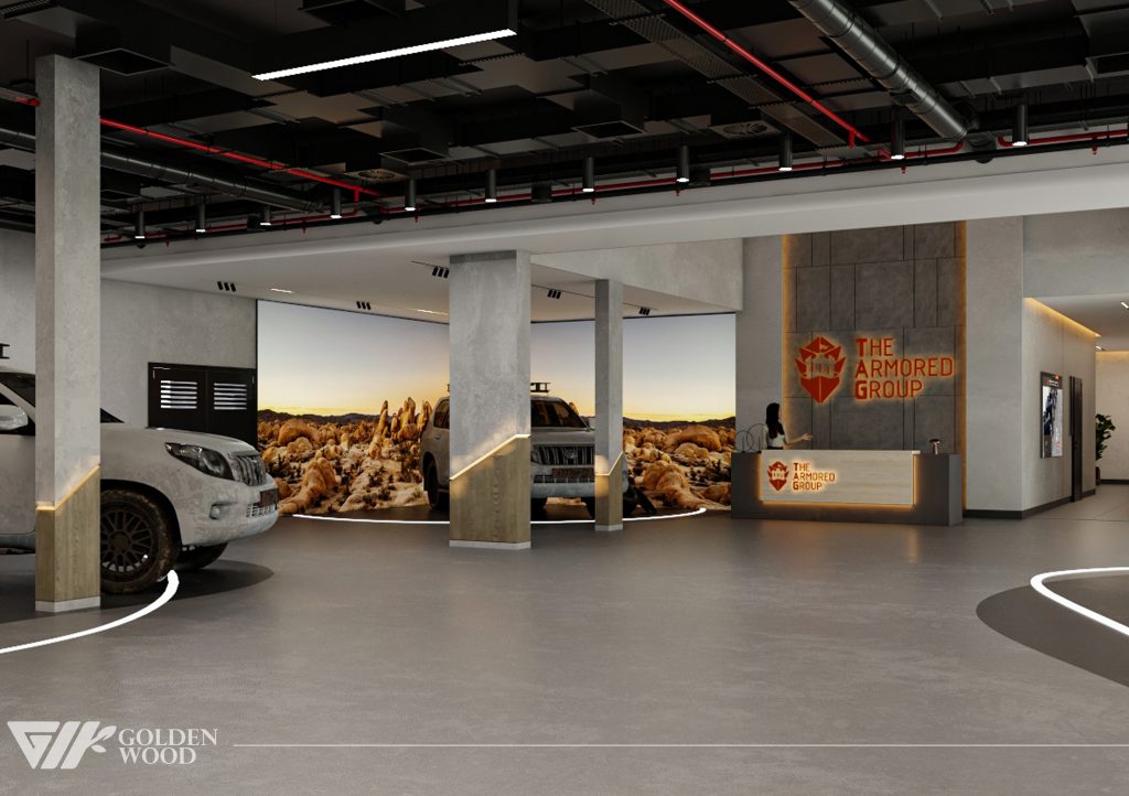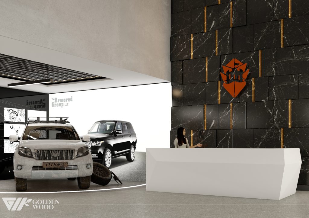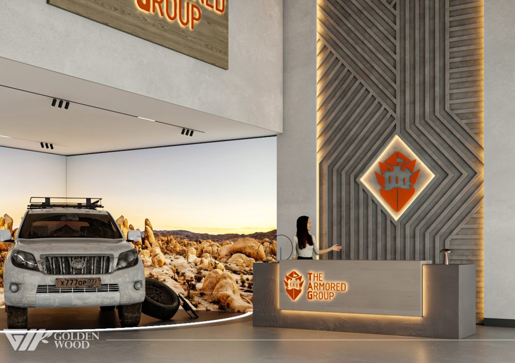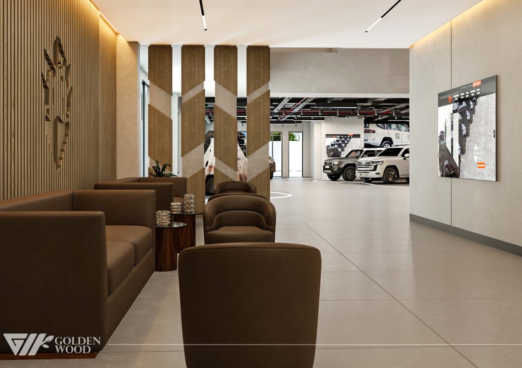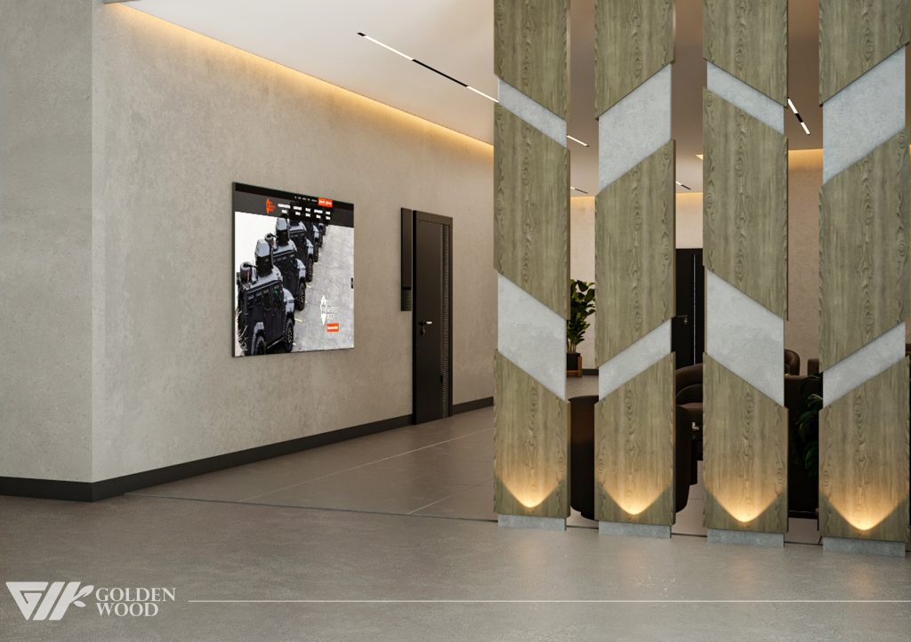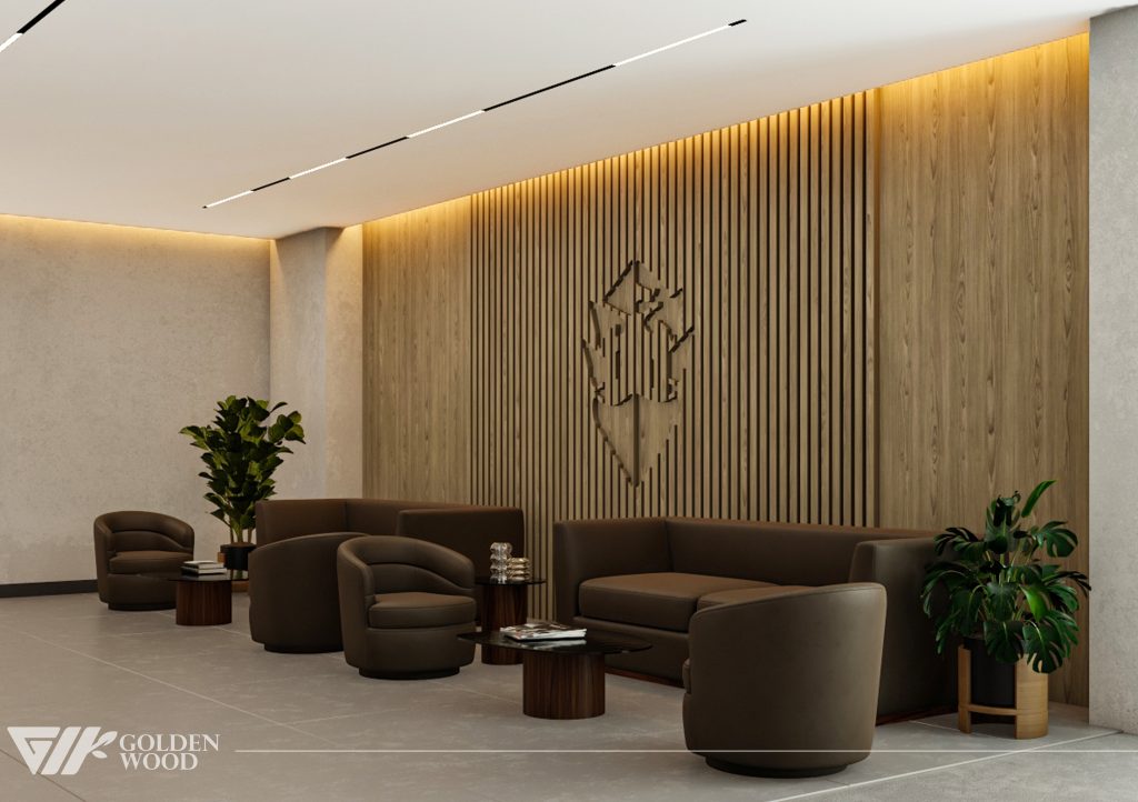 This project appears to showcase the interior design of a modern corporate office or reception area, featuring a blend of contemporary architecture and stylish furniture. The space incorporates sleek wood paneling with warm lighting, creating an inviting atmosphere. The use of neutral tones and natural materials, such as wood, adds sophistication. Additionally, the strategic placement of plants and minimalist décor elements brings balance and life to the environment. A notable feature is the decorative wall behind the reception desk, which includes an illuminated logo and geometric design, highlighting the company’s branding. Overall, the design blends modern aesthetics with functional elegance, suitable for a professional setting.