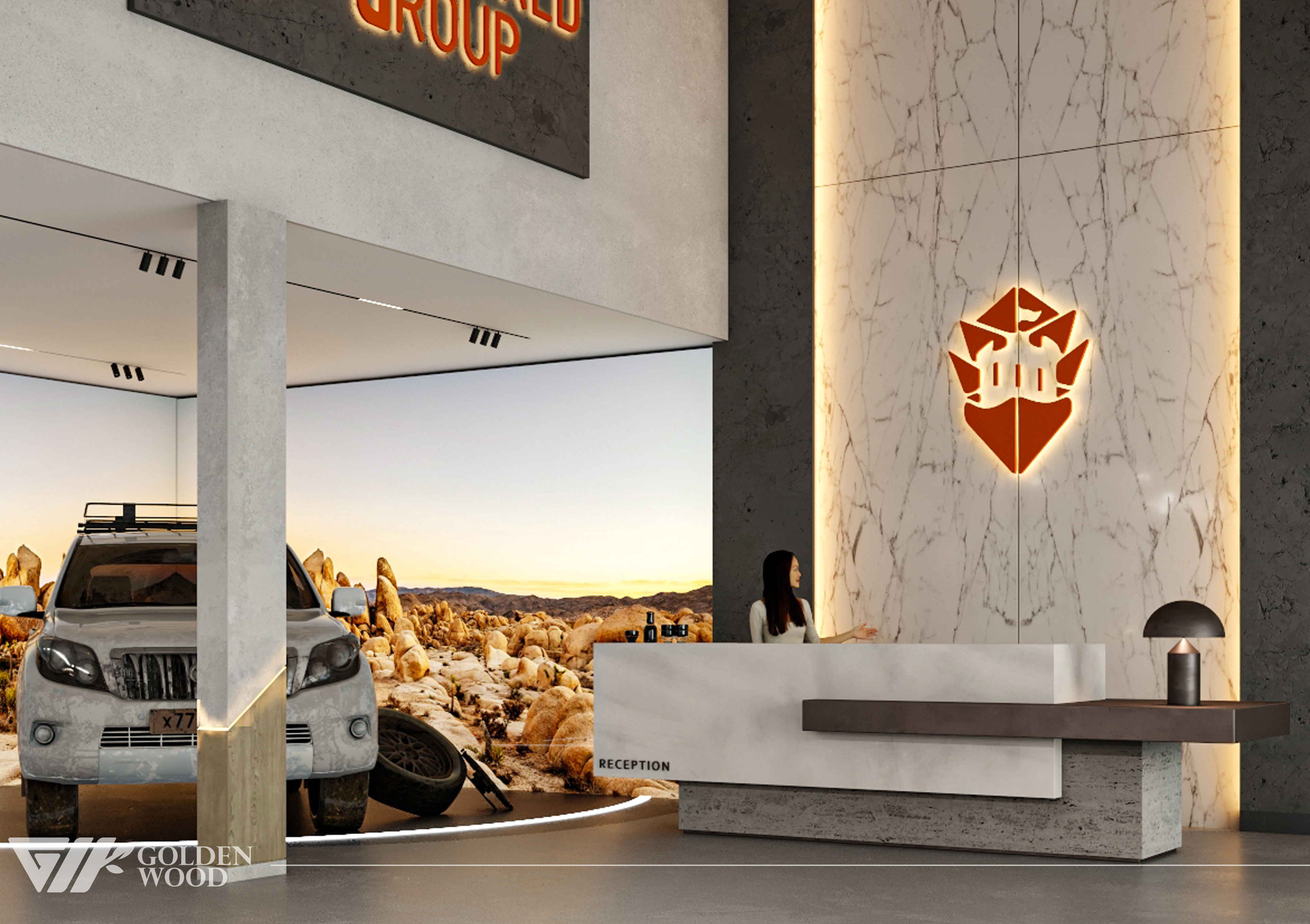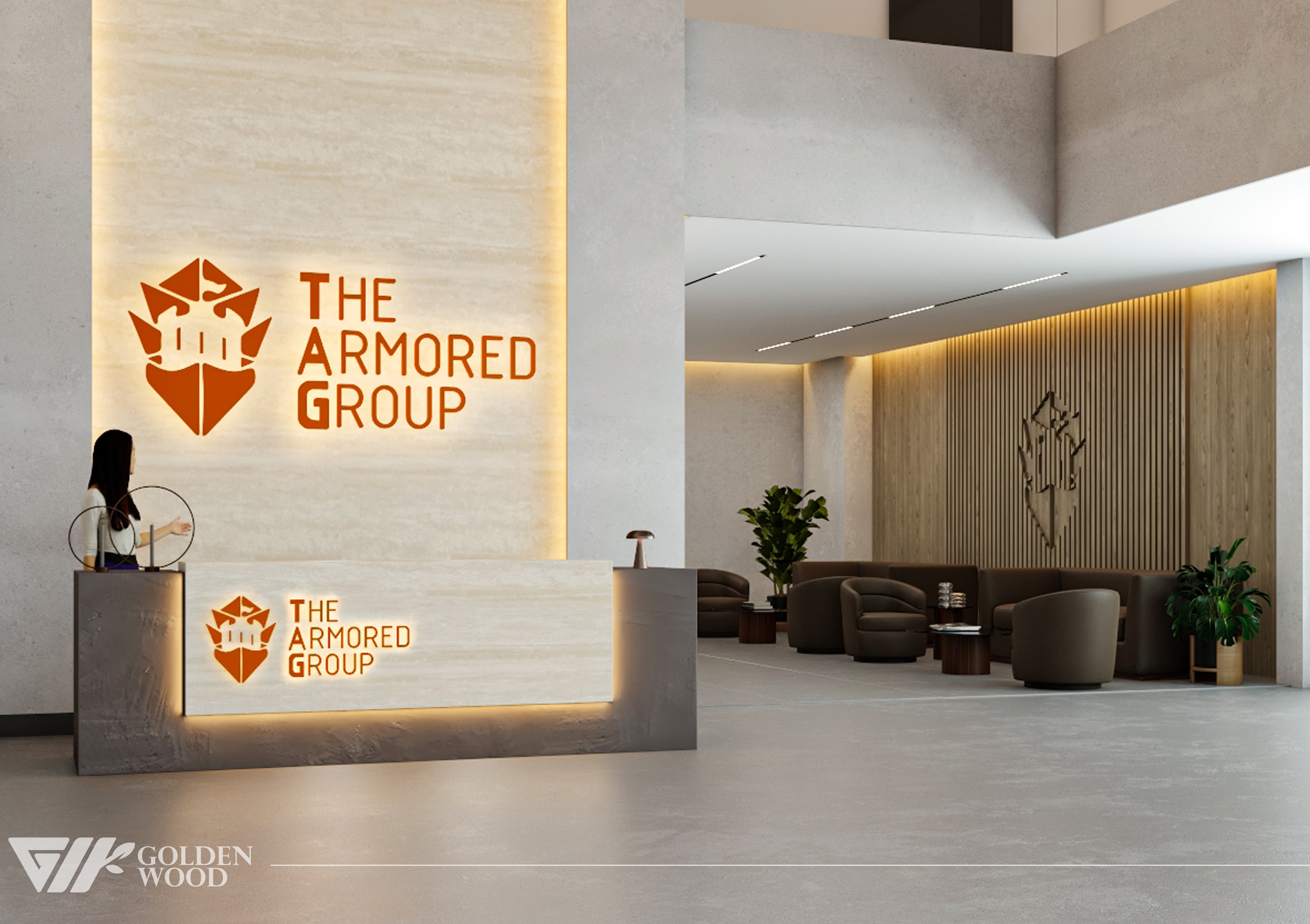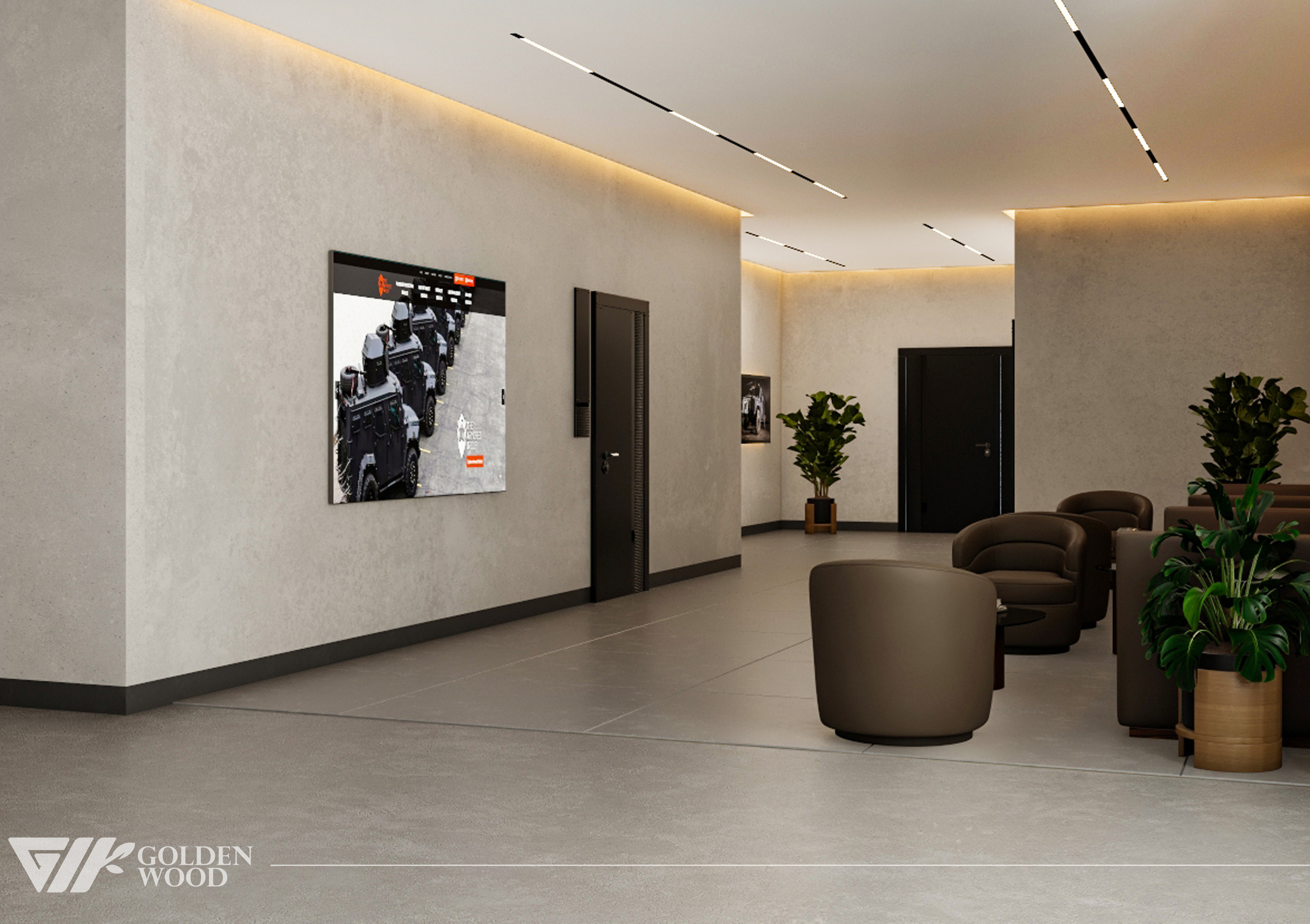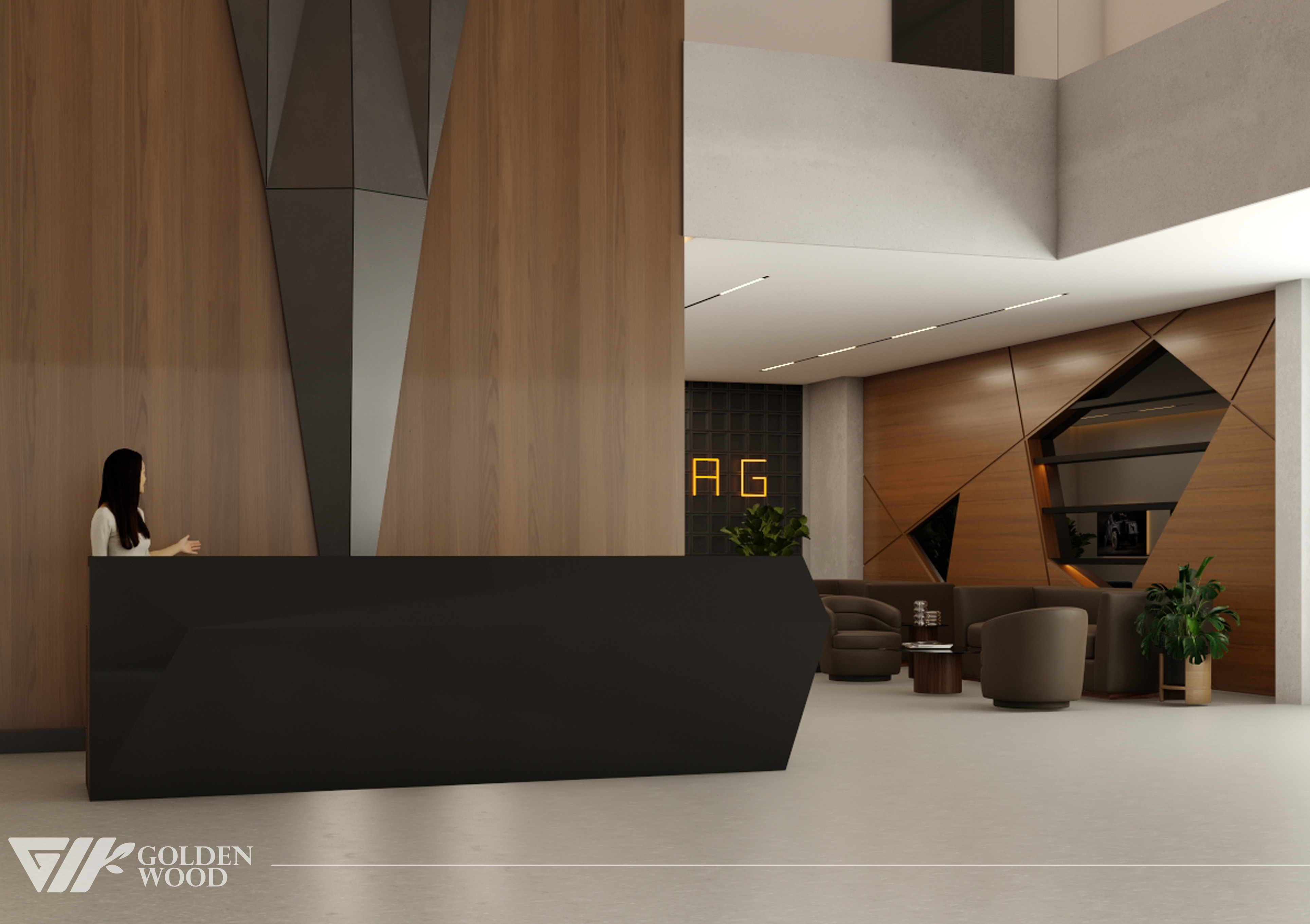 This project appears to showcase the interior design of a modern corporate office or reception area, featuring a blend of contemporary architecture and stylish furniture. The space incorporates sleek wood paneling with warm lighting, creating an inviting atmosphere. The use of neutral tones and natural materials, such as wood, adds sophistication. Additionally, the strategic placement of plants and minimalist décor elements brings balance and life to the environment. A notable feature is the decorative wall behind the reception desk, which includes an illuminated logo and geometric design, highlighting the company’s branding. Overall, the design blends modern aesthetics with functional elegance, suitable for a professional setting.