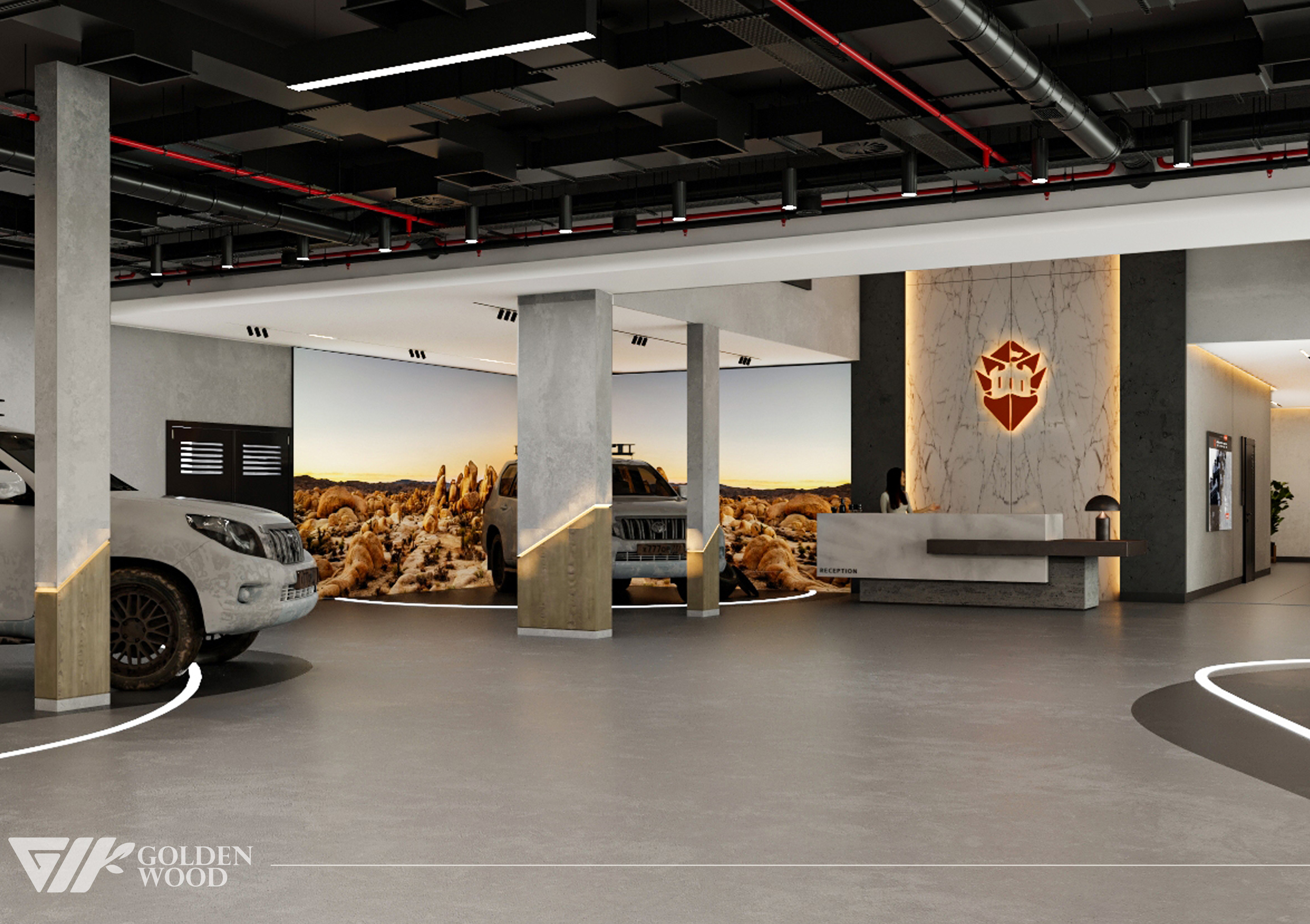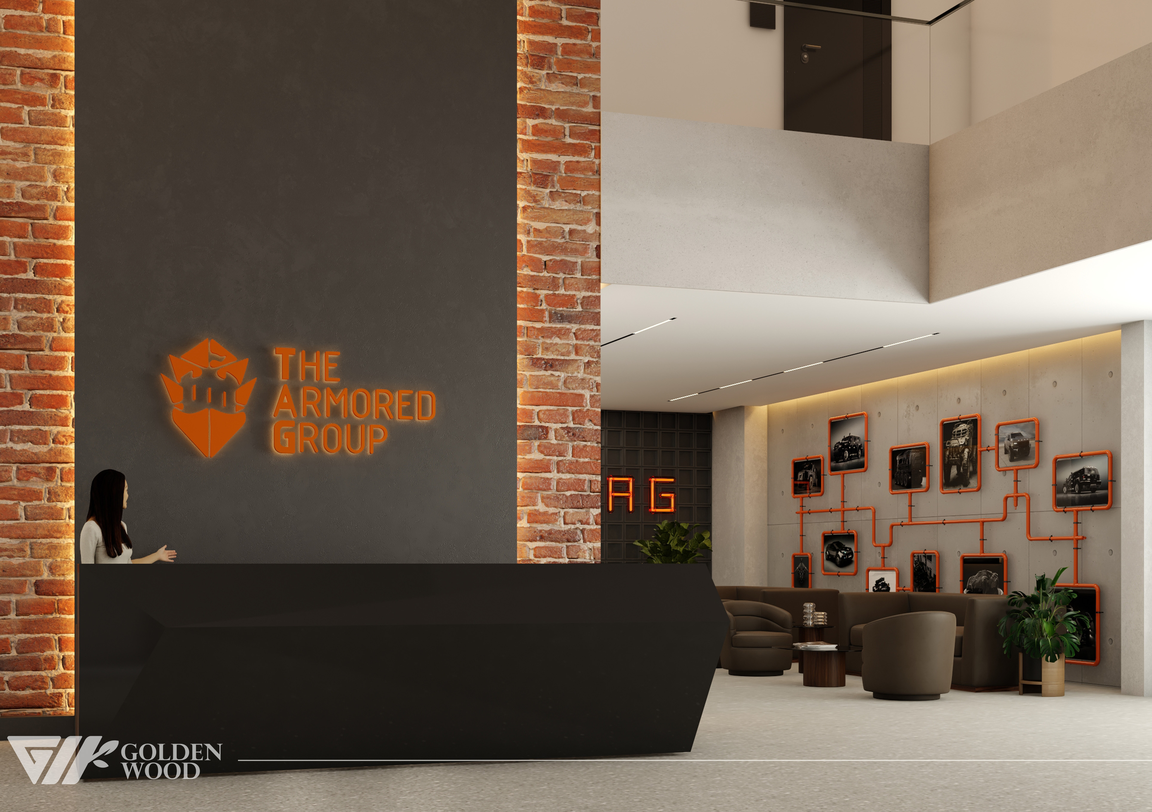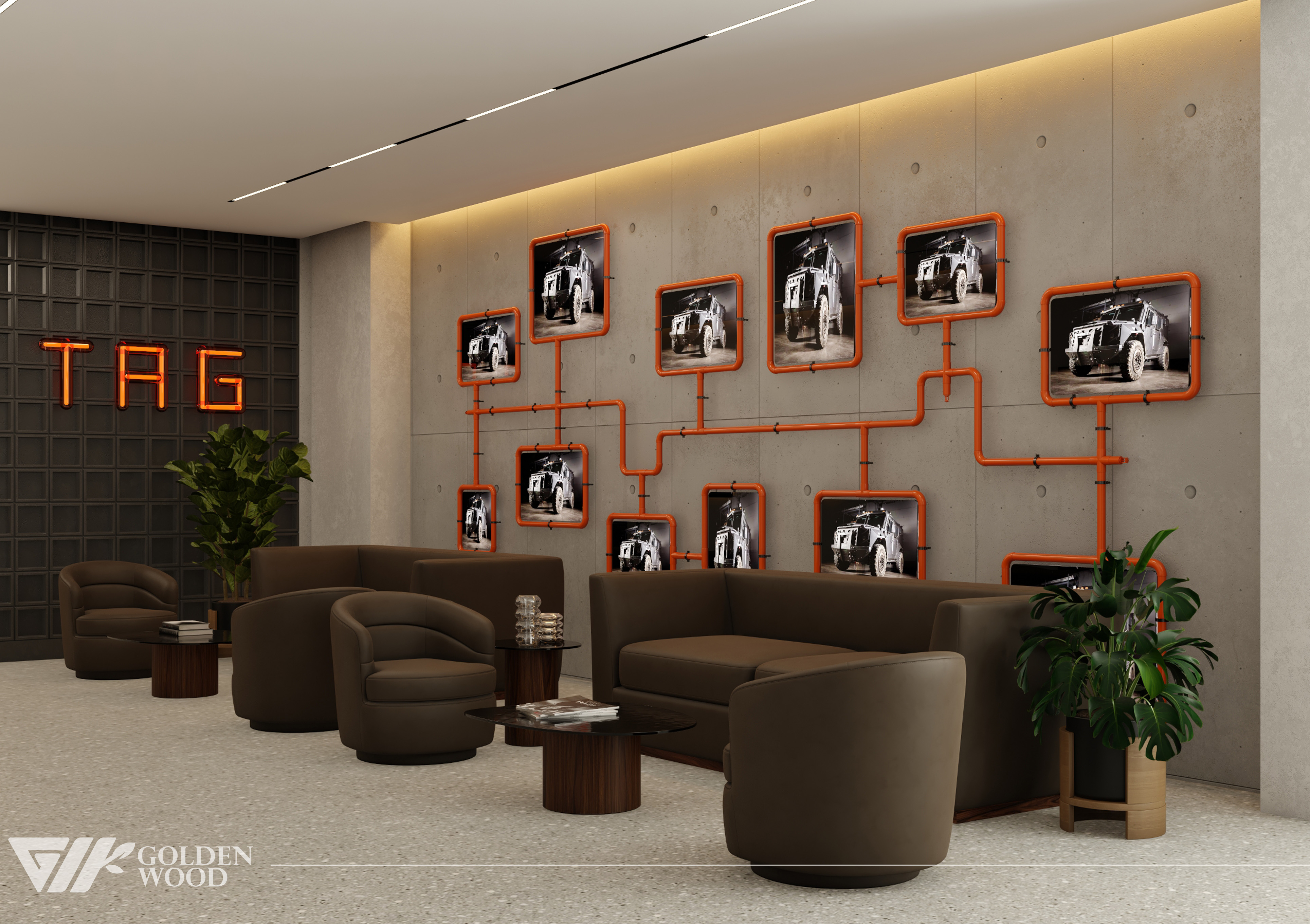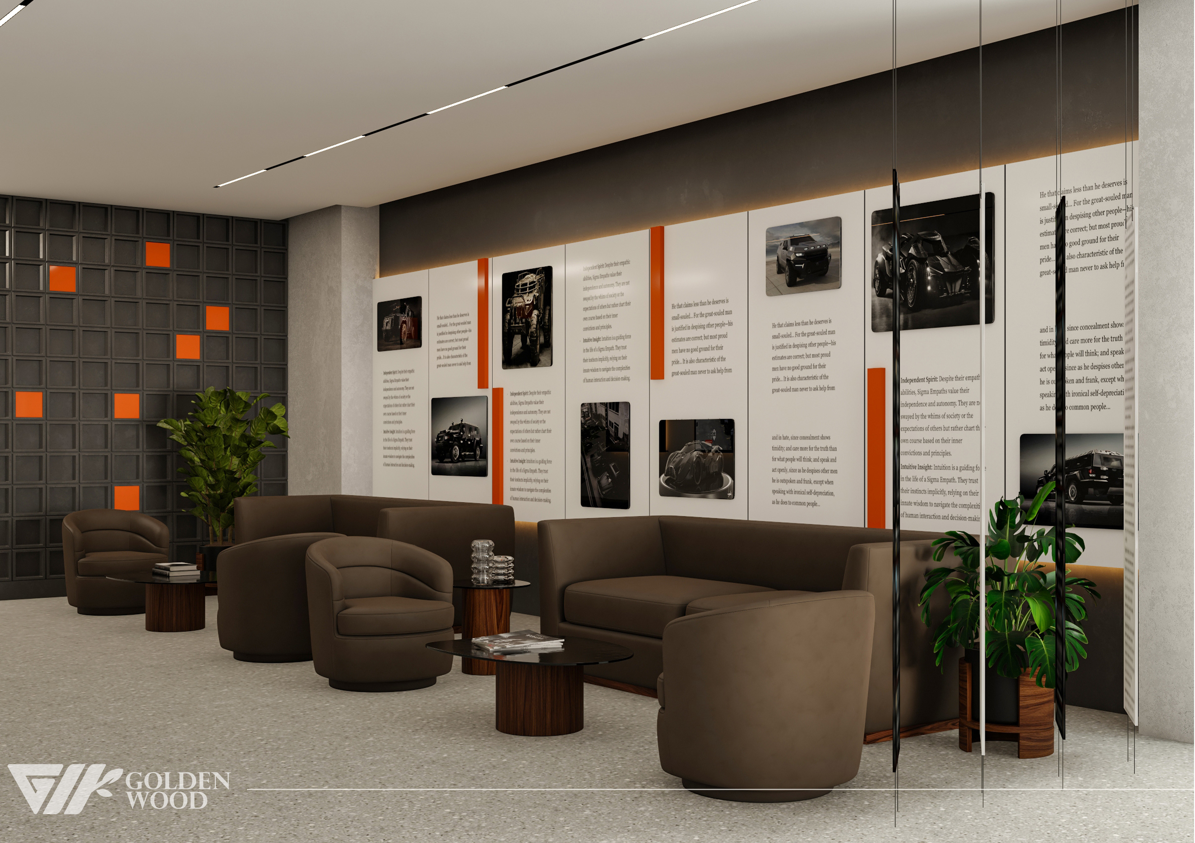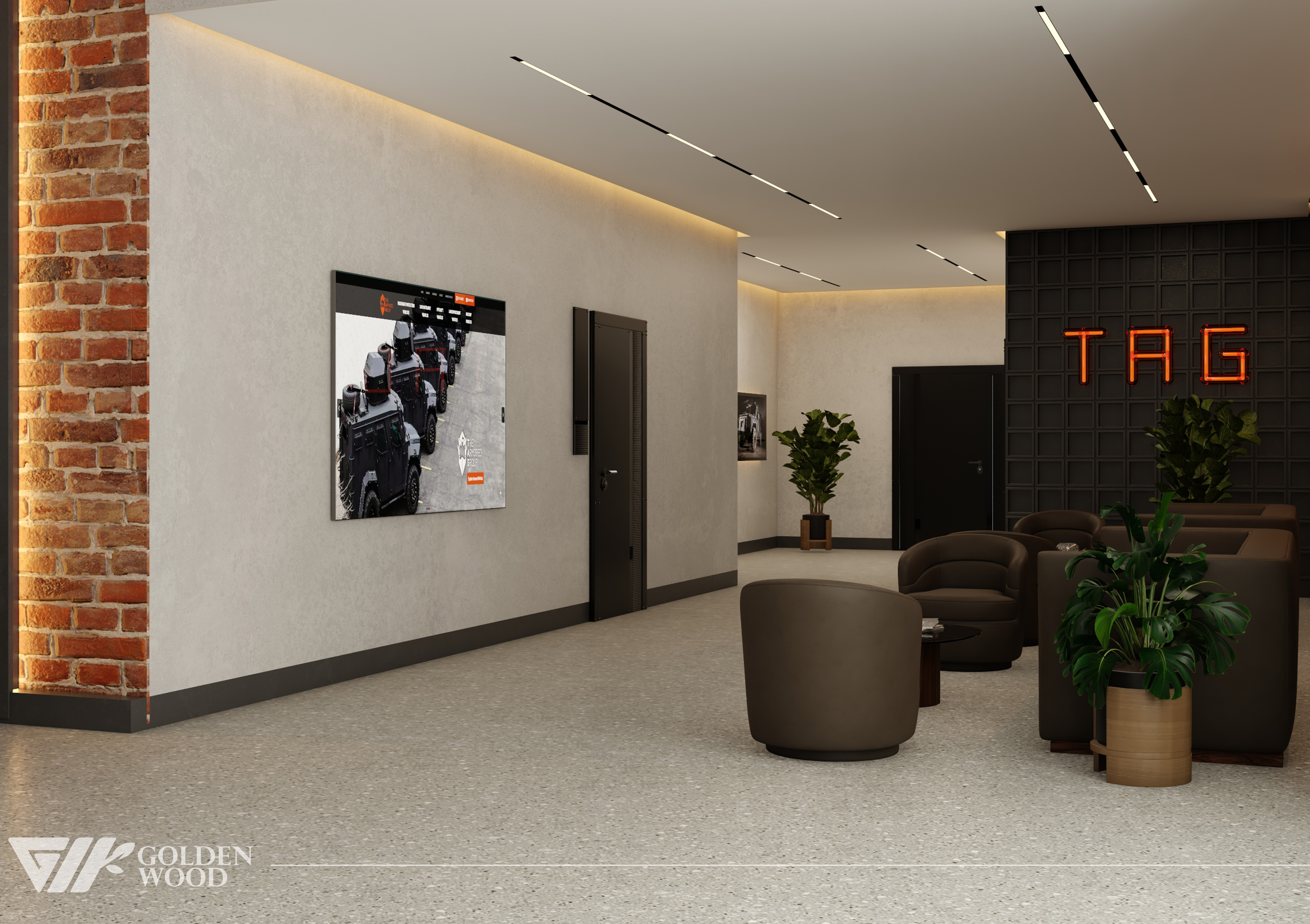 This project appears to showcase the interior design of a modern corporate office or reception area, featuring a blend of contemporary architecture and stylish furniture. The space incorporates sleek wood paneling with warm lighting, creating an inviting atmosphere. The use of neutral tones and natural materials, such as wood, adds sophistication. Additionally, the strategic placement of plants and minimalist décor elements brings balance and life to the environment. A notable feature is the decorative wall behind the reception desk, which includes an illuminated logo and geometric design, highlighting the company’s branding. Overall, the design blends modern aesthetics with functional elegance, suitable for a professional setting.
