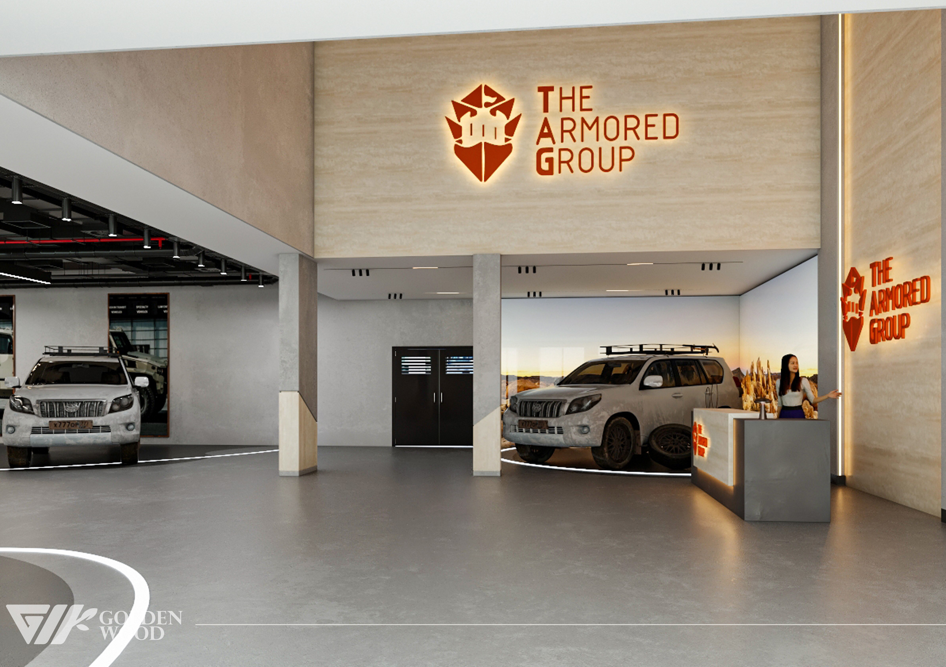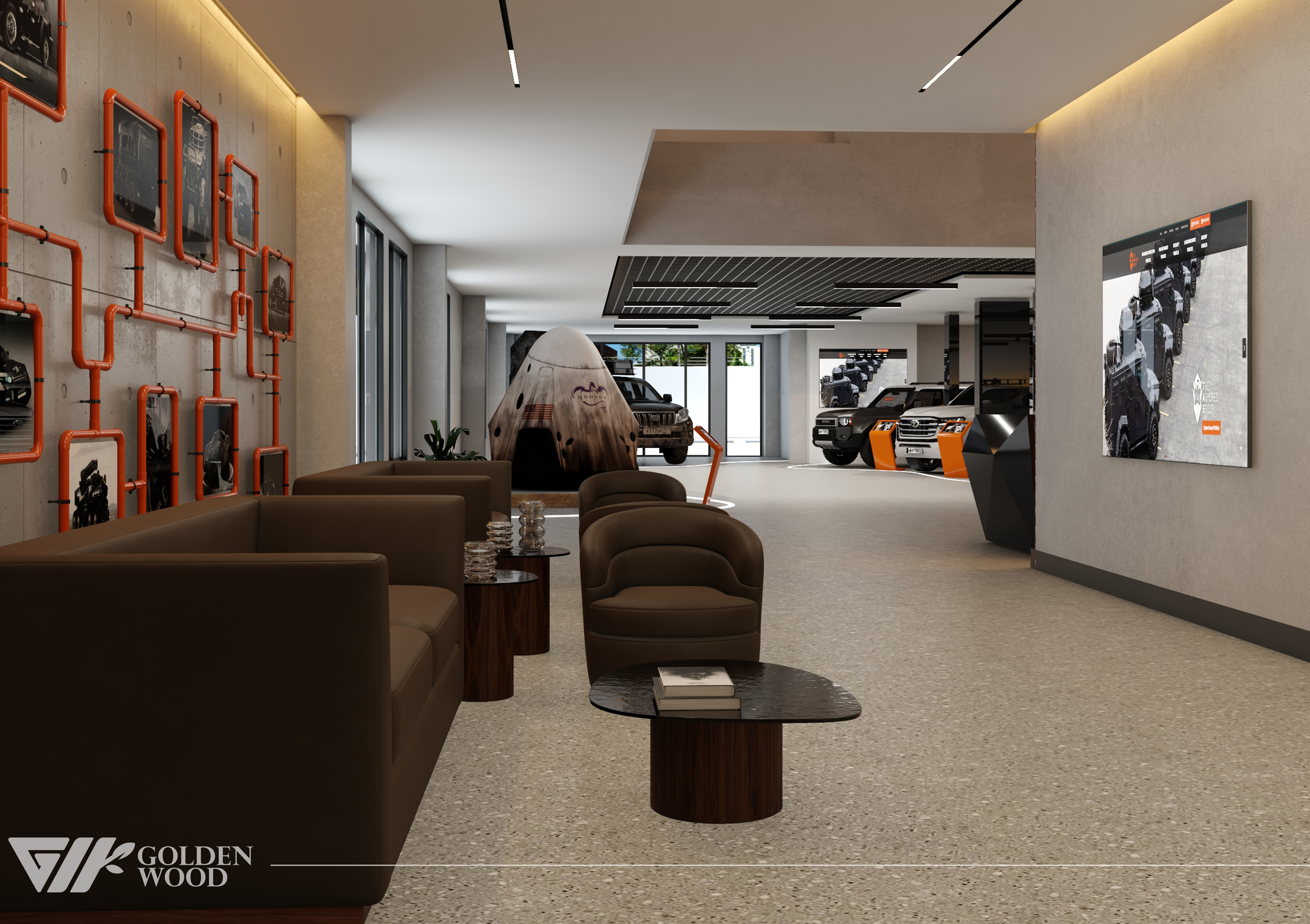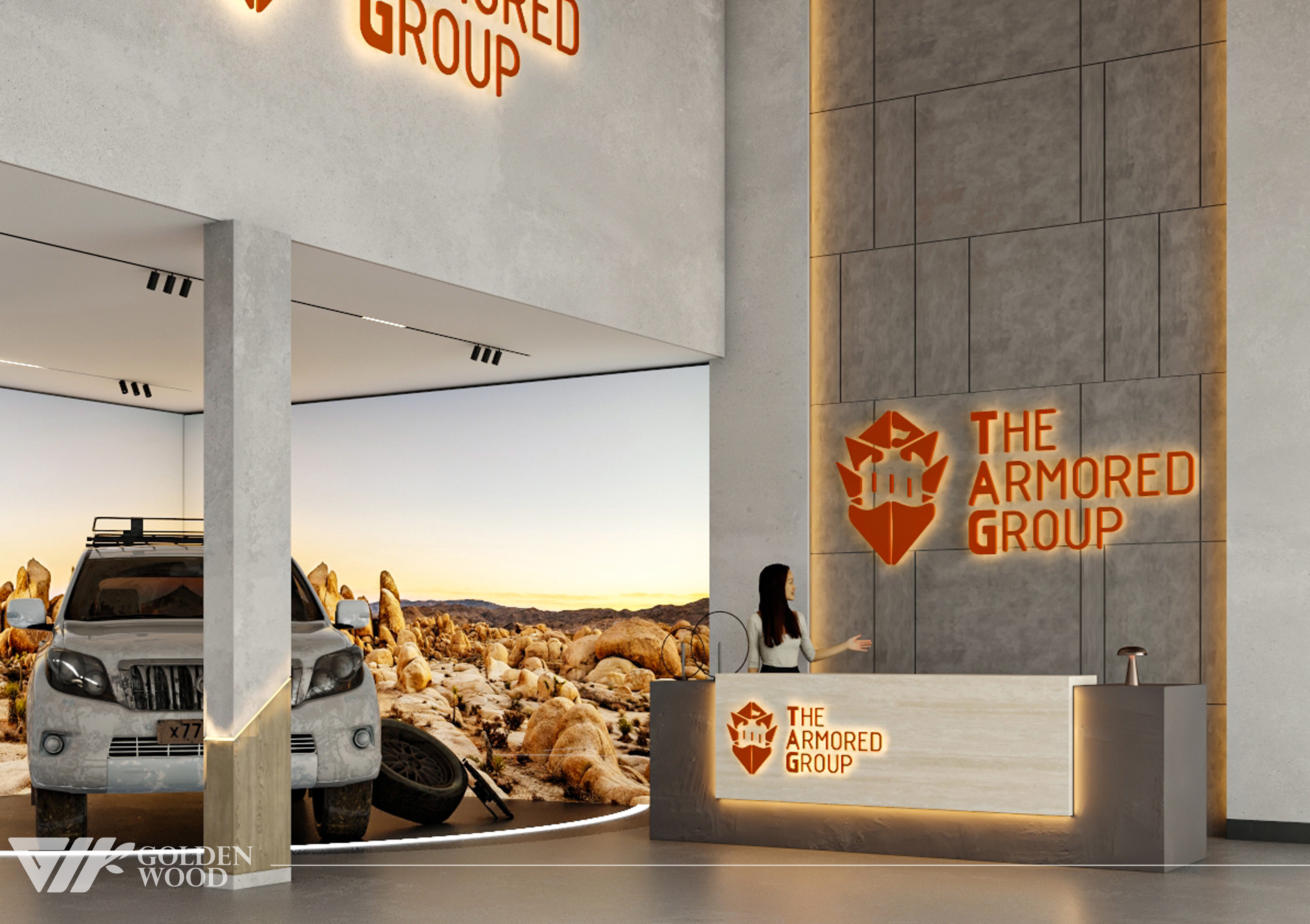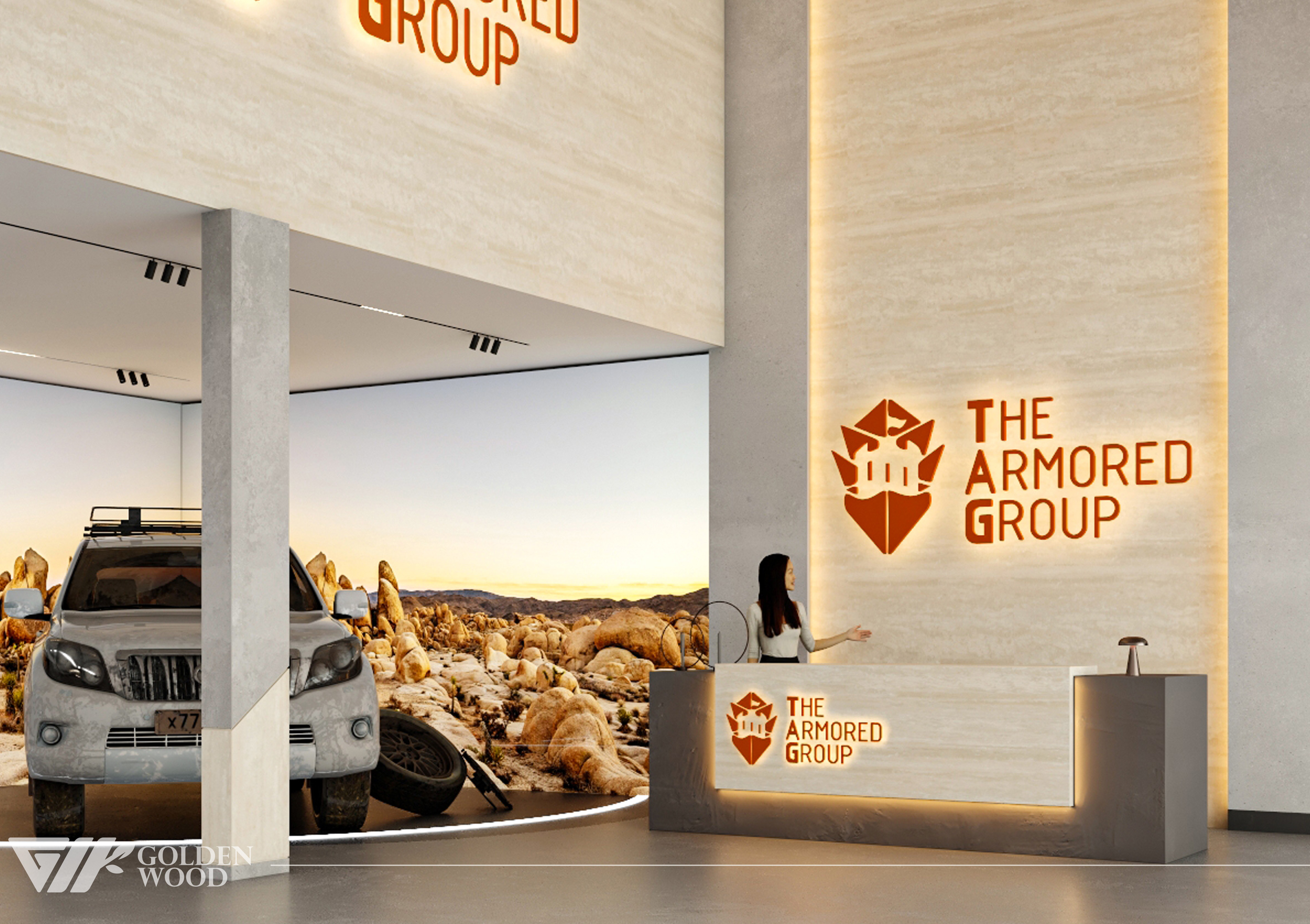 This project appears to showcase the interior design of a modern corporate office or reception area, featuring a blend of contemporary architecture and stylish furniture. The space incorporates sleek wood paneling with warm lighting, creating an inviting atmosphere. The use of neutral tones and natural materials, such as wood, adds sophistication. Additionally, the strategic placement of plants and minimalist décor elements brings balance and life to the environment. A notable feature is the decorative wall behind the reception desk, which includes an illuminated logo and geometric design, highlighting the company’s branding. Overall, the design blends modern aesthetics with functional elegance, suitable for a professional setting.