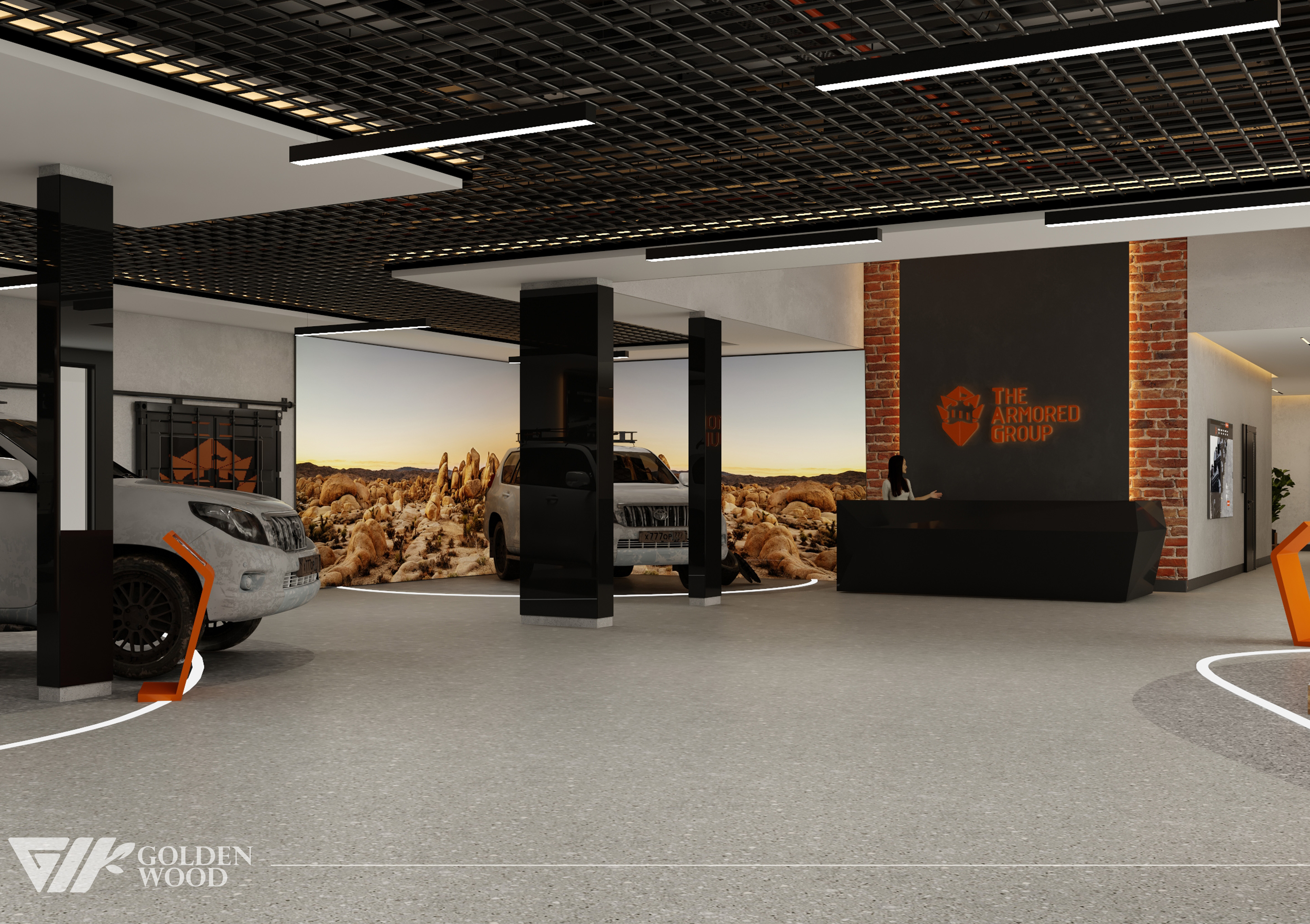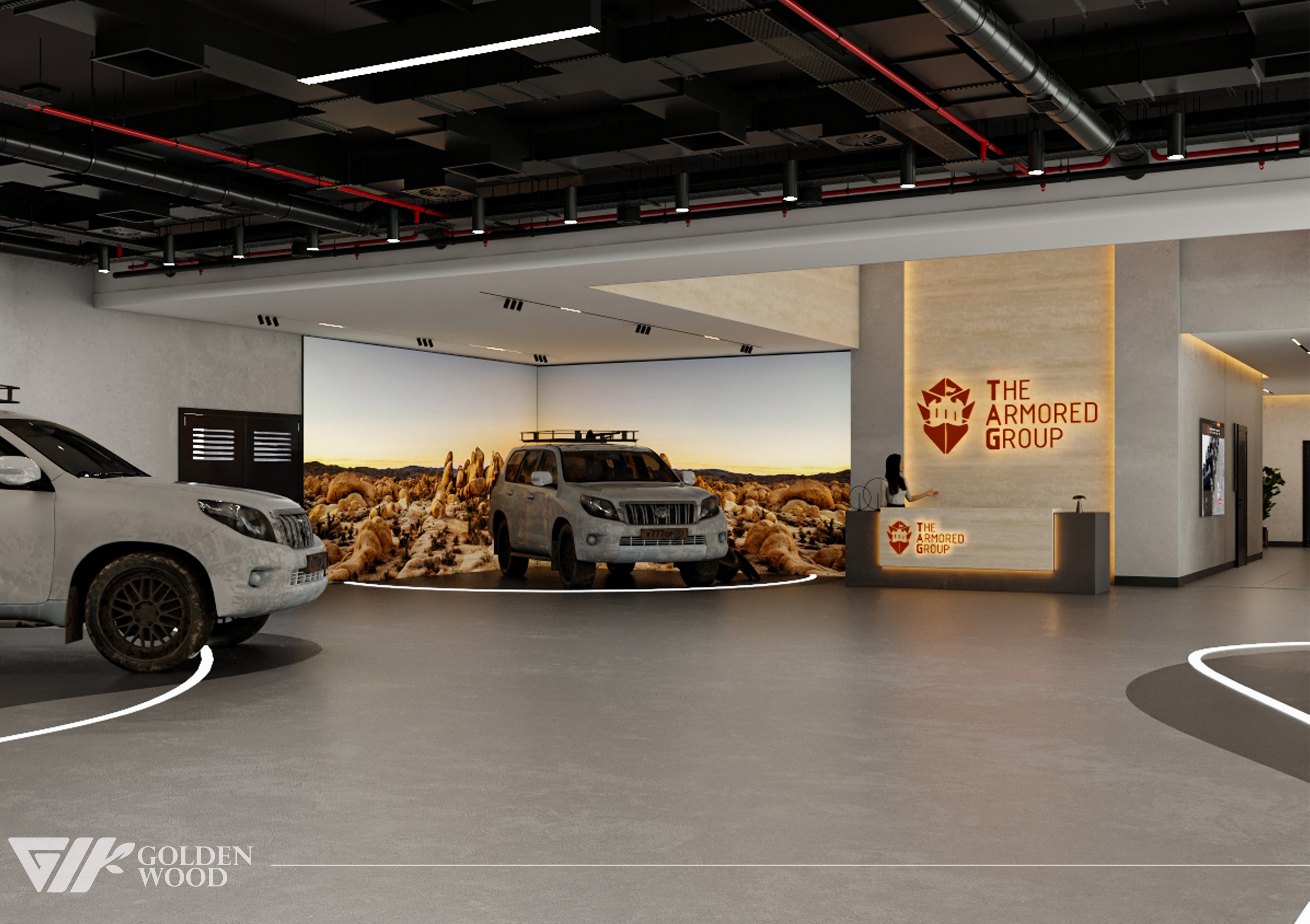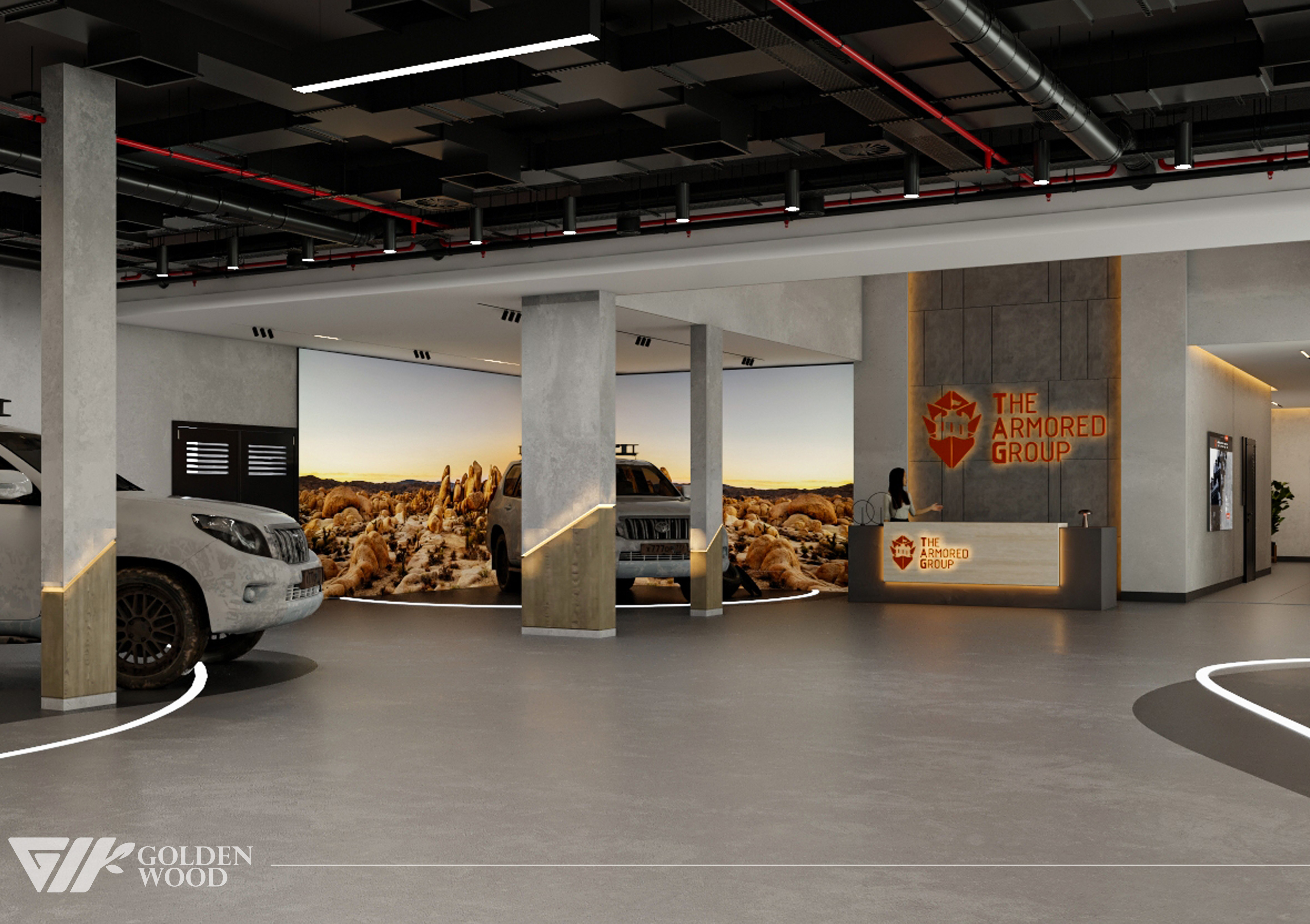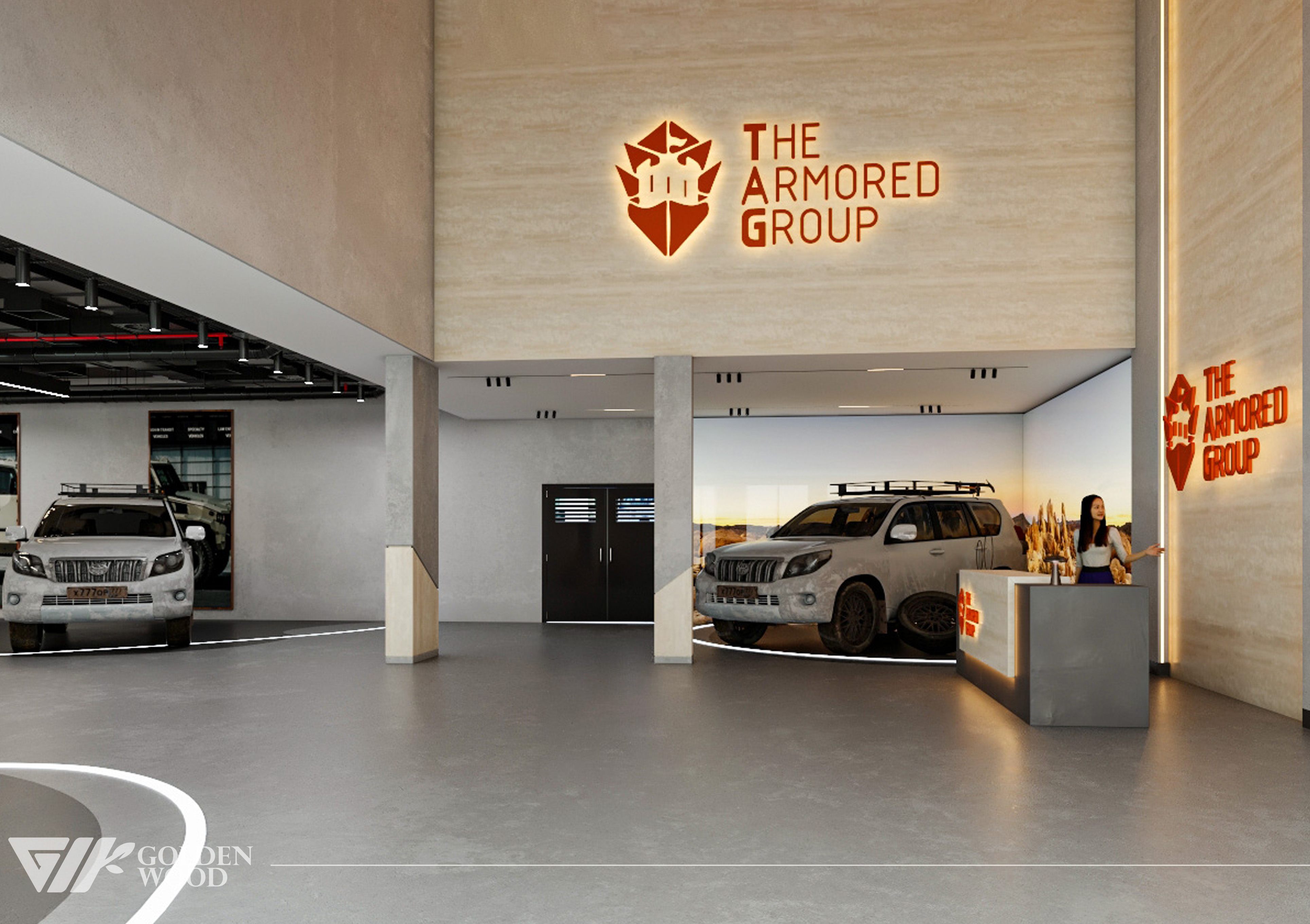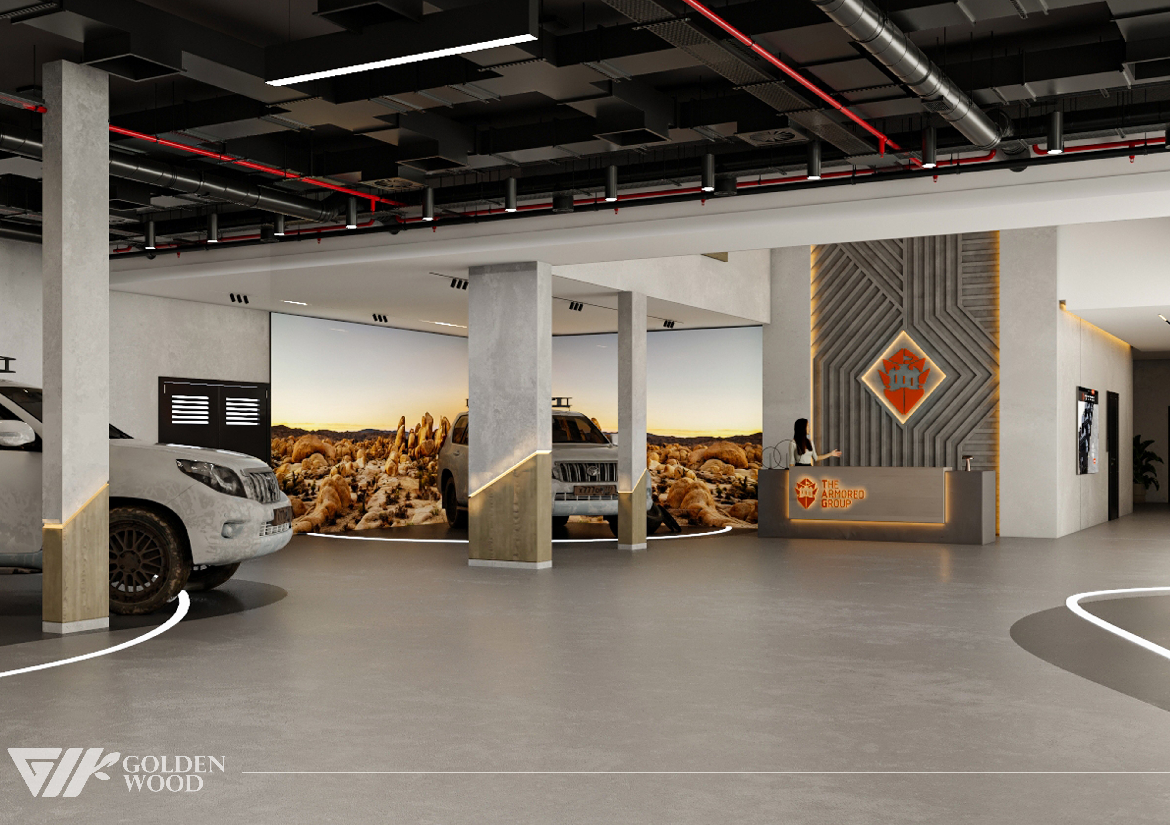 This project appears to showcase the interior design of a modern corporate office or reception area, featuring a blend of contemporary architecture and stylish furniture. The space incorporates sleek wood paneling with warm lighting, creating an inviting atmosphere. The use of neutral tones and natural materials, such as wood, adds sophistication. Additionally, the strategic placement of plants and minimalist décor elements brings balance and life to the environment. A notable feature is the decorative wall behind the reception desk, which includes an illuminated logo and geometric design, highlighting the company’s branding. Overall, the design blends modern aesthetics with functional elegance, suitable for a professional setting.