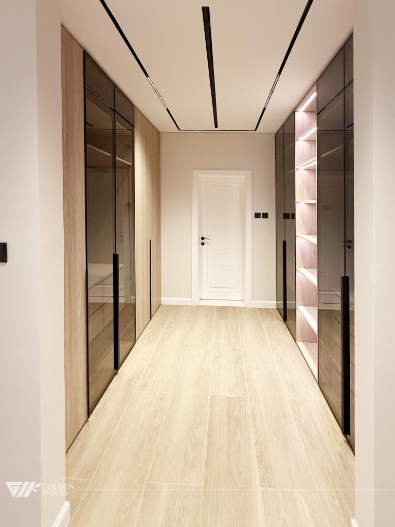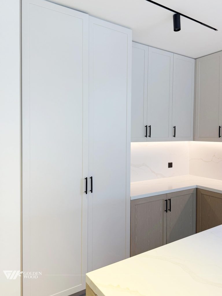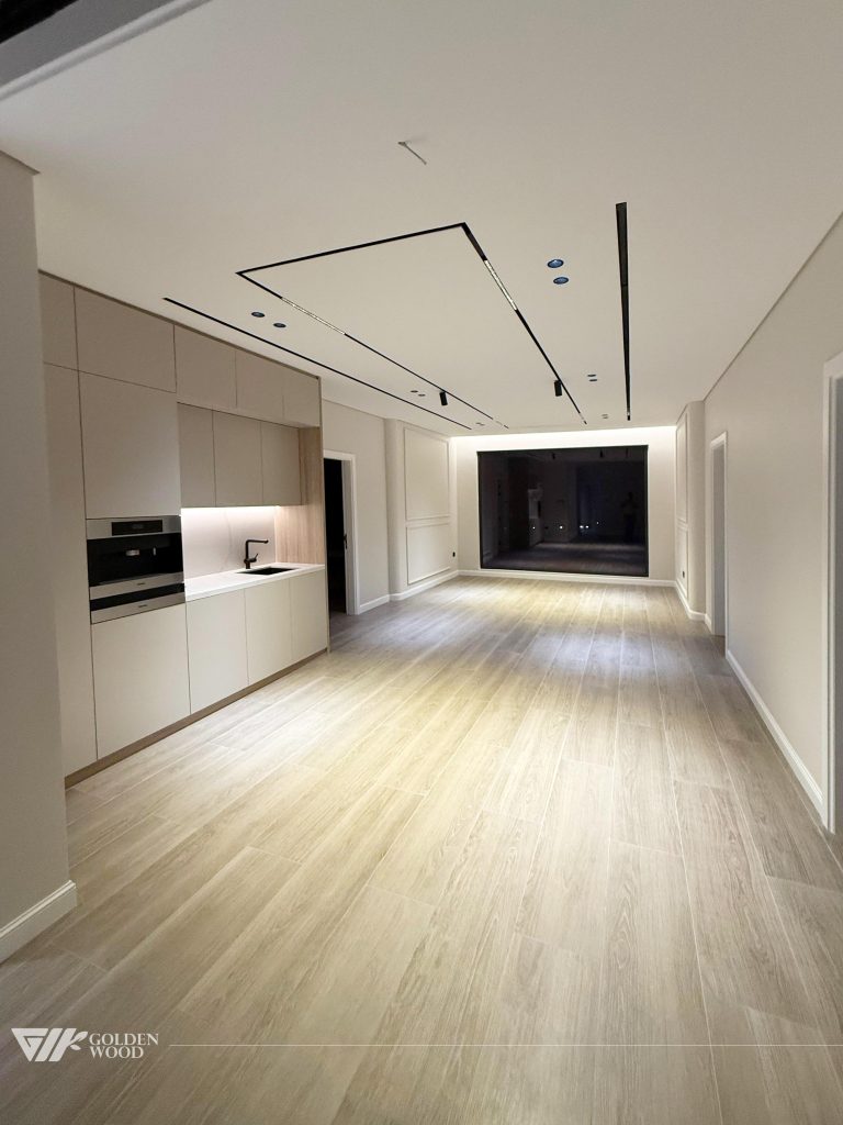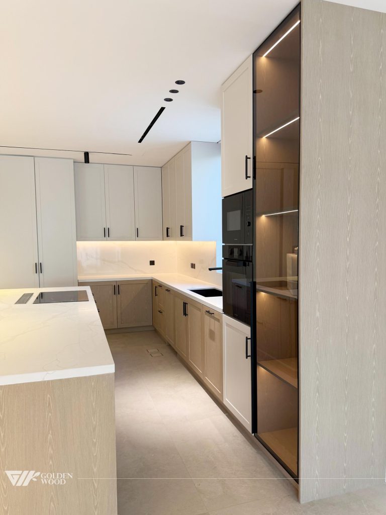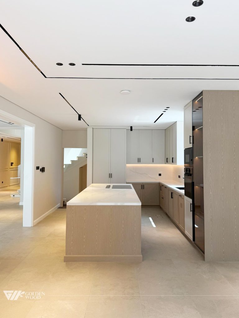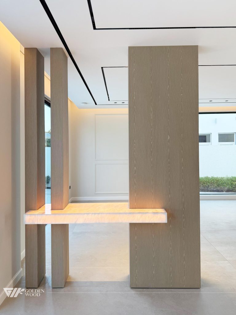 The entrance partition features a sculptural interplay of wood panels and an illuminated marble ledge, setting a tone of elegance and architectural precision. The open kitchen showcases bespoke cabinetry in muted oak tones, complemented by a sleek marble countertop island designed for both functionality and style. Integrated lighting and premium fixtures enhance the sense of modern minimalism.