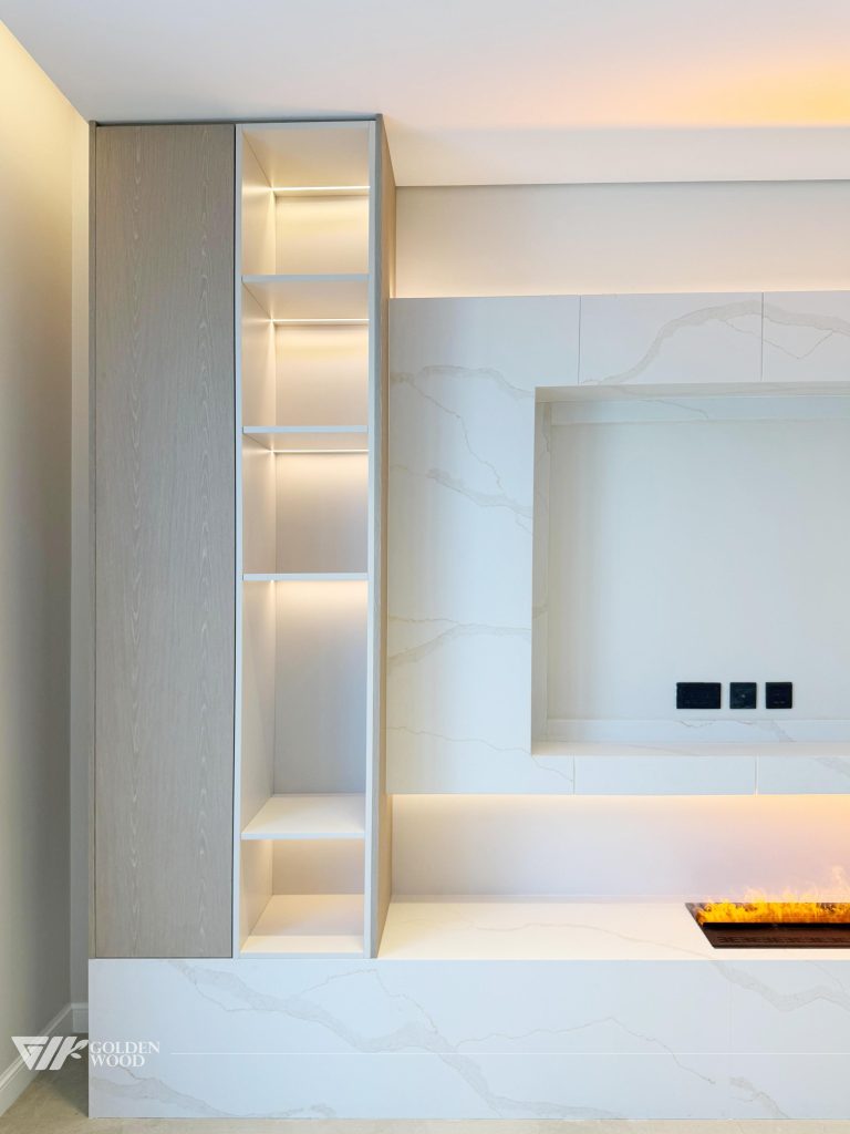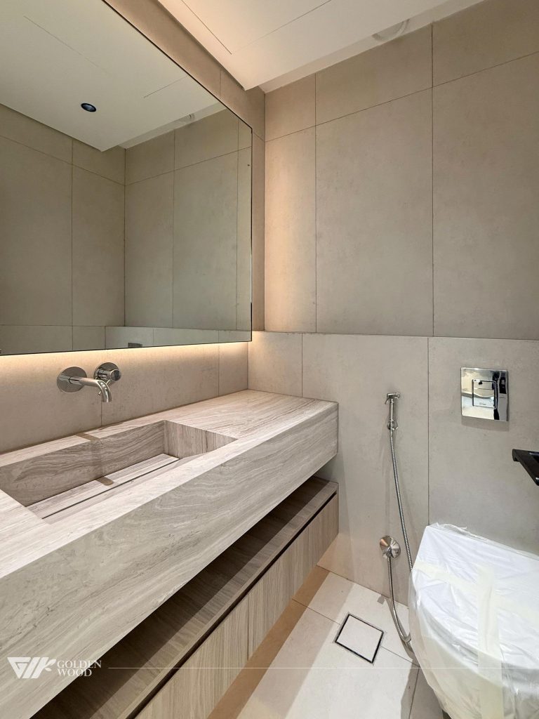 In the living area, a custom-built TV wall merges warm wood with veined marble surfaces, accentuated by subtle backlighting that creates depth and ambiance. The overall palette—soft neutrals, natural stone, and light wood—exudes warmth and tranquility while maintaining a clean, contemporary aesthetic.