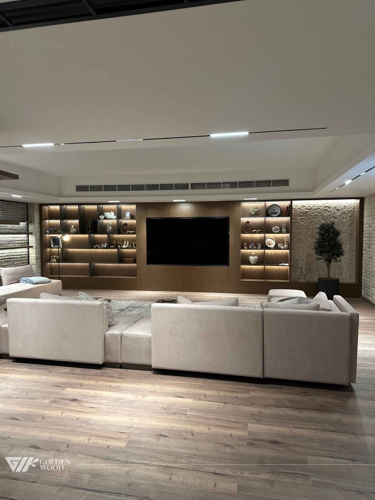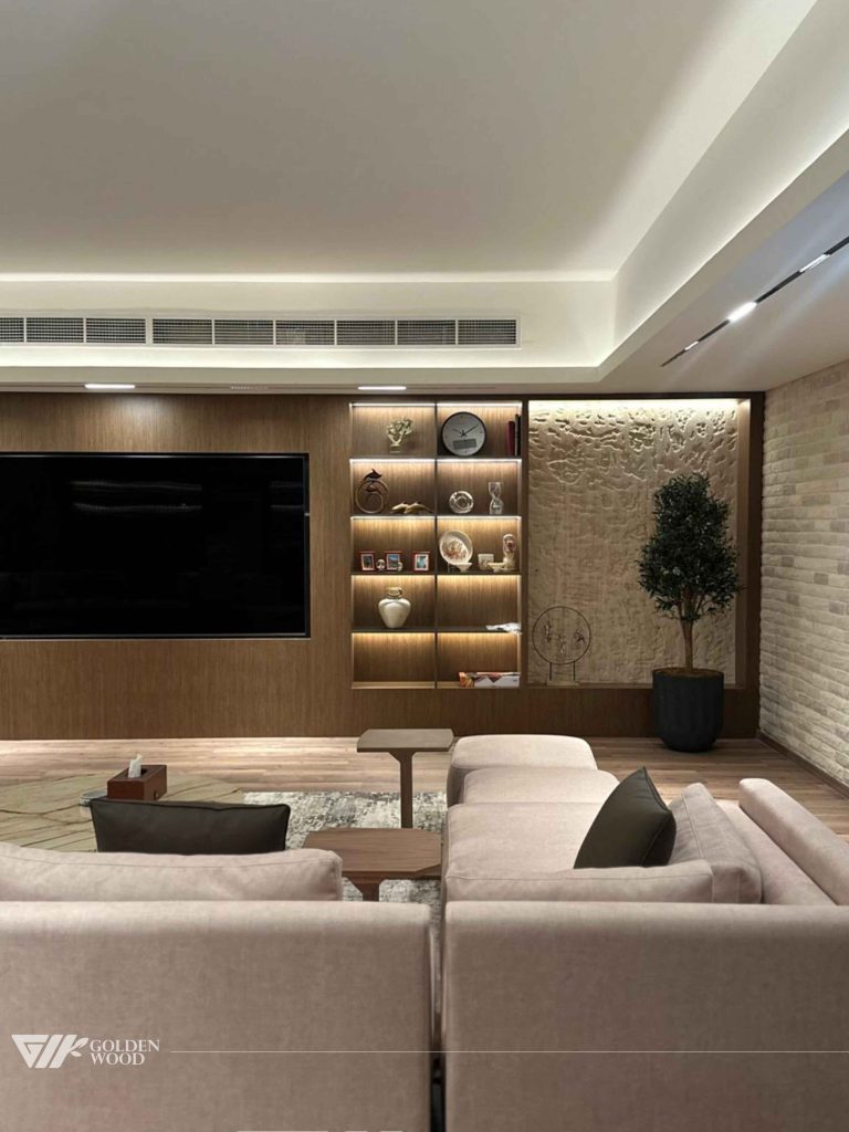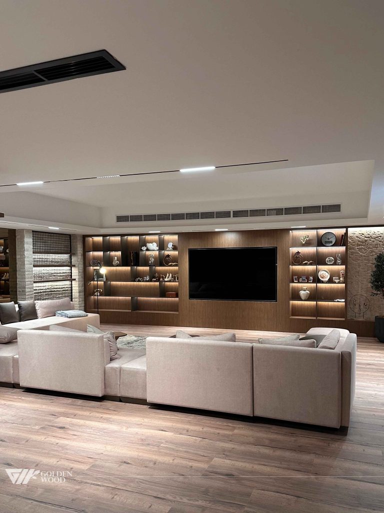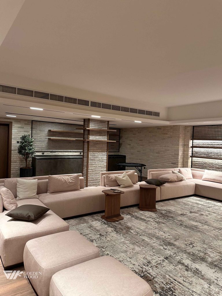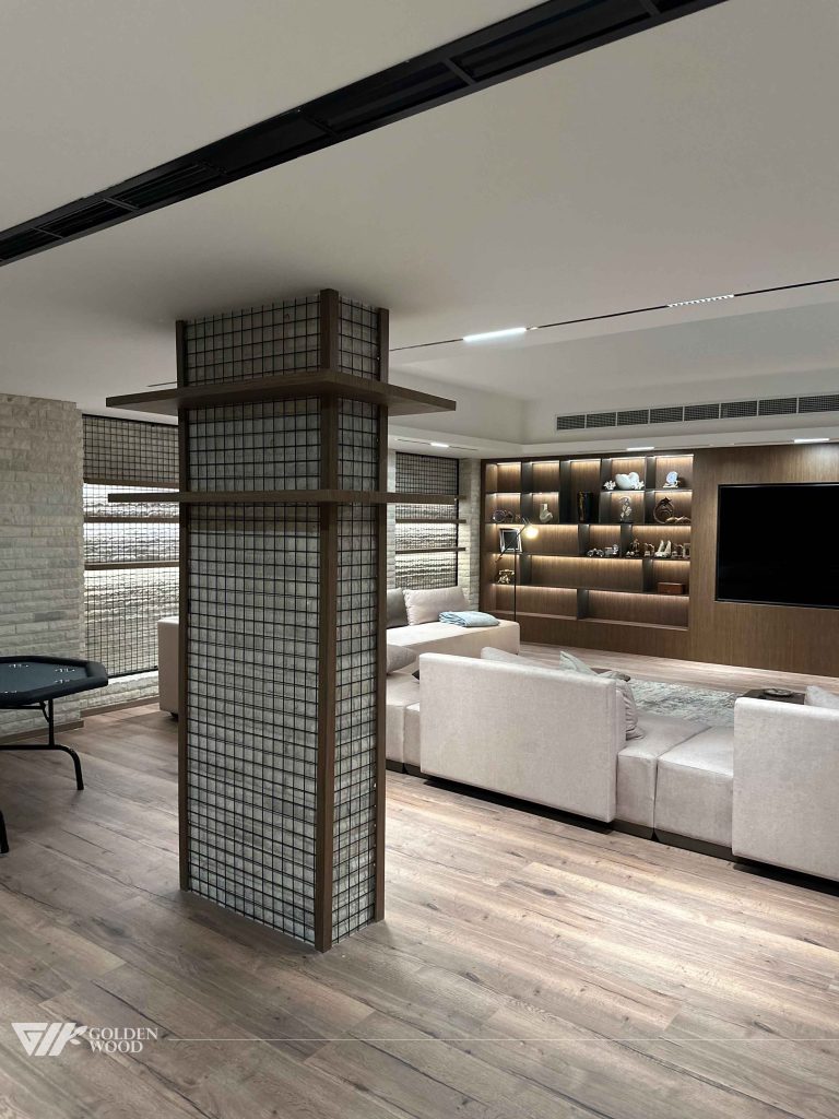 GW24-397 C41 Villa by Golden Wood is a stunning blend of modern design and natural textures, creating a refined, stylish living space. With a harmonious combination of stone, wood, and metal, the villa features sophisticated details like custom shelving units, contemporary lighting, and elegant wall textures. The open-plan living area, with its plush seating and warm tones, exudes comfort and luxury. Thoughtful design elements, such as the geometric patterns and sculptural decor, add artistic flair. The C41 Villa is a perfect example of Golden Wood’s commitment to creating elegant and functional spaces, offering a serene and sophisticated environment.